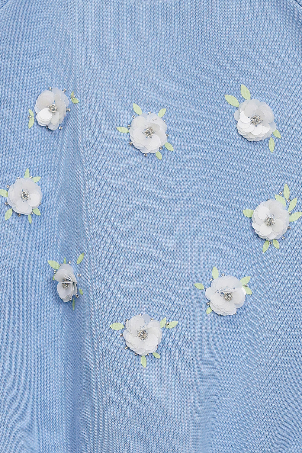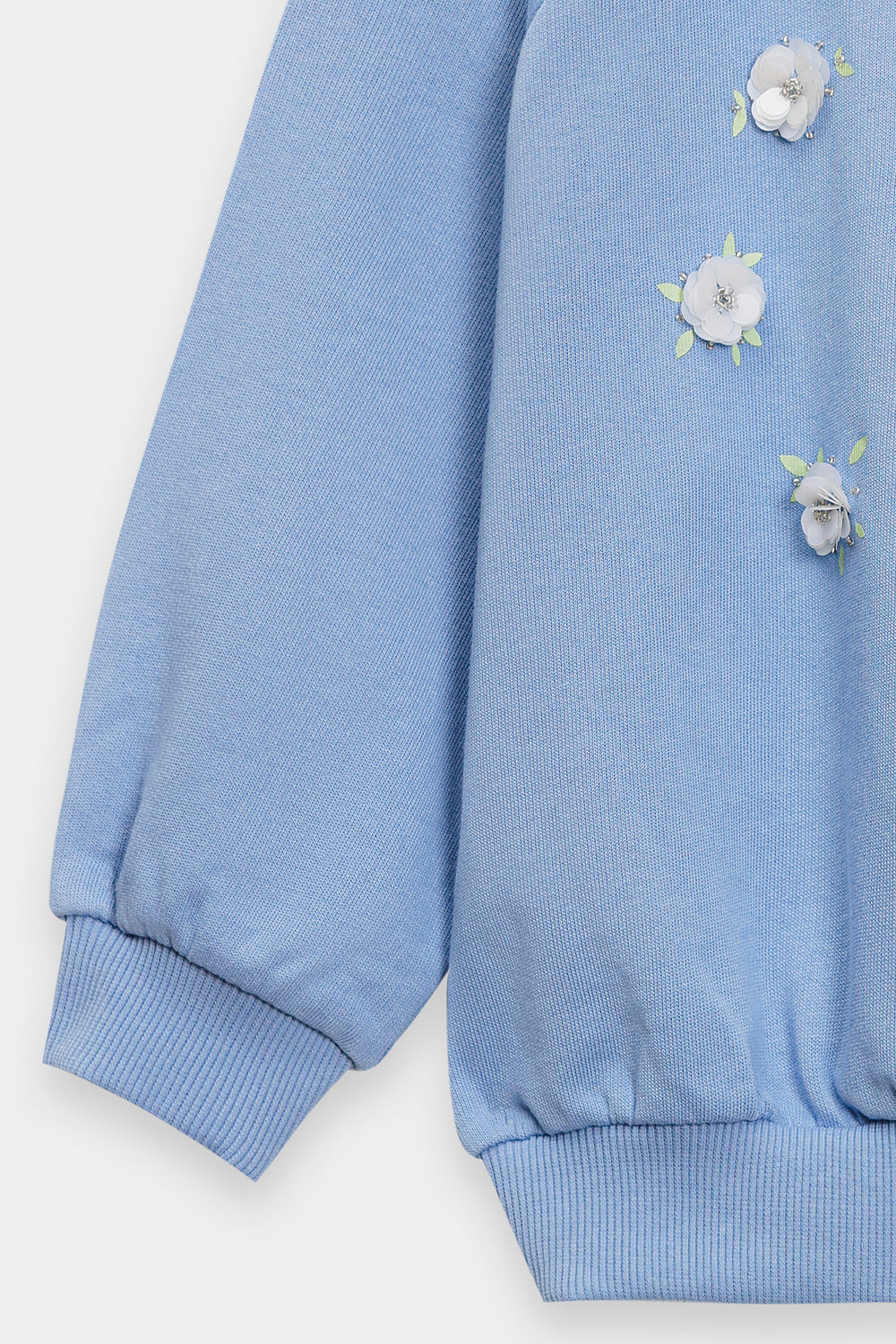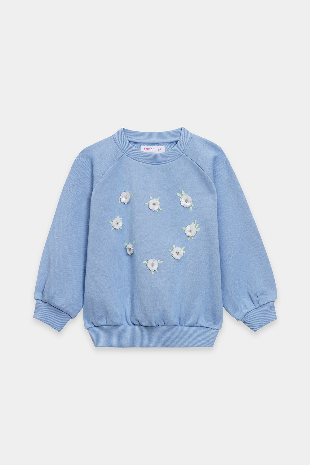 This charming light blue sweatshirt combines comfort with playful design details, making it perfect for young wearers. The front showcases delicate white daisy-shaped patches adorned with embroidered green centers, creating a cheerful, nature-inspired aesthetic. The crew neckline features subtle distressed detailing for added character, while the slightly gathered long sleeves offer a contemporary silhouette. Ribbed cuffs and hem provide a secure, finished fit. This piece delivers the cozy warmth ideal for casual everyday styling, effortlessly pairing with denim or other basics.