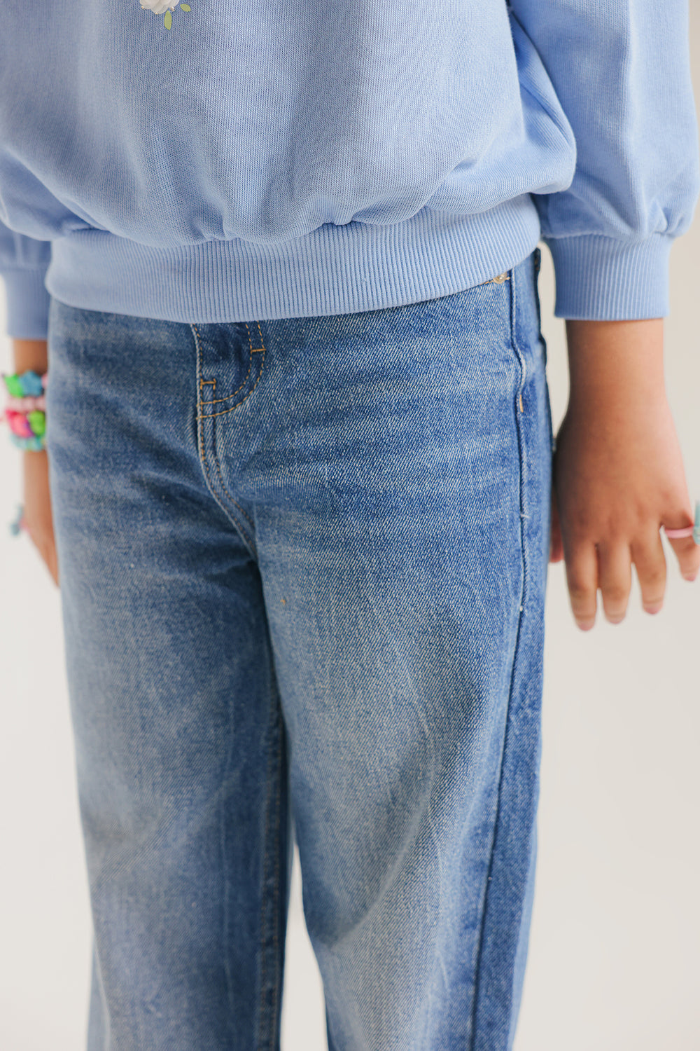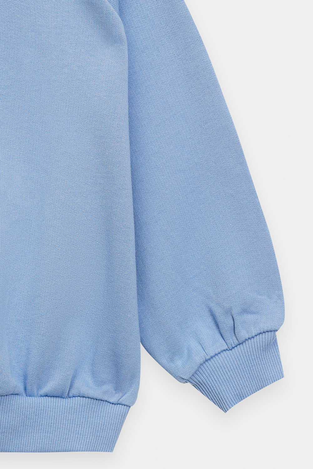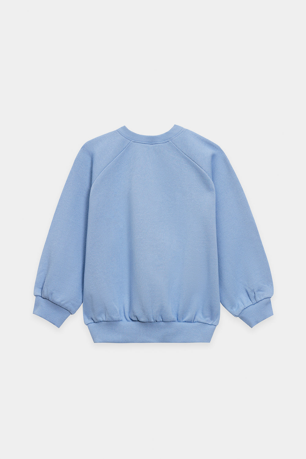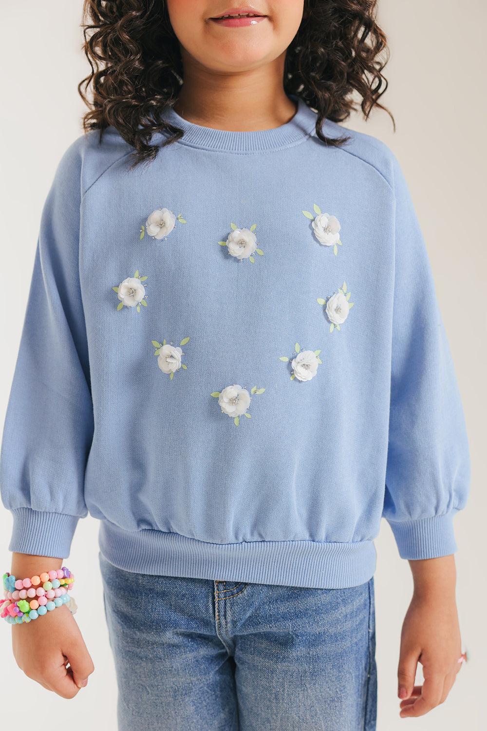 This charming light blue sweatshirt combines comfort with playful design details, making it perfect for young wearers. The front showcases delicate white daisy-shaped patches adorned with embroidered green centers, creating a cheerful, nature-inspired aesthetic. The crew neckline features subtle distressed detailing for added character, while the slightly gathered long sleeves offer a contemporary silhouette. Ribbed cuffs and hem provide a secure, finished fit. This piece delivers the cozy warmth ideal for casual everyday styling, effortlessly pairing with denim or other basics.