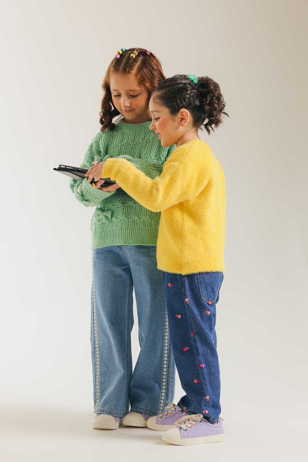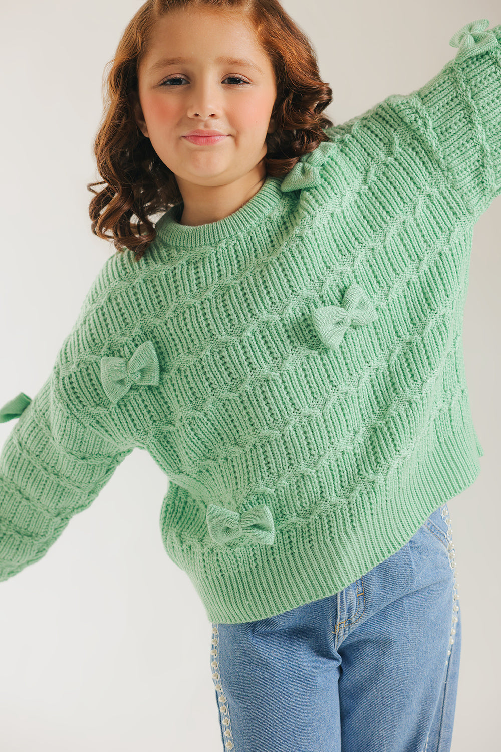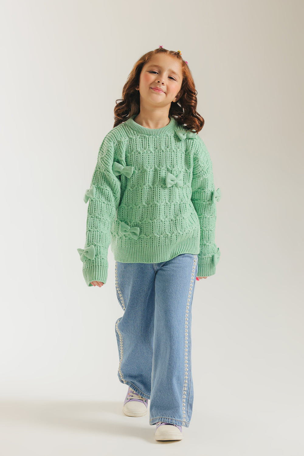 Embrace cozy chic with this delightful mint green sweater. The soft, chunky knit features a beautiful honeycomb texture and is playfully adorned with charming mint green bows along the sleeves and front. With its relaxed fit, crew neckline, and whimsical embellishments, this sweater is the perfect statement piece to layer over jeans for a warm and stylish look.