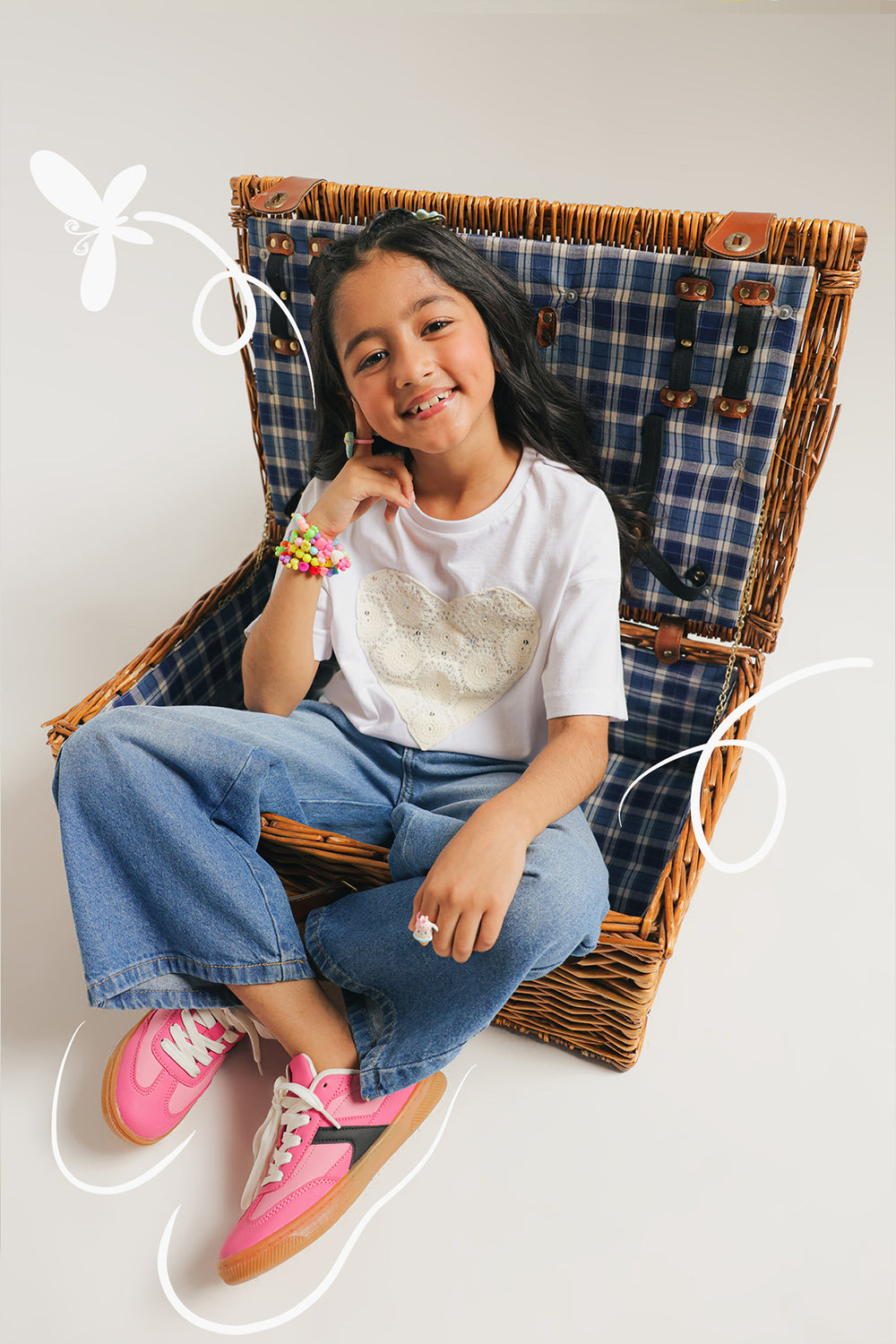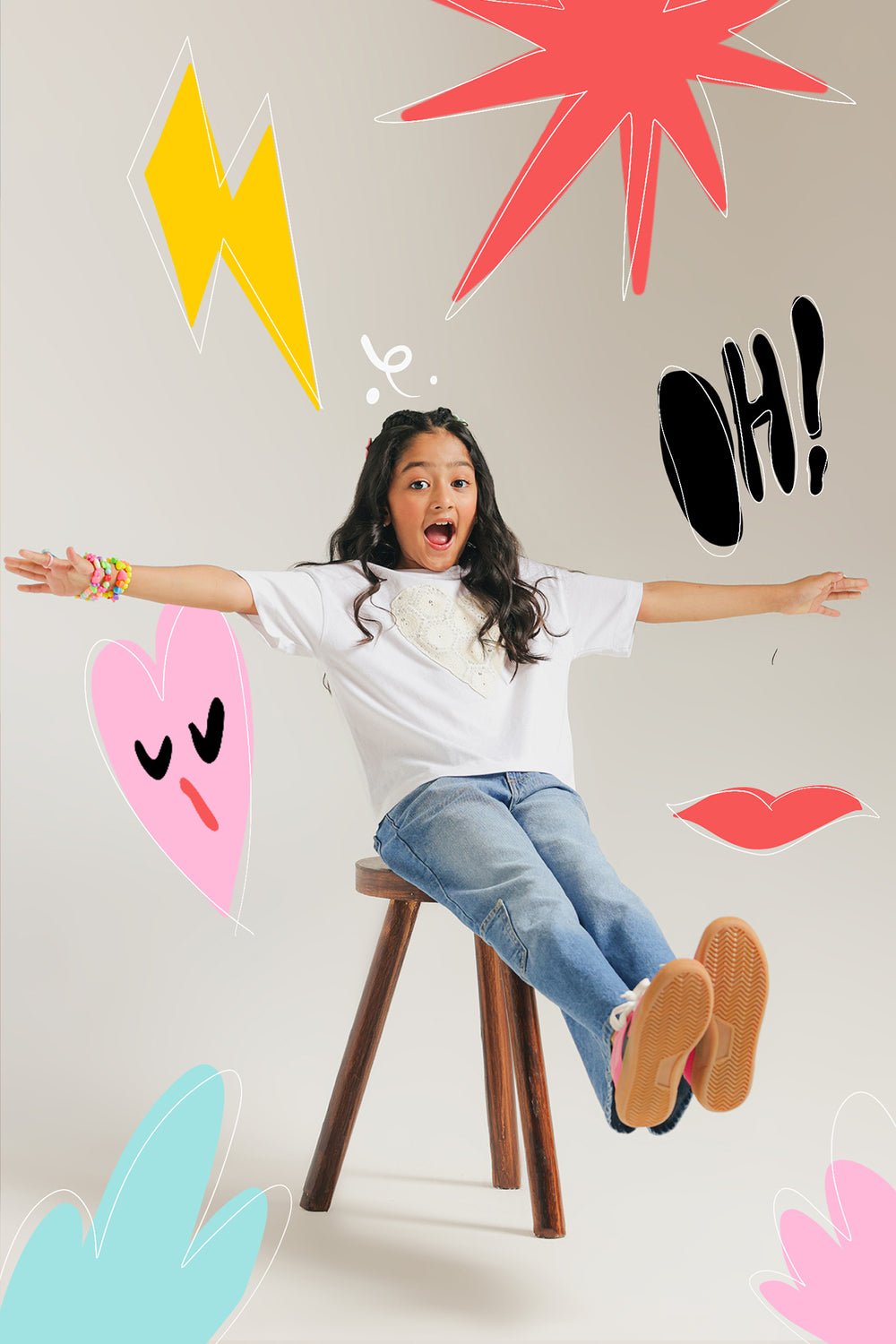 Make her shine in this playful white T-shirt! The star of the show is a stunning, intricately crocheted heart that adds a touch of sparkle. Made from soft, comfortable fabric, this top is perfect for a day of fun, whether she's heading to school or a party. Pair it with jeans, skirts, or shorts for a look that's as unique as she is.