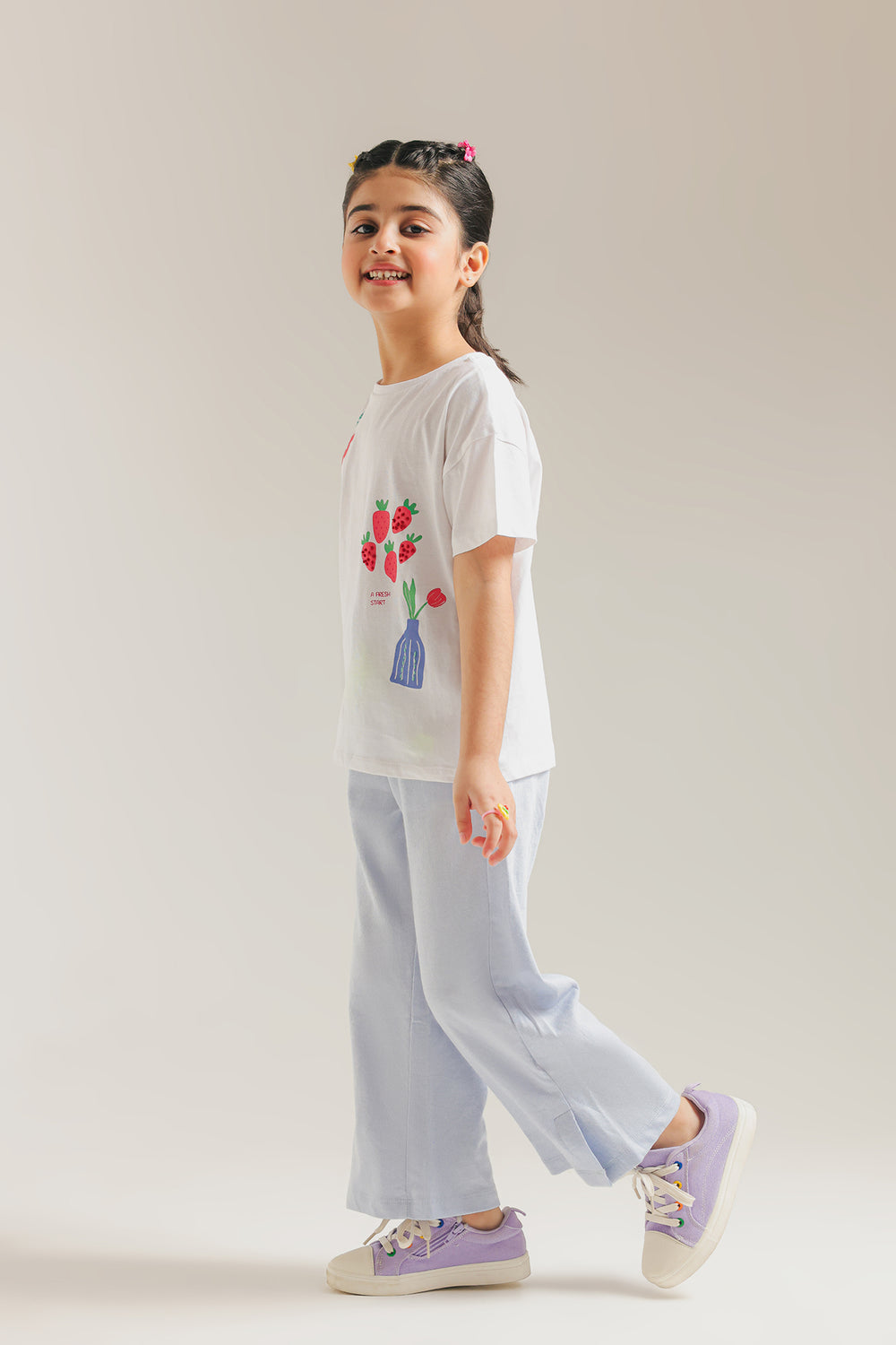 This cheerful white top is a perfect blend of comfort and playful style. The relaxed, short-sleeved t-shirt features a vibrant and charming print of hand-drawn fruits, flowers, and other whimsical doodles, making this top a fun and delightful staple for any child's casual wardrobe.