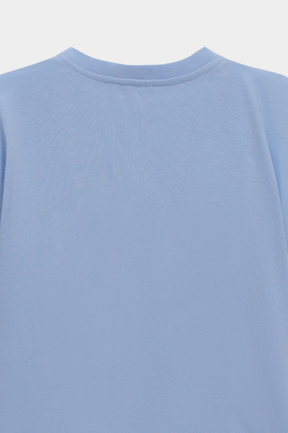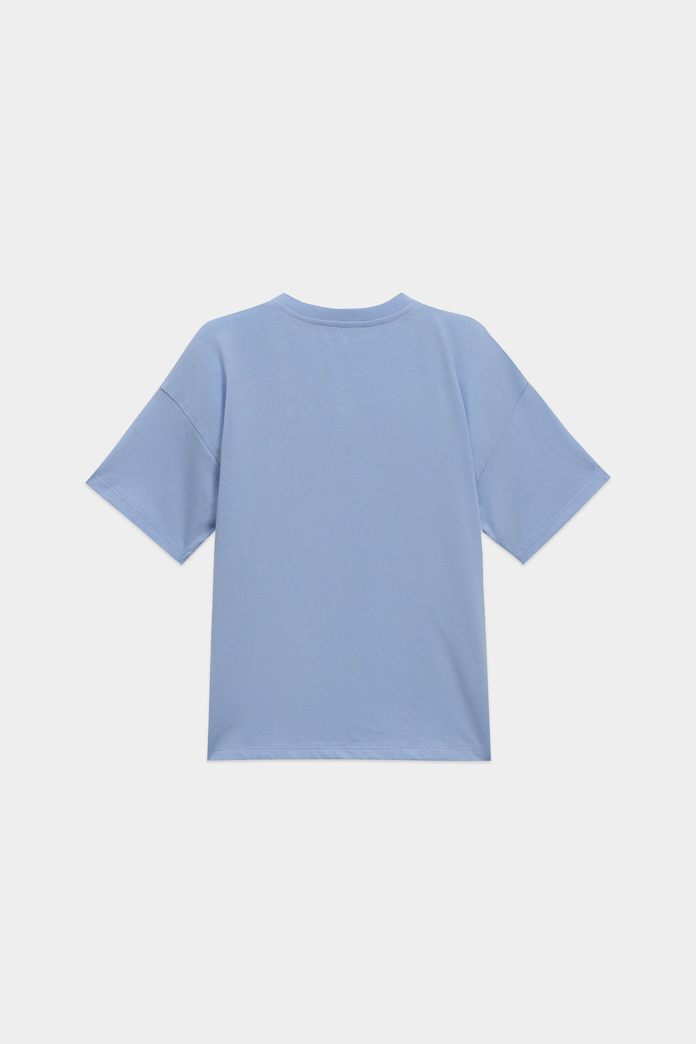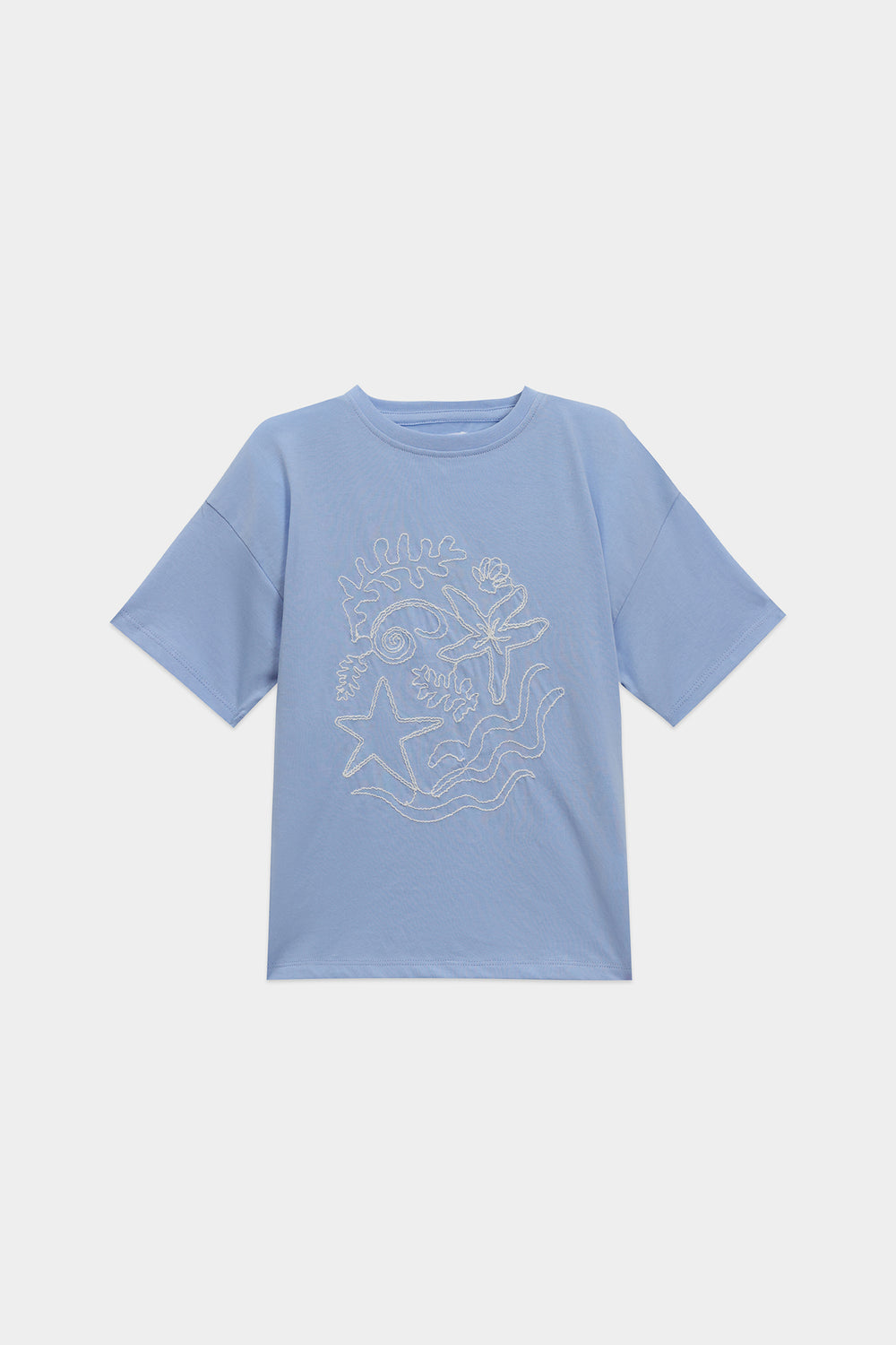 Brighten your casual wardrobe with this playful and artistic top. This comfortable, relaxed-fit T-shirt is crafted in a soft periwinkle blue fabric. It features a unique, embroidered design on the front, showcasing abstract nautical and organic motifs in a thin white cream thread. The overall effect is a subtle yet stylish graphic that adds character to the classic crew neck and short sleeve silhouette.