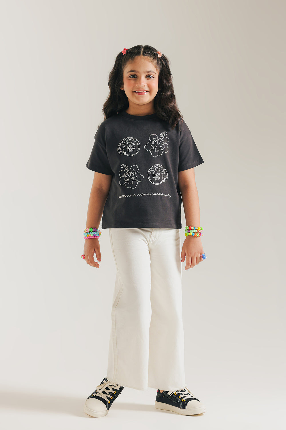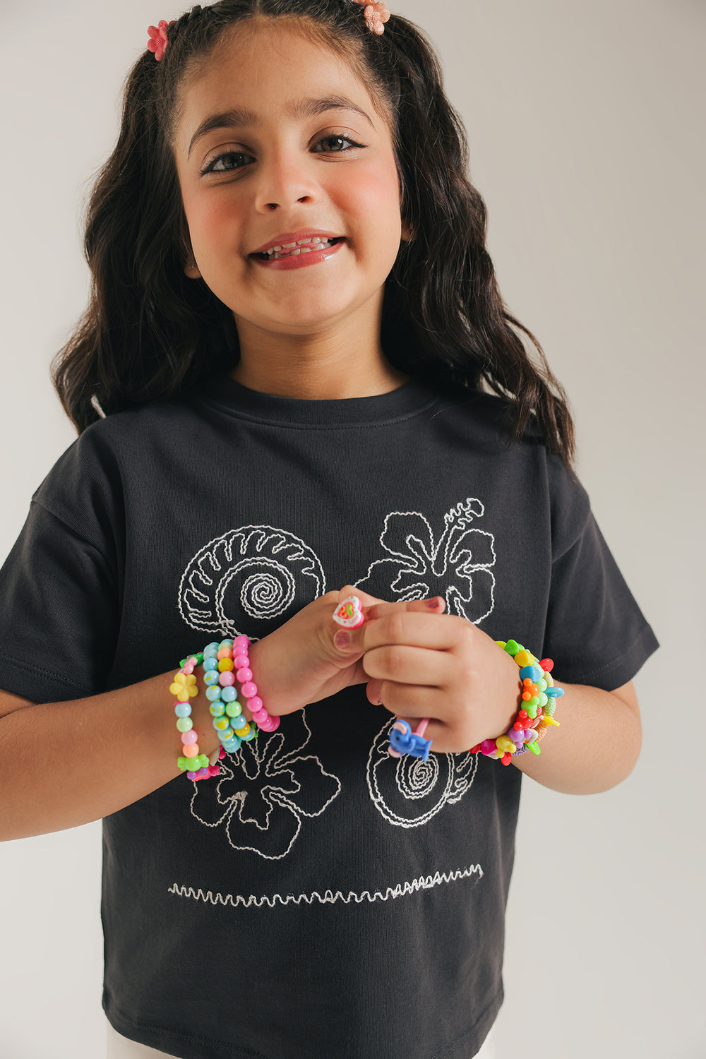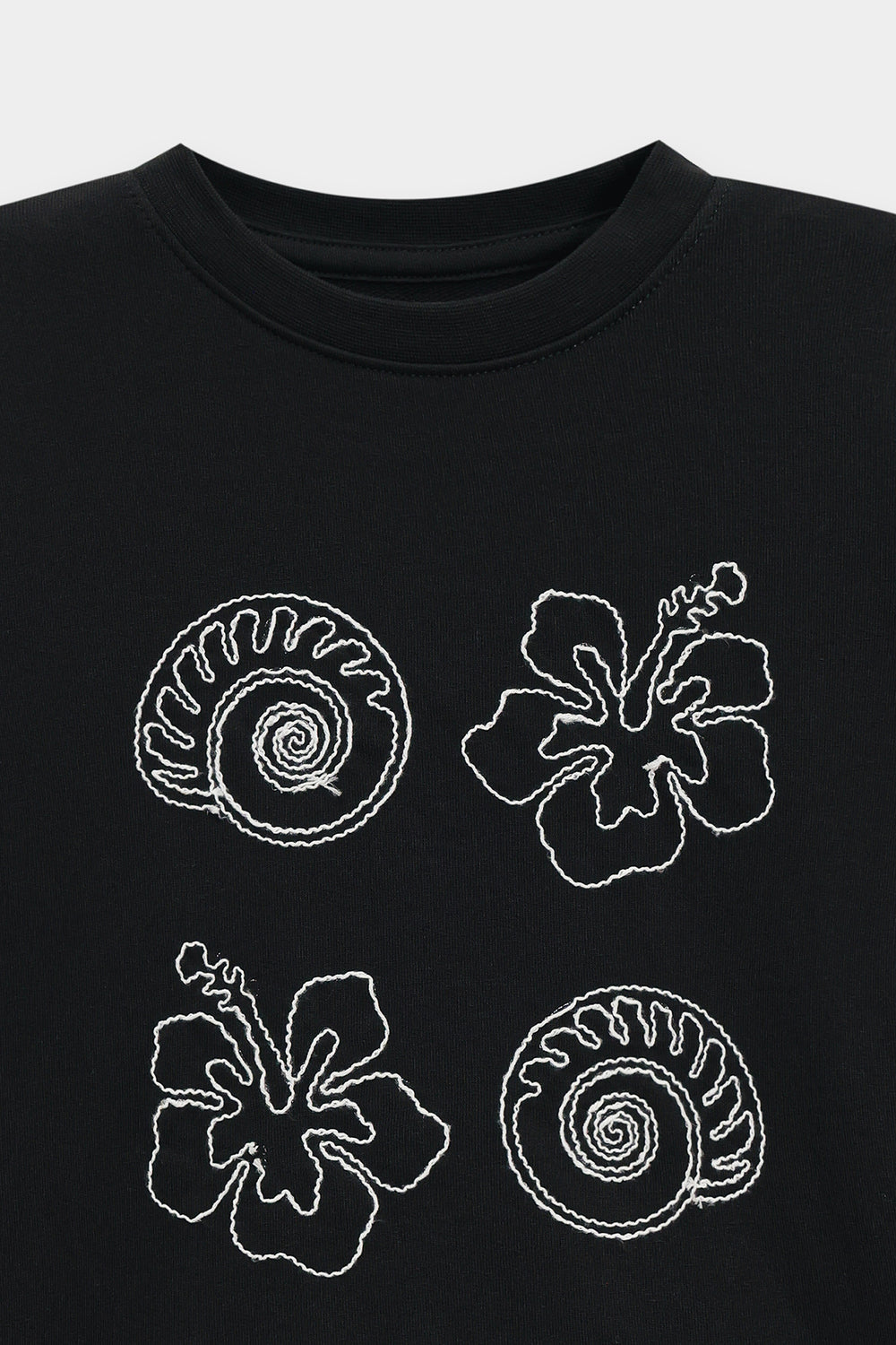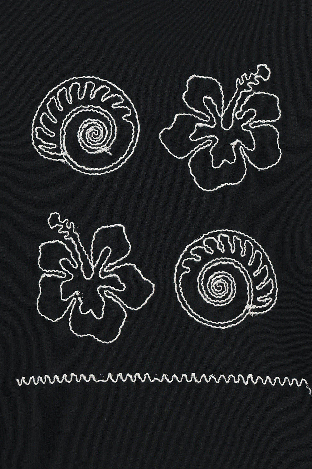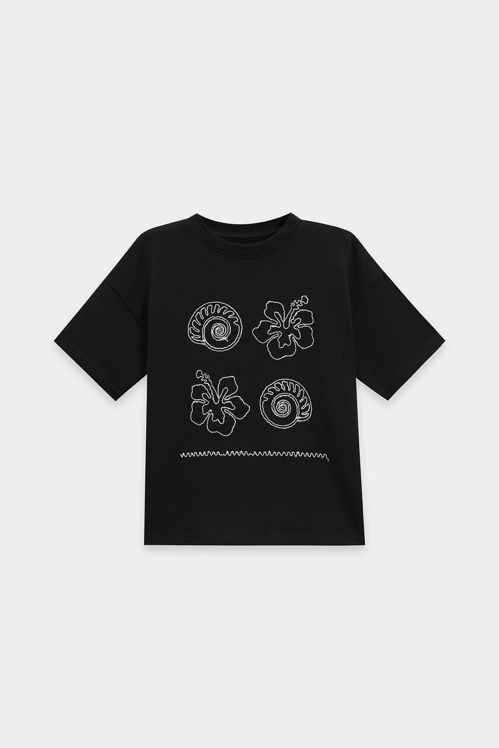 Brighten your casual wardrobe with this playful and artistic top. This comfortable, relaxed-fit T-shirt is crafted in a classic anthracite grey fabric. It features a unique, embroidered design on the front, showcasing abstract nautical and organic motifs in a thin white cream thread. The overall effect is a subtle yet stylish graphic that adds character to the classic crew neck and short sleeve silhouette.