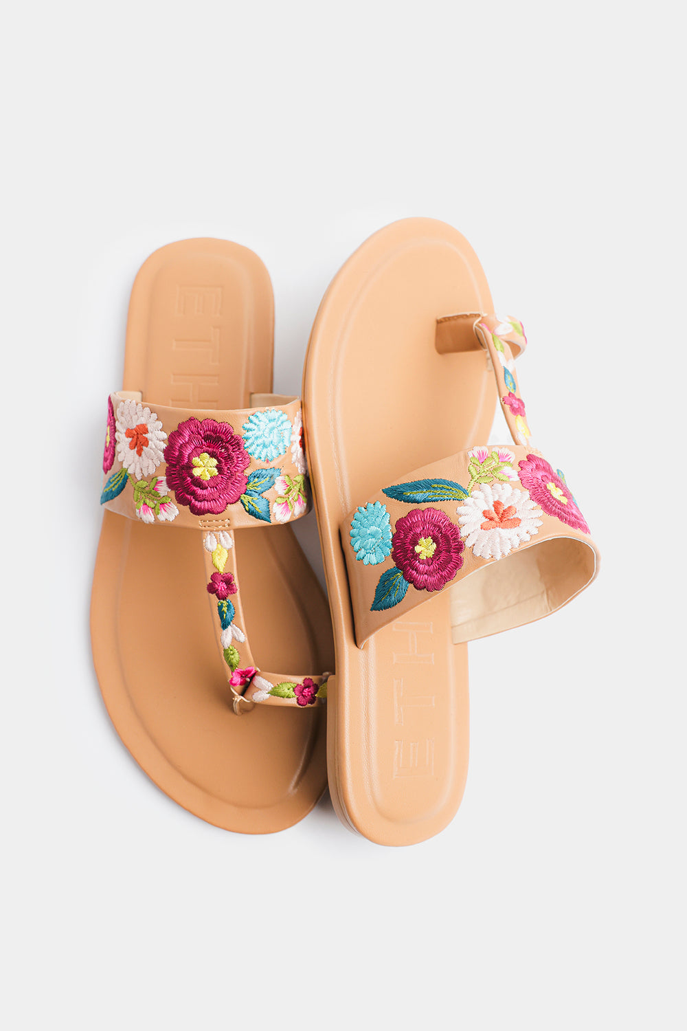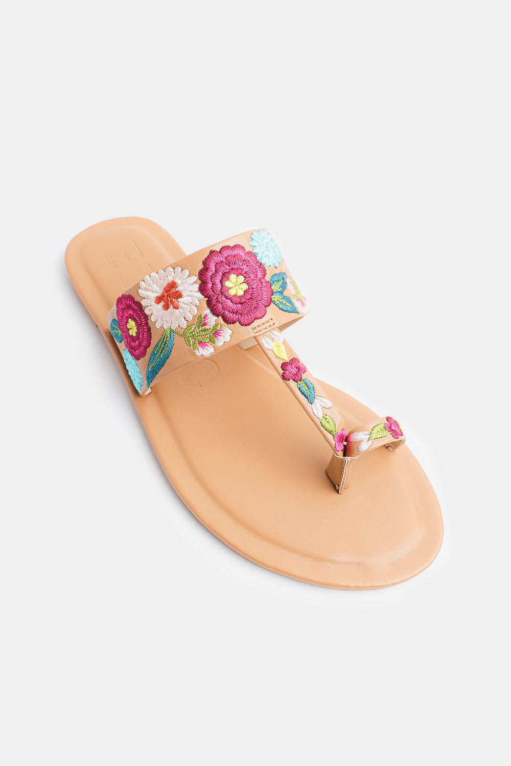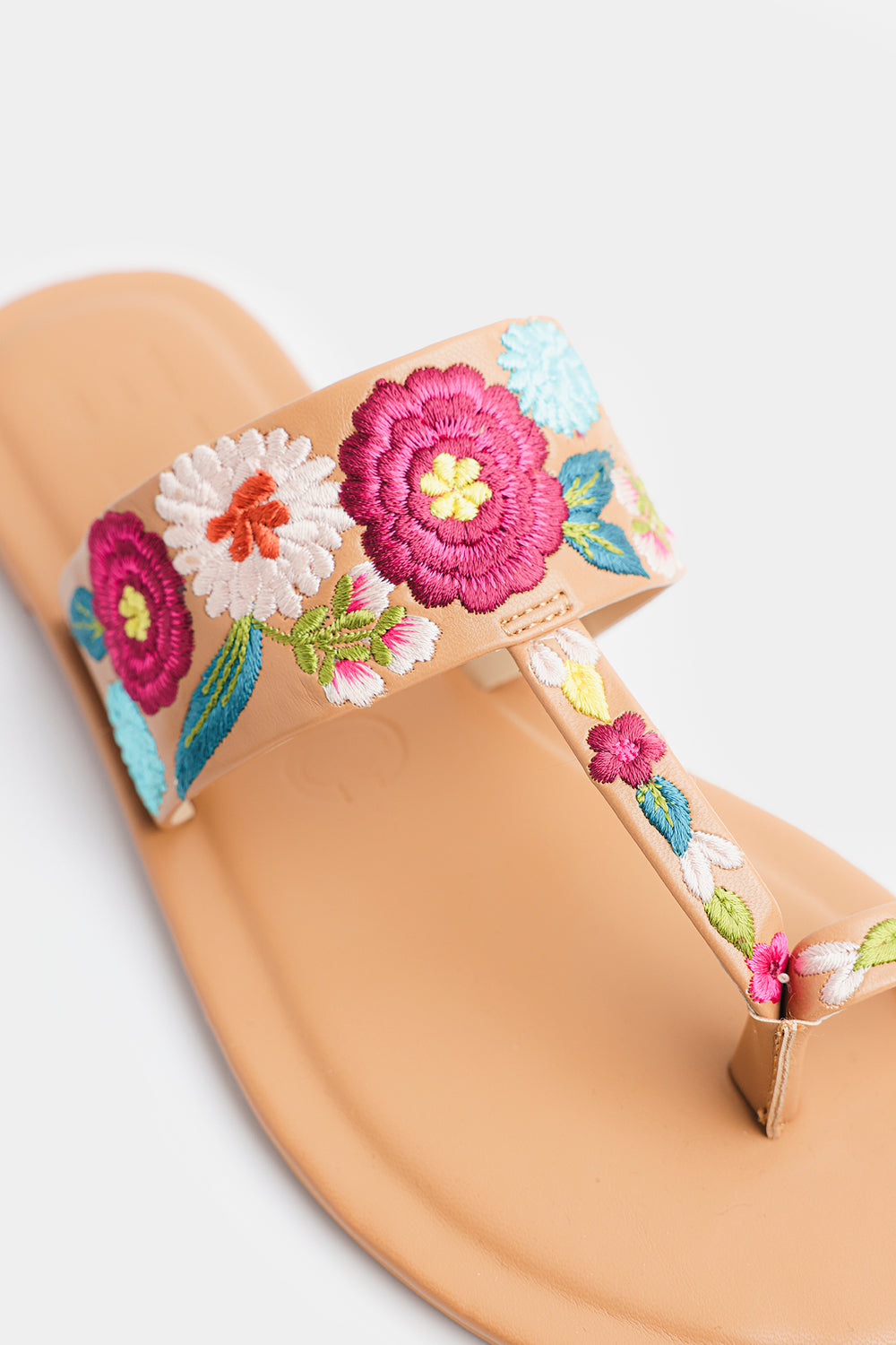 Step into effortless elegance with these beautifully crafted floral-embroidered sandals. Designed in a warm tan hue, this pair features a soft, cushioned sole for all-day comfort and a stylish toe-post silhouette for a secure fit. The wide strap is adorned with vibrant multicolor floral embroidery, adding a fresh, feminine charm to your everyday look. Perfect for casual outings, summer days, or pairing with both eastern and western wear, these sandals blend comfort with eye-catching style.