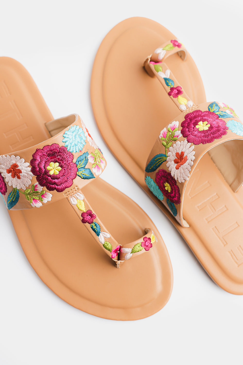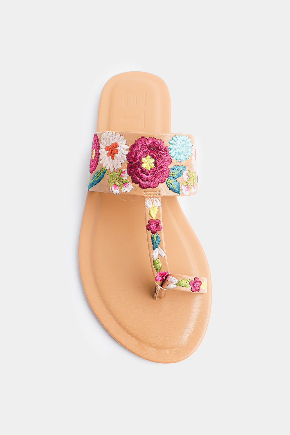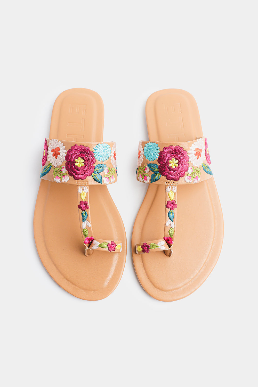Step into effortless elegance with these beautifully crafted floral-embroidered sandals. Designed in a warm tan hue, this pair features a soft, cushioned sole for all-day comfort and a stylish toe-post silhouette for a secure fit. The wide strap is adorned with vibrant multicolor floral embroidery, adding a fresh, feminine charm to your everyday look. Perfect for casual outings, summer days, or pairing with both eastern and western wear, these sandals blend comfort with eye-catching style.