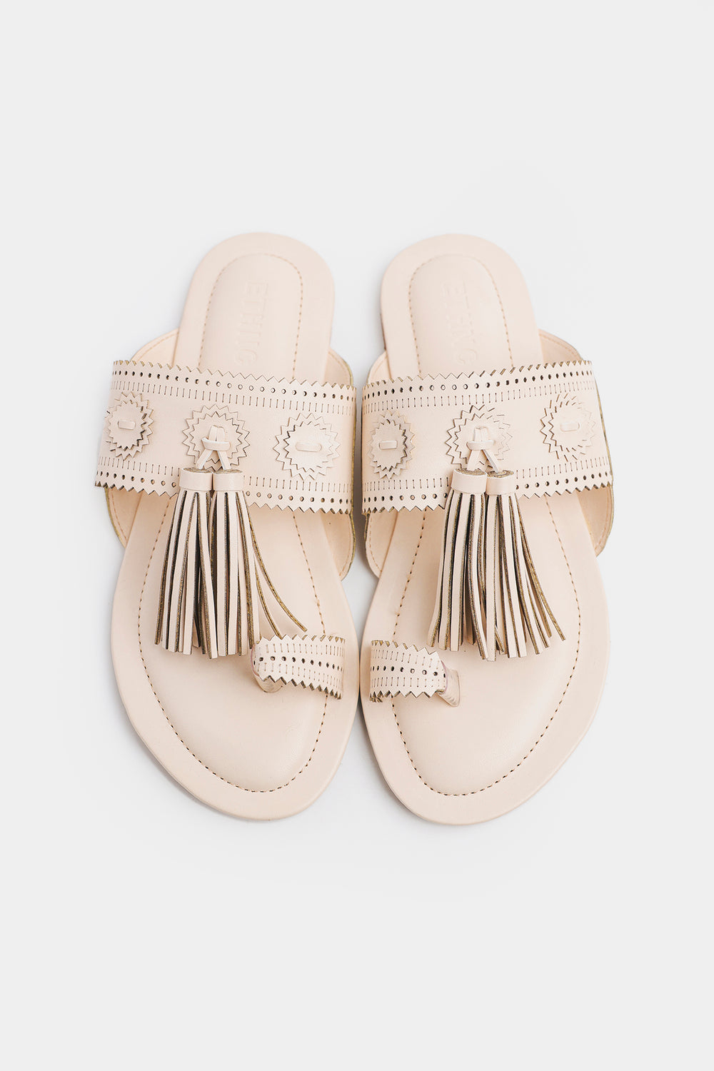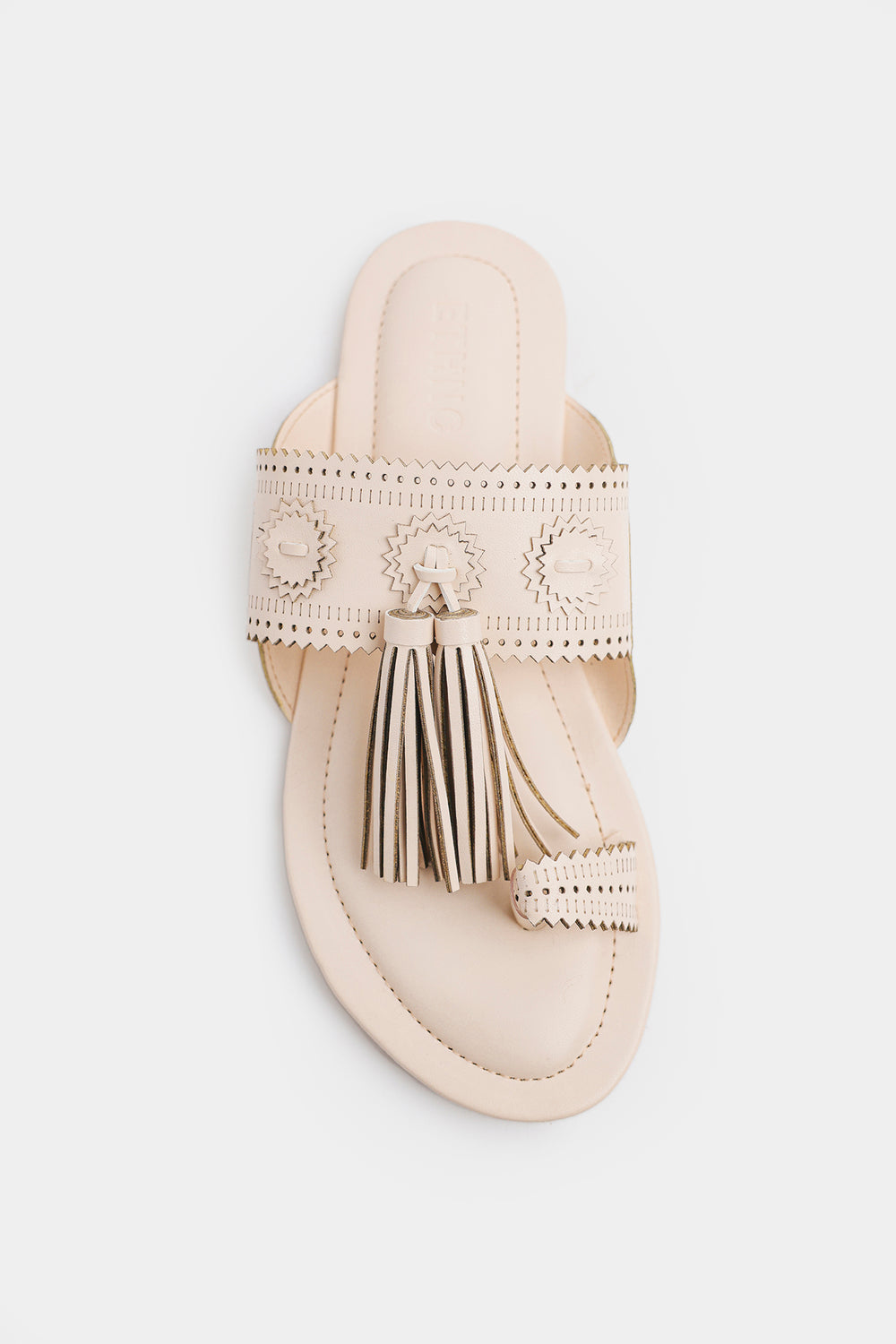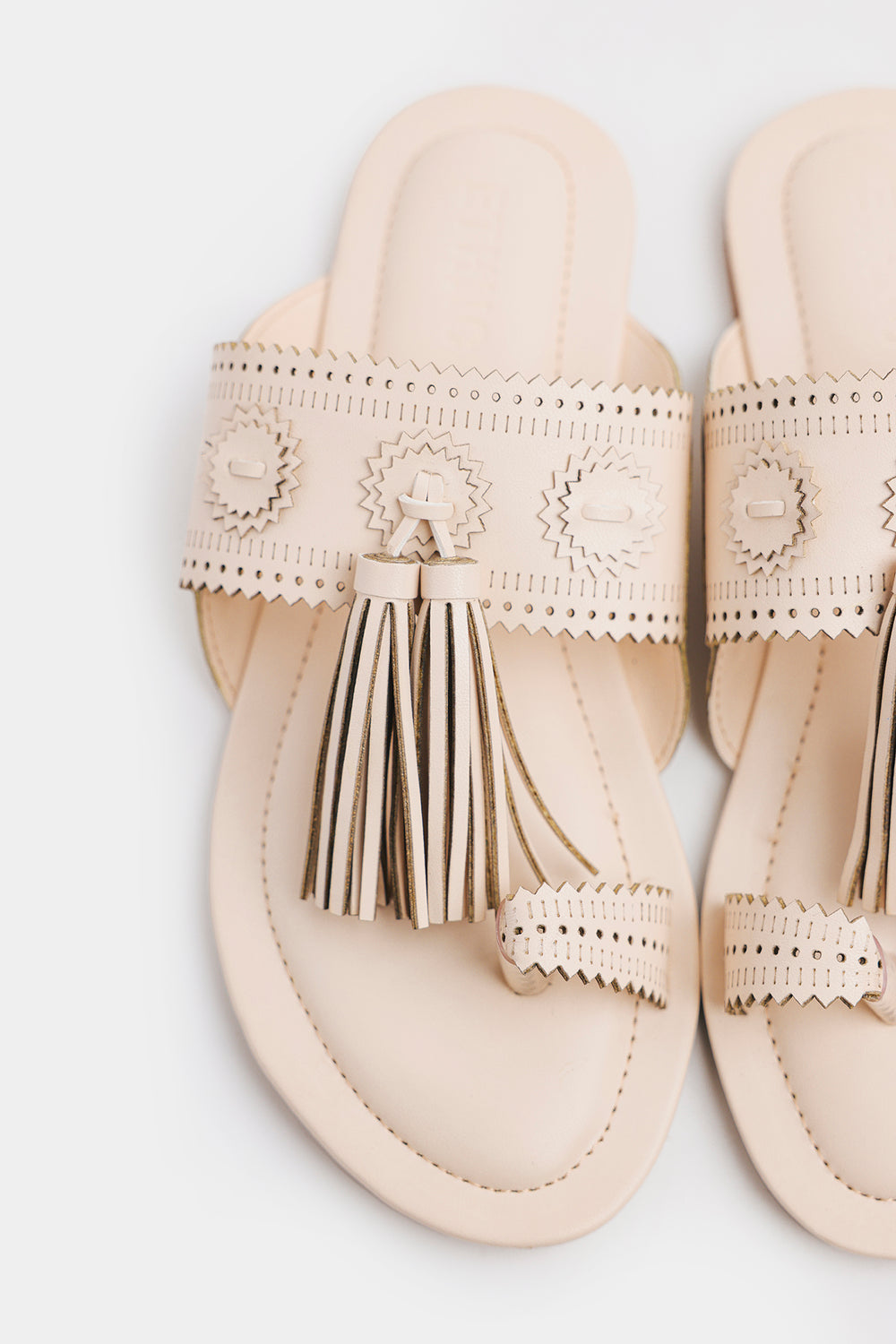 Discover the artistry of traditional craftsmanship with Khola Puri. This distinctive design features intricate laser-cut perforations and scalloped edges on the wide strap and toe loop, echoing time-honored hand-punched leatherwork techniques. The vamp is adorned with oversized dual tassels suspended from embroidered circular motifs, infusing the silhouette with character and cultural charm. A perfect blend of heritage aesthetics and contemporary comfort.