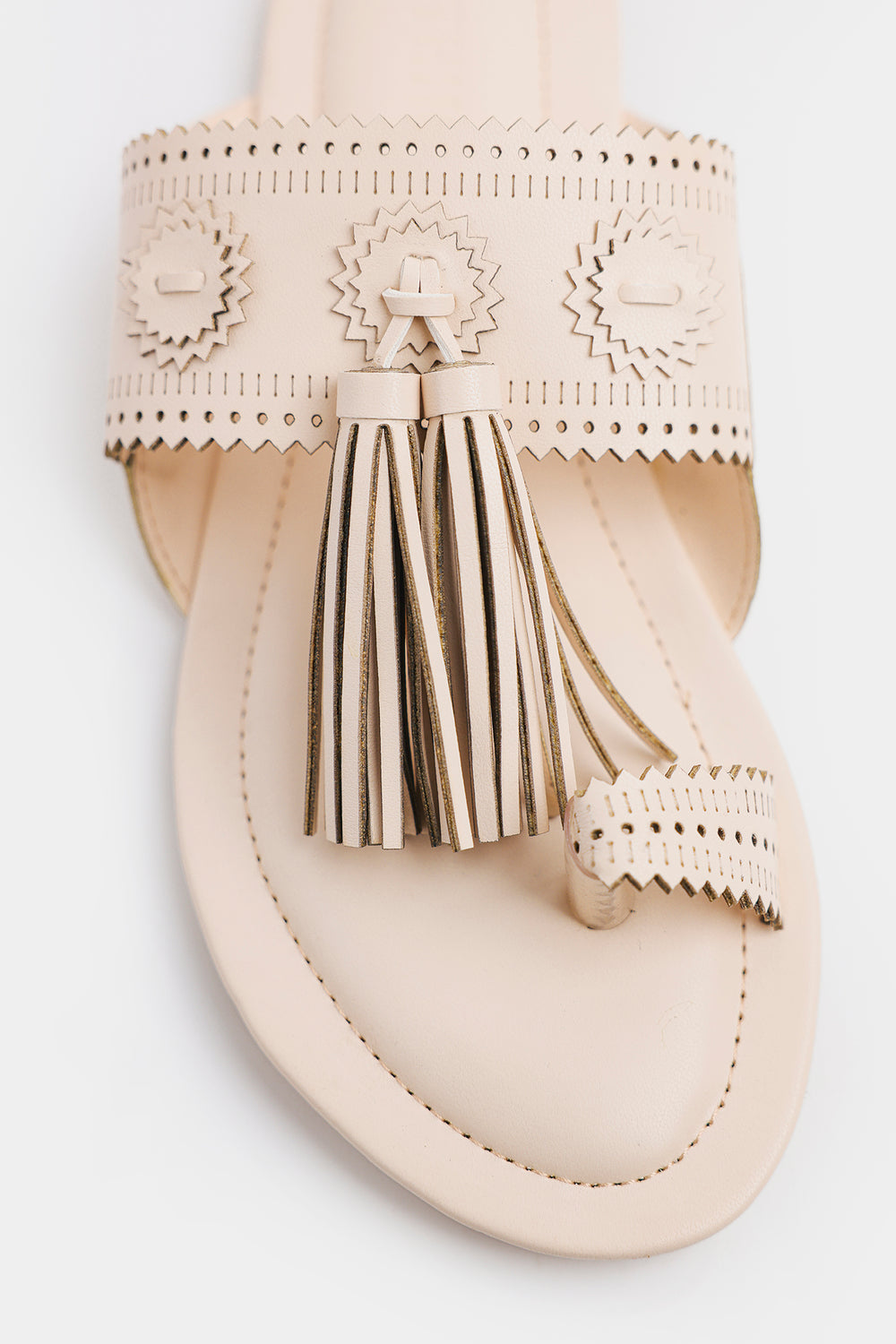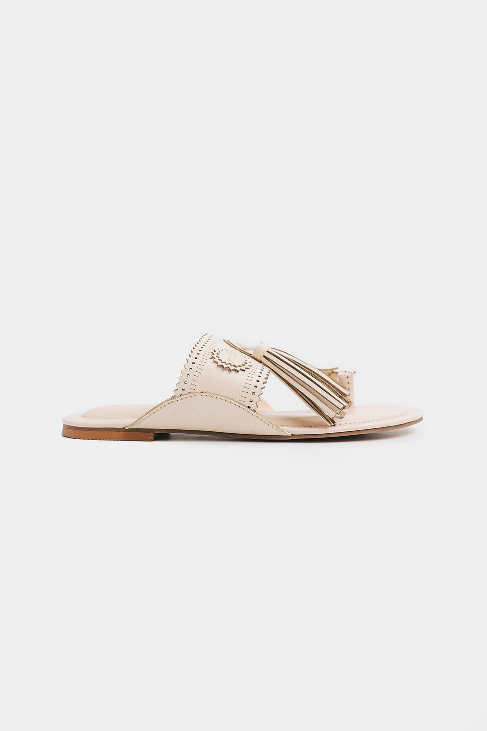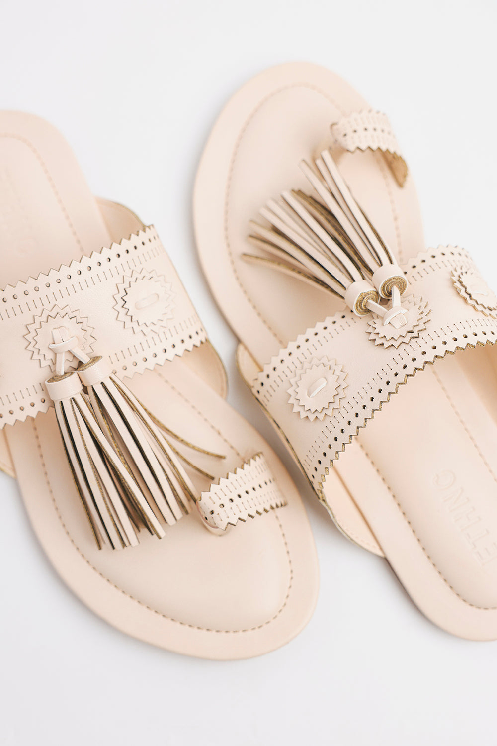 Discover the artistry of traditional craftsmanship with Khola Puri. This distinctive design features intricate laser-cut perforations and scalloped edges on the wide strap and toe loop, echoing time-honored hand-punched leatherwork techniques. The vamp is adorned with oversized dual tassels suspended from embroidered circular motifs, infusing the silhouette with character and cultural charm. A perfect blend of heritage aesthetics and contemporary comfort.