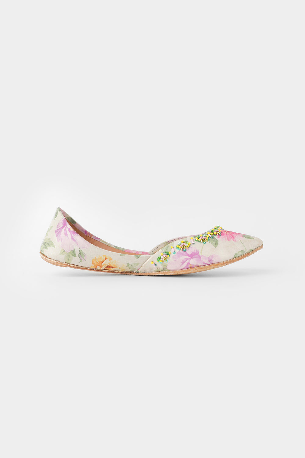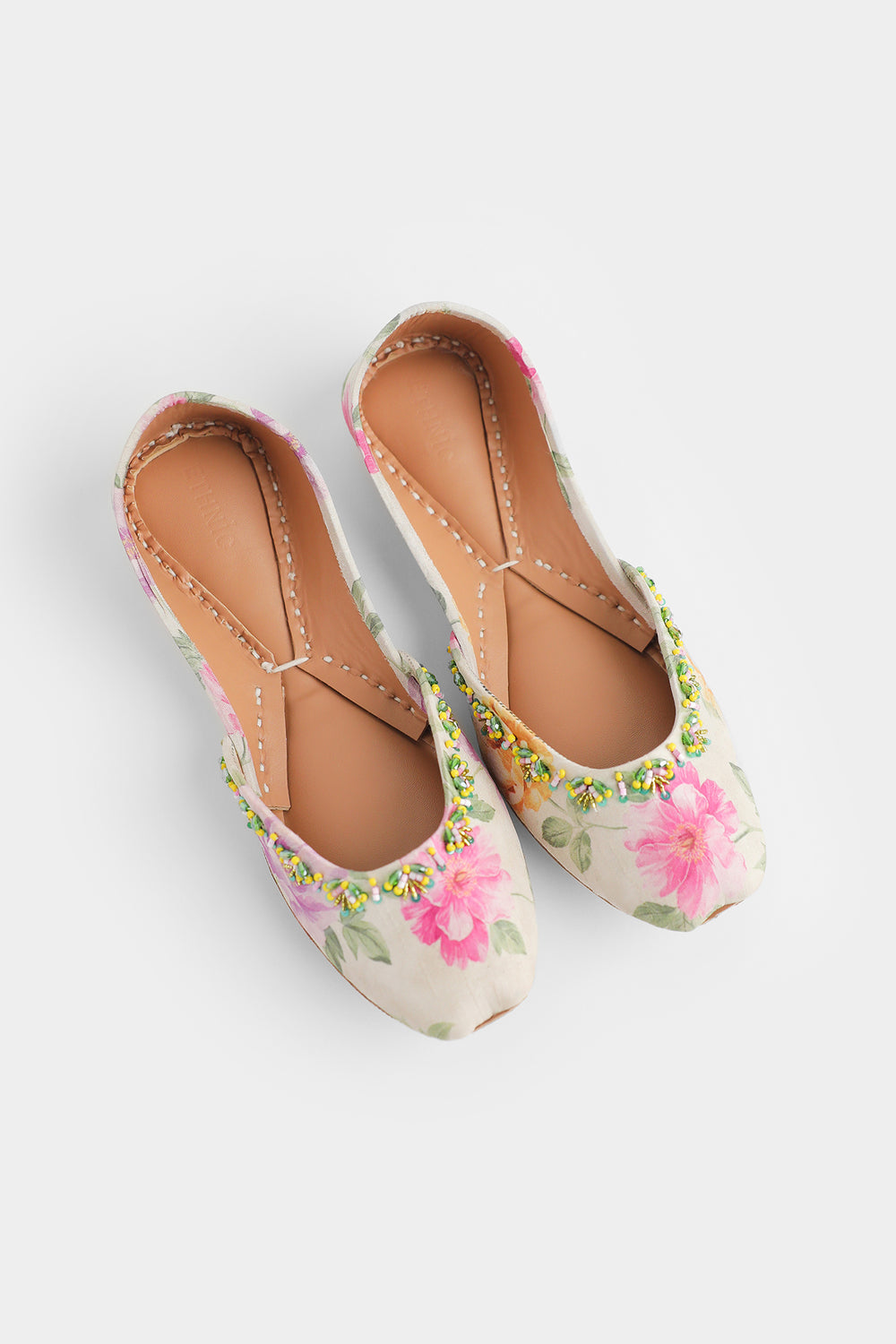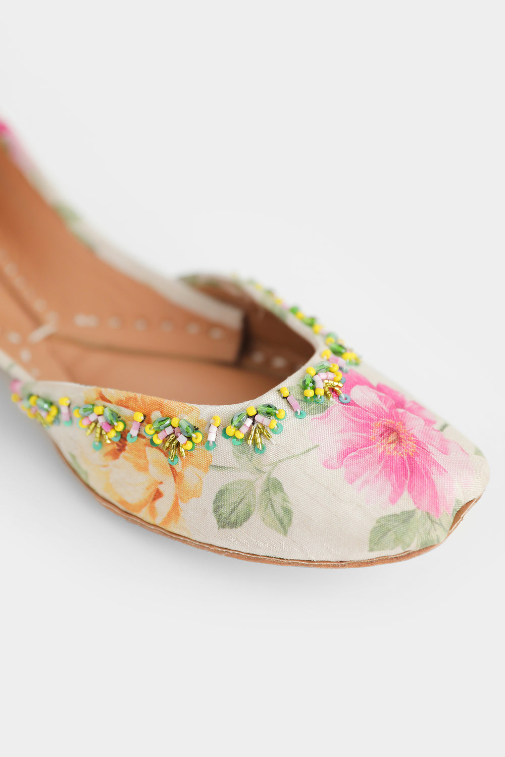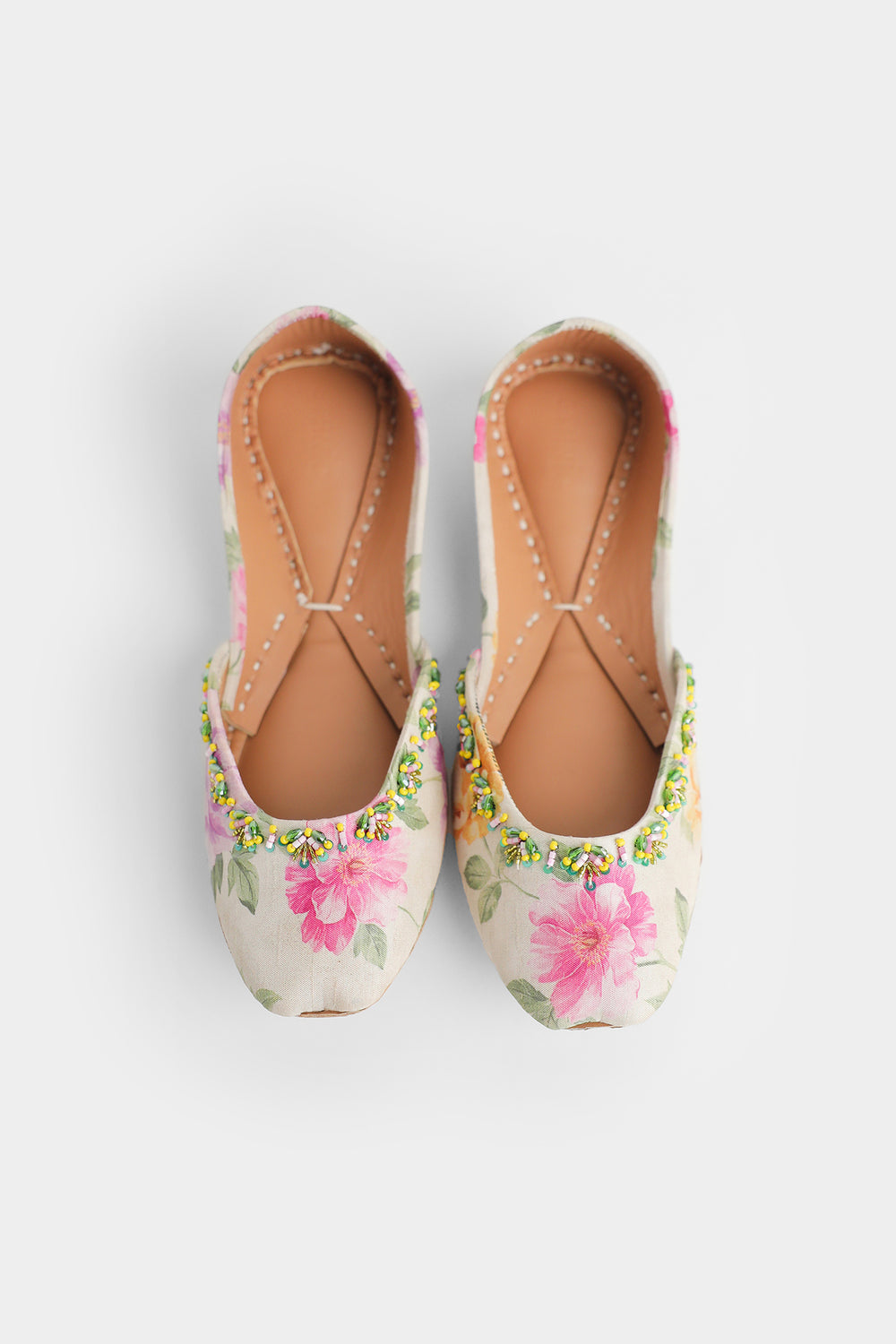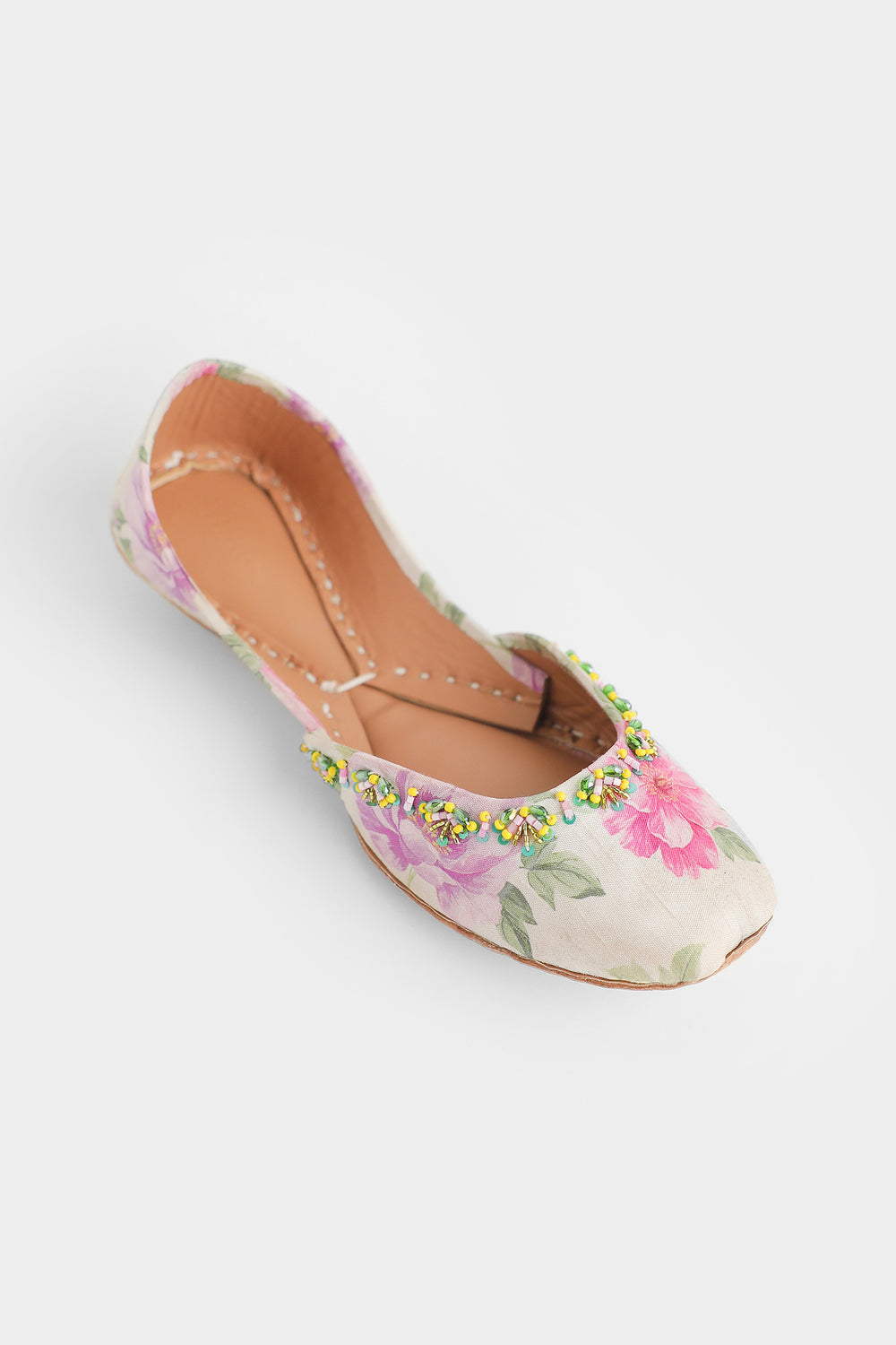 This contemporary khussa offers a beautiful look that will turn heads. Crafted in a stunning vanilla ice shade with floral prints and colorful beads embellishment, it offers a trendy look that will make you gorgeous this season.