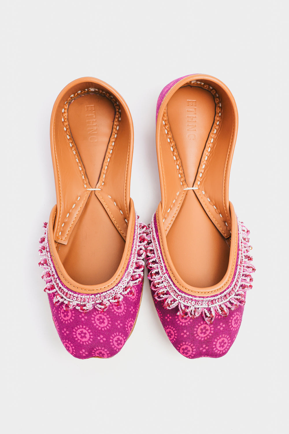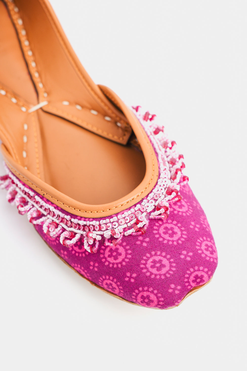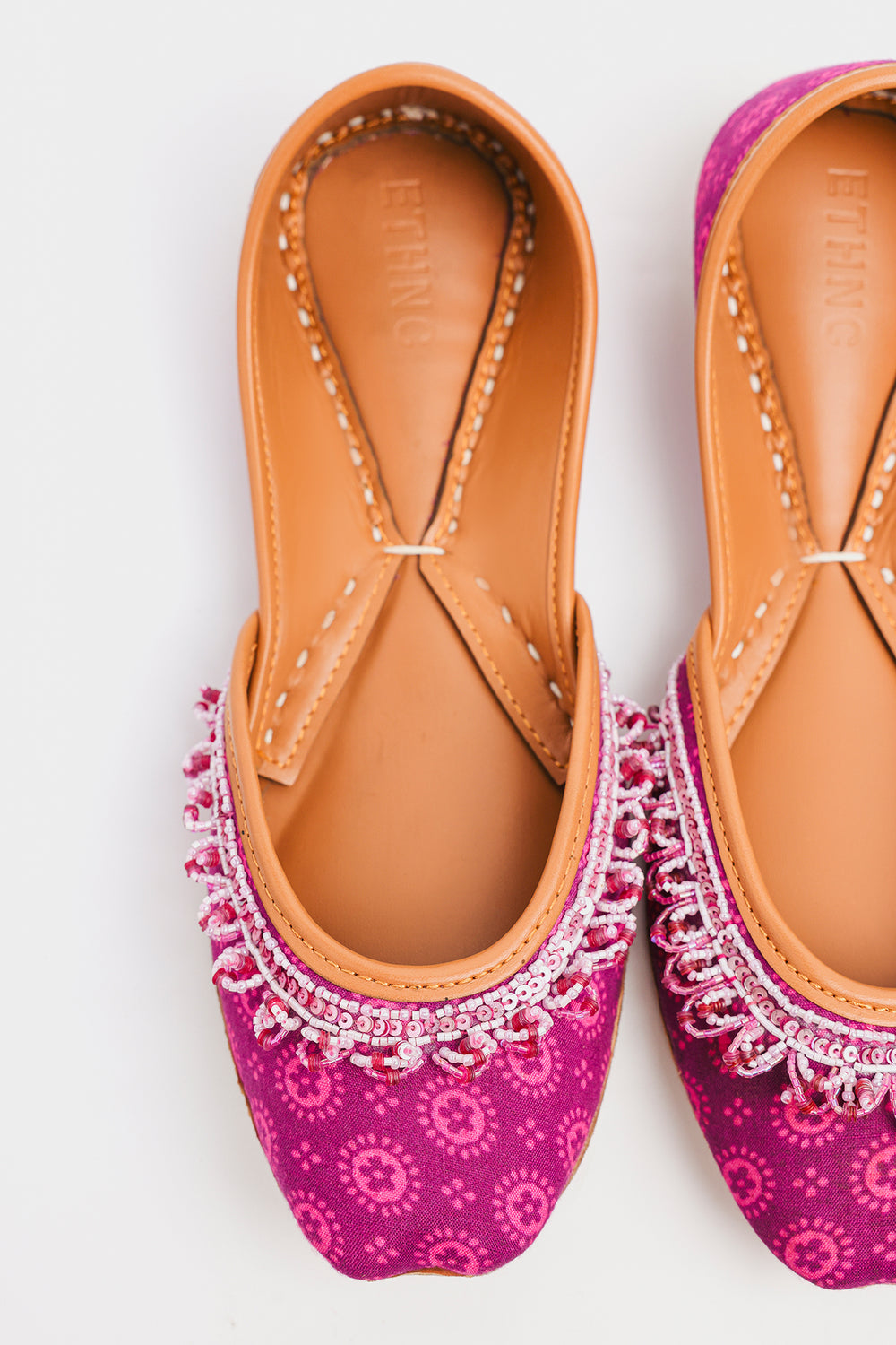 Make a bold statement with these striking fuchsia Khussa shoes. The vibrant magenta fabric is adorned with a subtle tonal print, providing a rich, textured foundation. A stunning hand-embellished border elevates the design, featuring layers of intricate beaded fringe in shades of deep pink and shimmering white. This lavish detailing gives the shoes a captivating, festive flair. Completed with the classic tan leather lining and sole, these Khussa offer a comfortable and head-turning blend of color and traditional artistry.