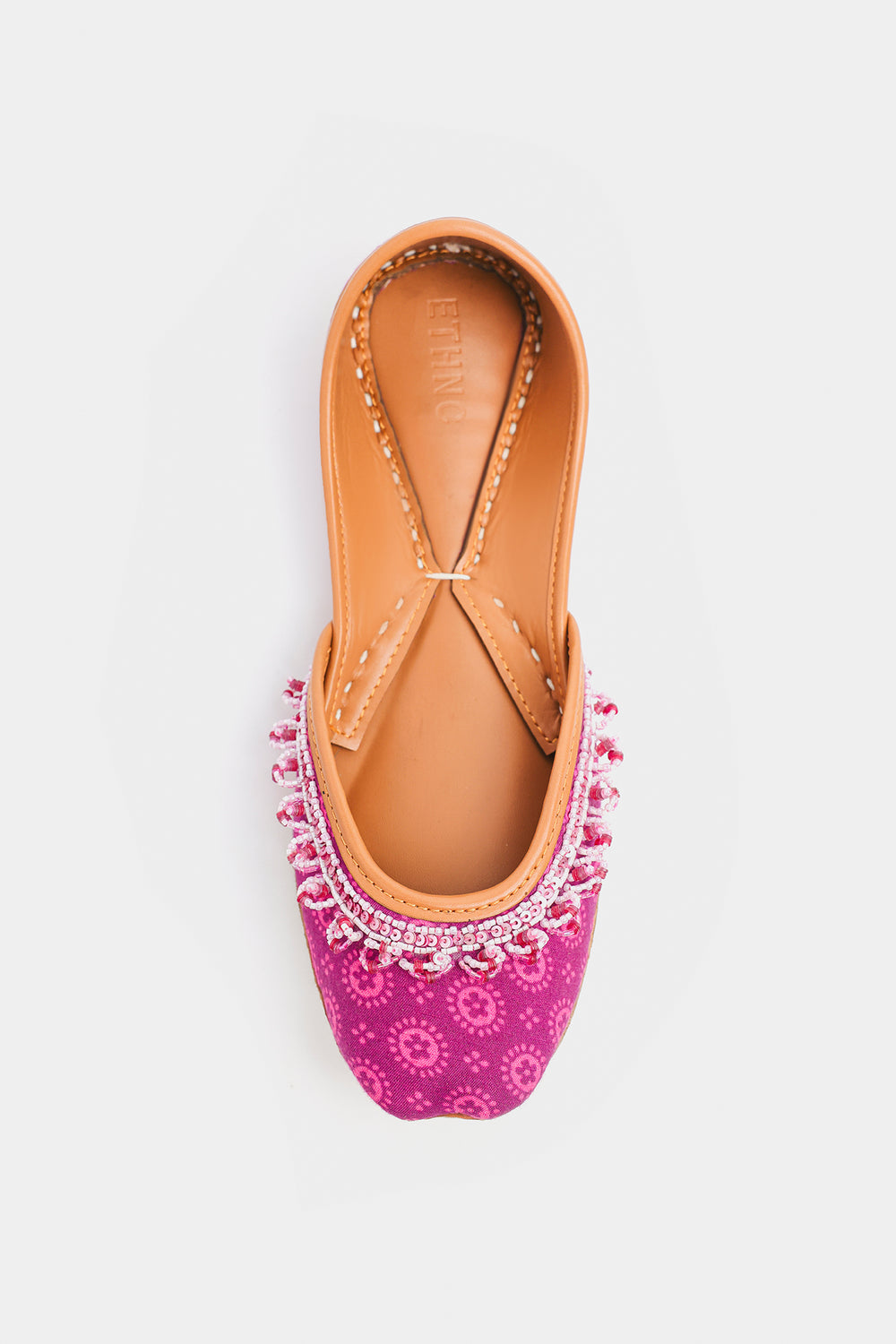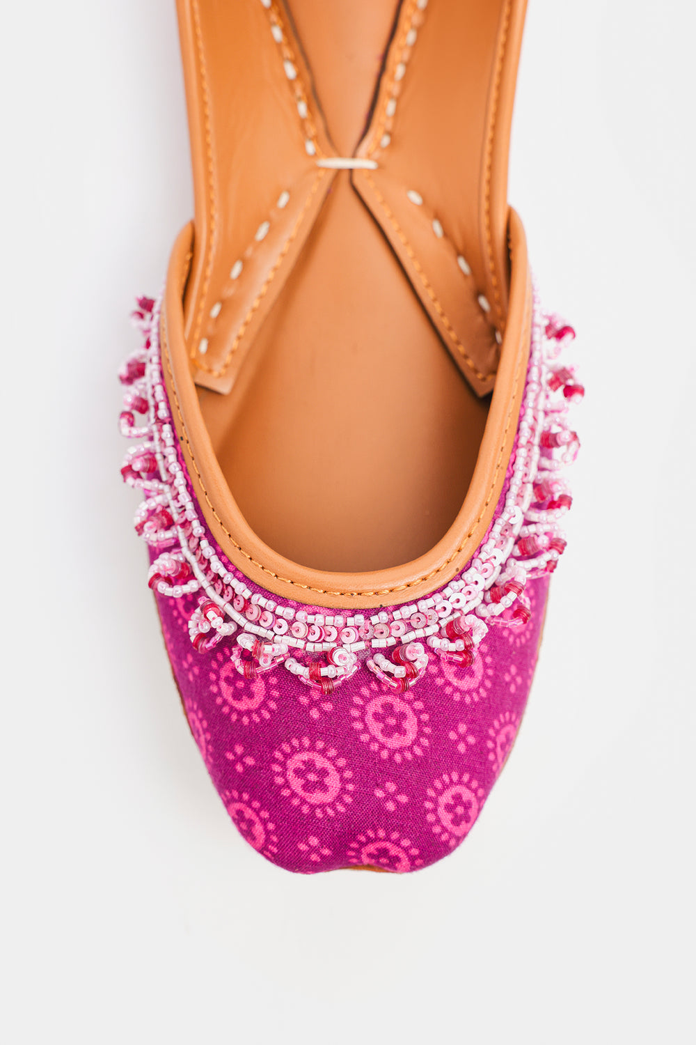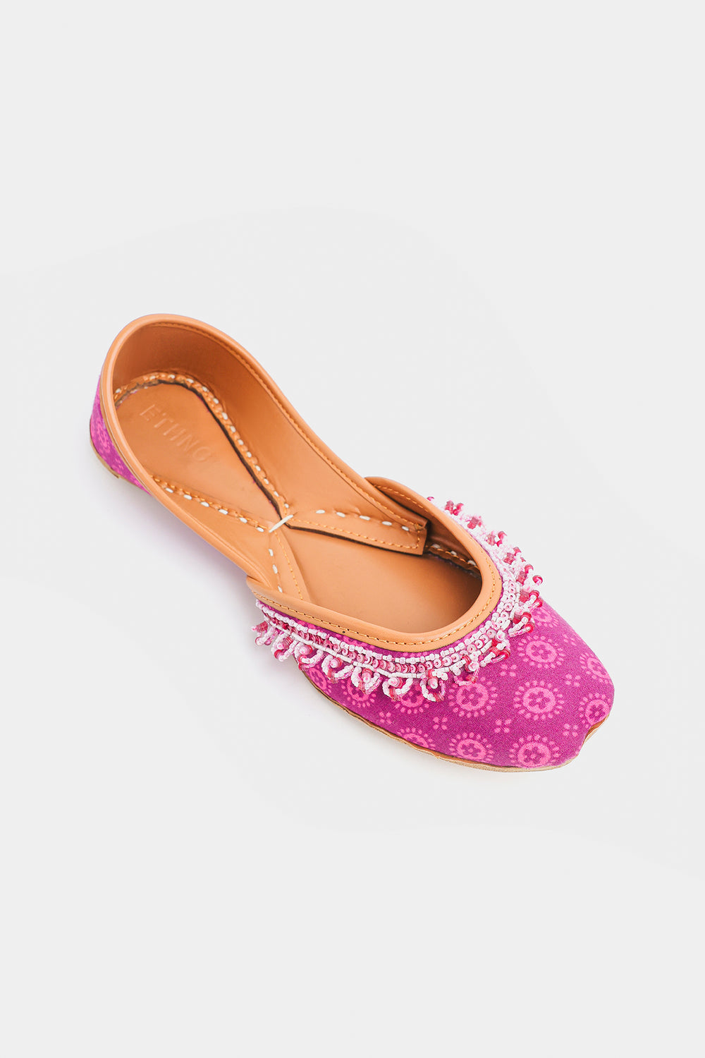 Make a bold statement with these striking fuchsia Khussa shoes. The vibrant magenta fabric is adorned with a subtle tonal print, providing a rich, textured foundation. A stunning hand-embellished border elevates the design, featuring layers of intricate beaded fringe in shades of deep pink and shimmering white. This lavish detailing gives the shoes a captivating, festive flair. Completed with the classic tan leather lining and sole, these Khussa offer a comfortable and head-turning blend of color and traditional artistry.
