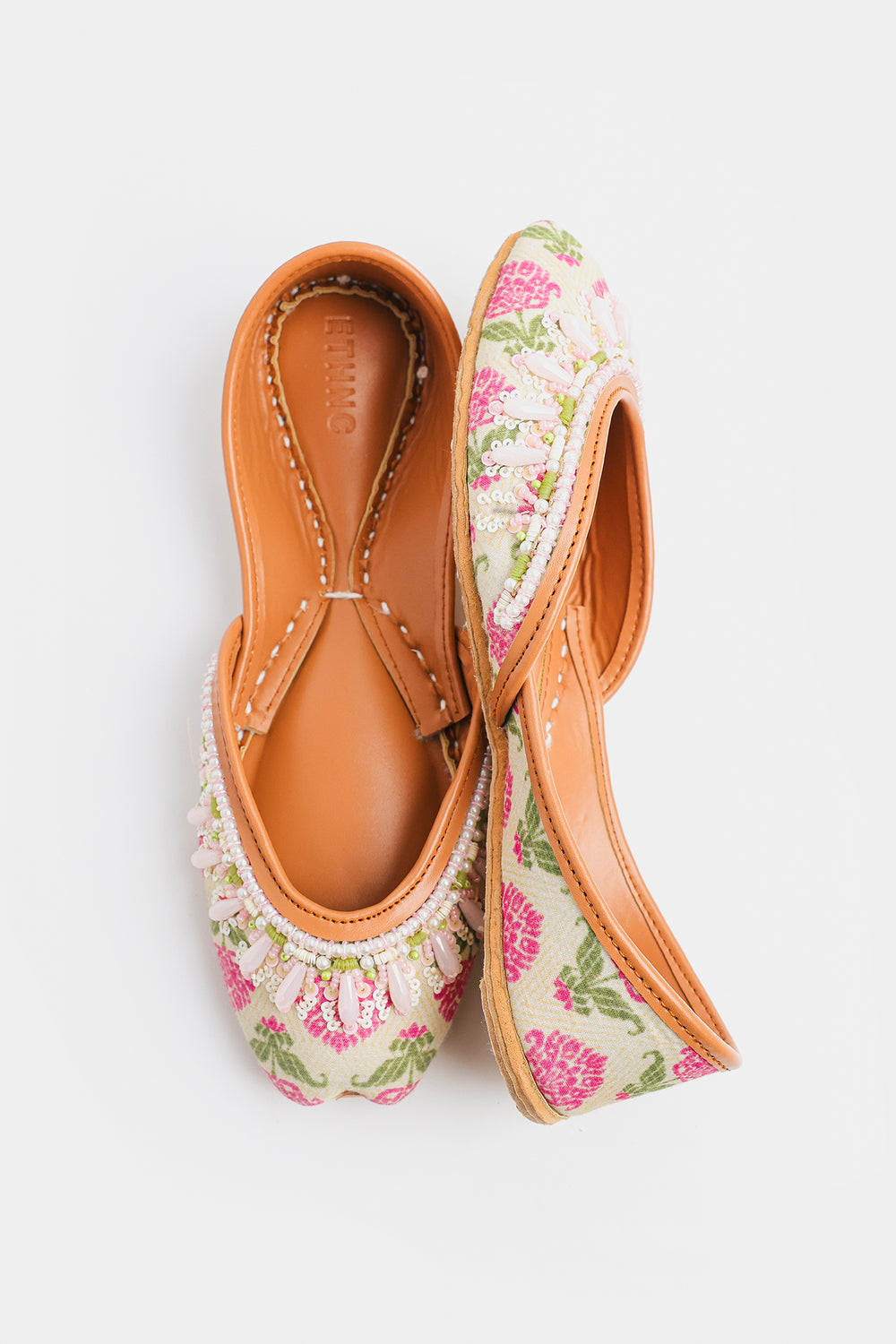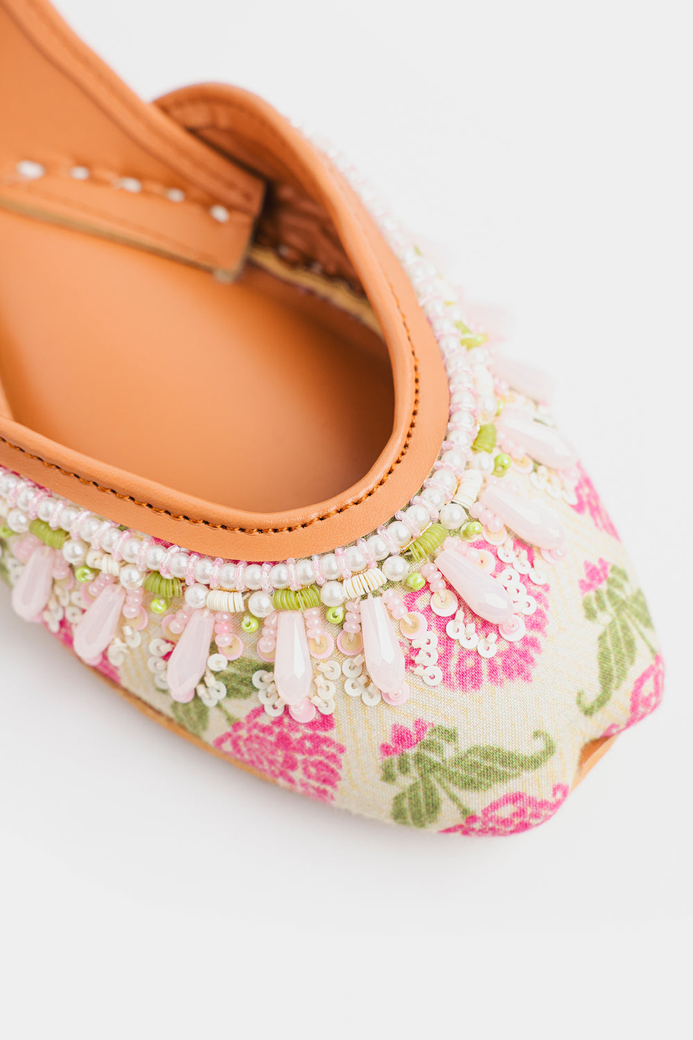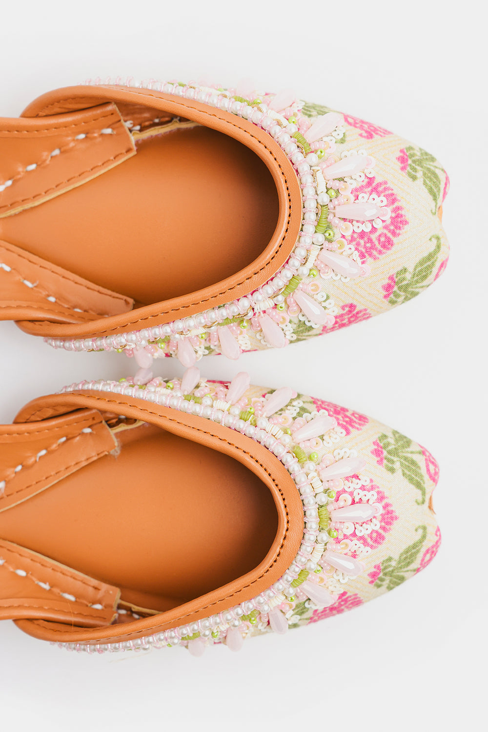 Embrace the soft charm of spring with these delicately handcrafted Khussas. The entire edge is lavishly embellished with an intricate border of white and pale pink beads, including lovely, drop-shaped accents that add dimension and movement. This exquisite beadwork enhances the light, airy feel of the shoe. Finished with the traditional comfortable tan leather sole and lining, these Khussas are a charming addition to any festive or casual wardrobe.