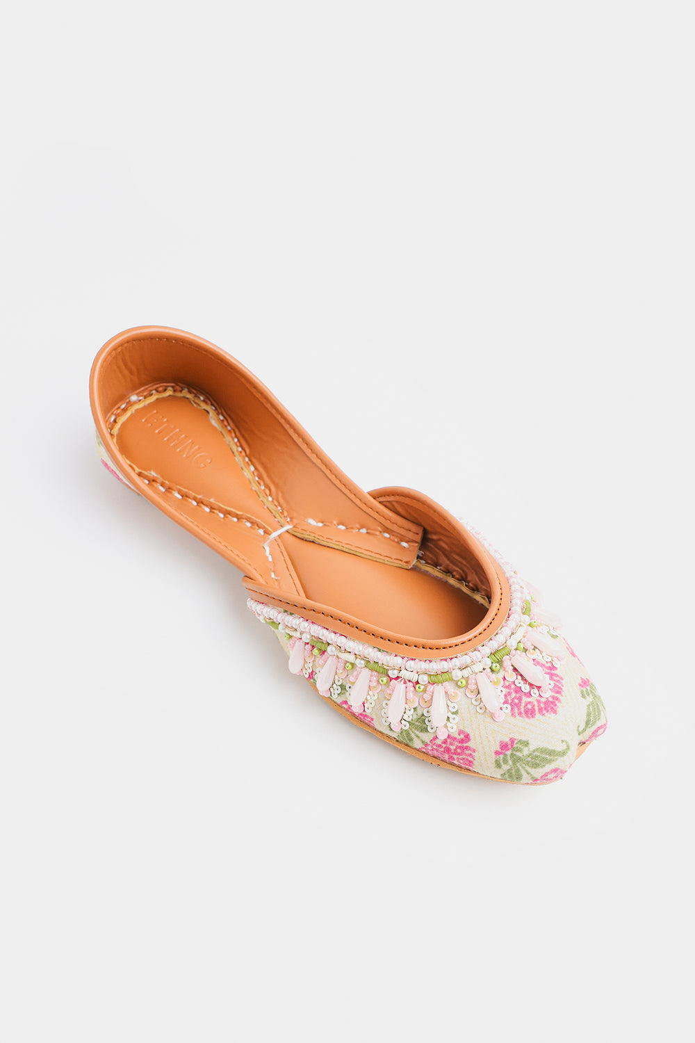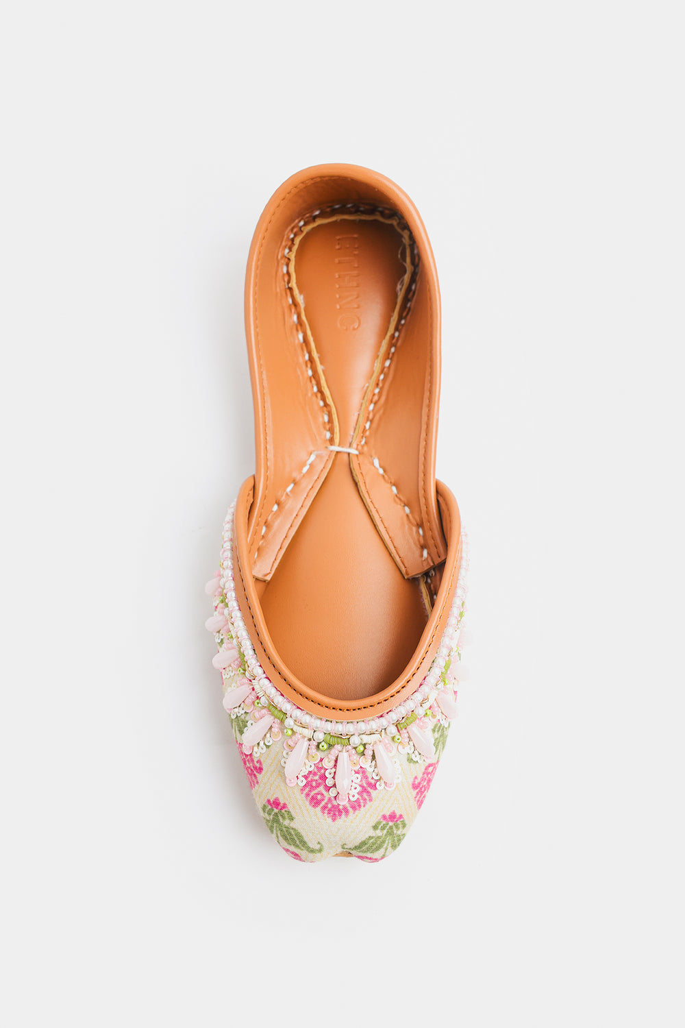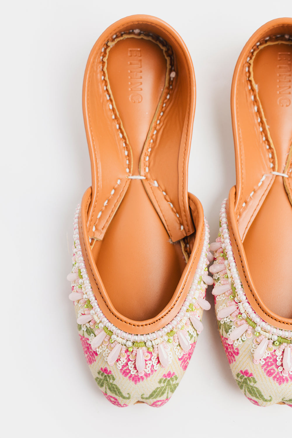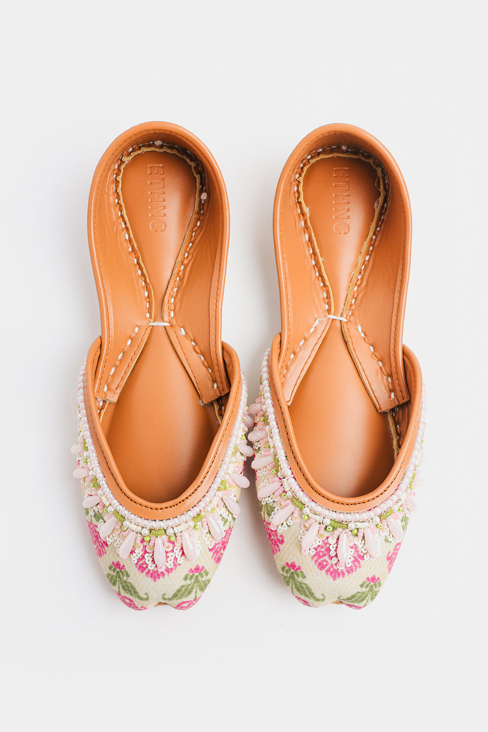 Embrace the soft charm of spring with these delicately handcrafted Khussas. The entire edge is lavishly embellished with an intricate border of white and pale pink beads, including lovely, drop-shaped accents that add dimension and movement. This exquisite beadwork enhances the light, airy feel of the shoe. Finished with the traditional comfortable tan leather sole and lining, these Khussas are a charming addition to any festive or casual wardrobe.