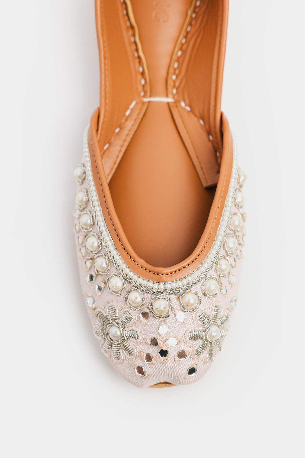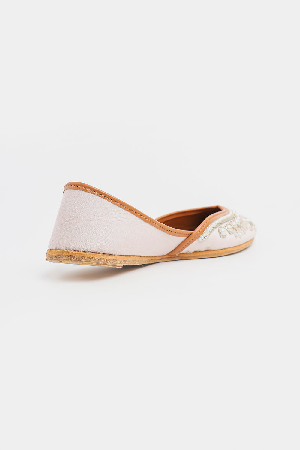 Discover exquisite elegance with these stunning khussa shoes. Crafted on a delicate blush pink base, the entire toe is transformed by intricate silver thread embroidery. The design is lavishly finished with a cascade of embellishments, including luminous pearls, shimmering silver seed beads, and tiny, light-reflecting shisha mirrorwork. The rich detailing creates a truly luxurious and festive look. Grounded by the traditional tan leather sole, these khussa offer a sophisticated blend of comfort and glamour.