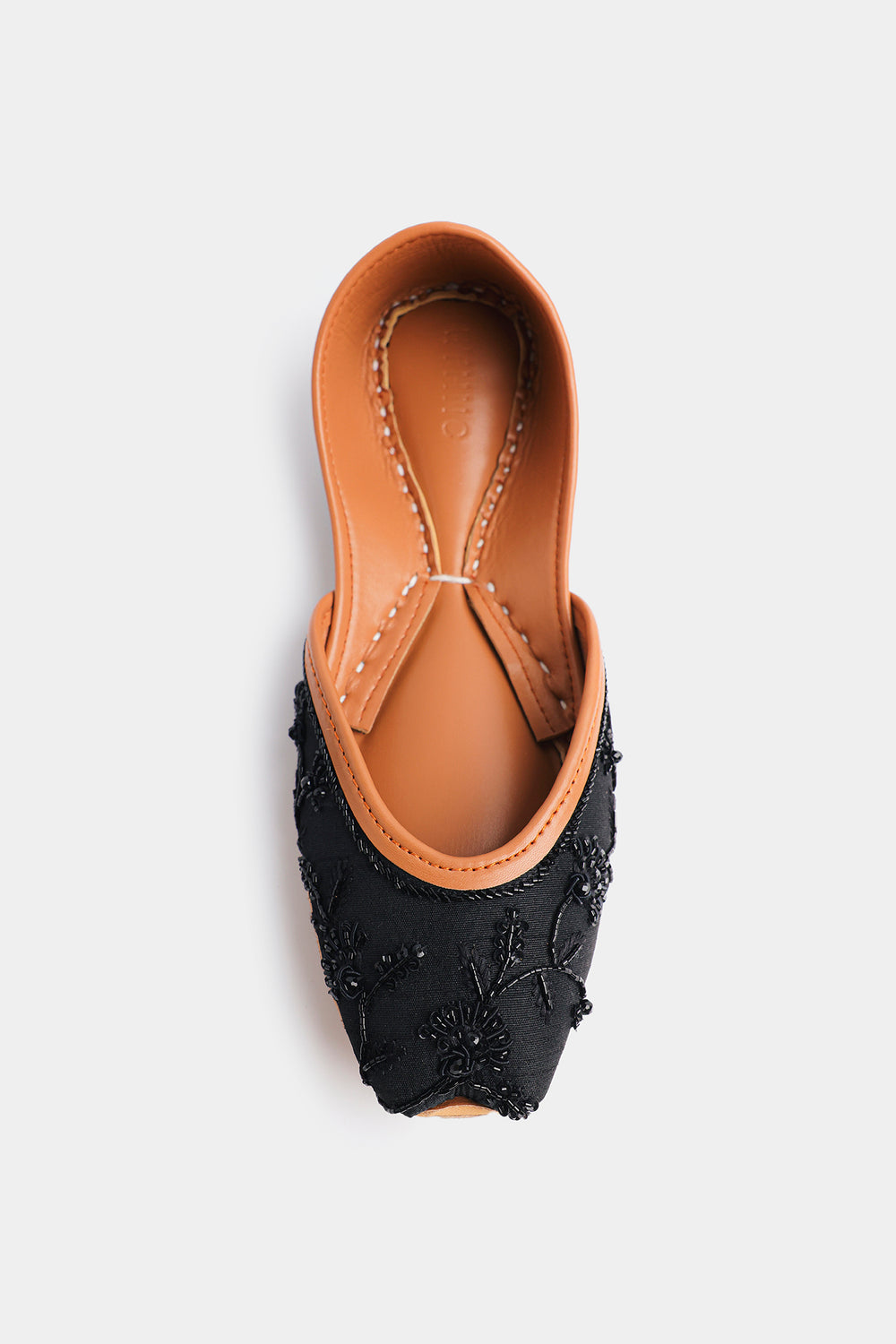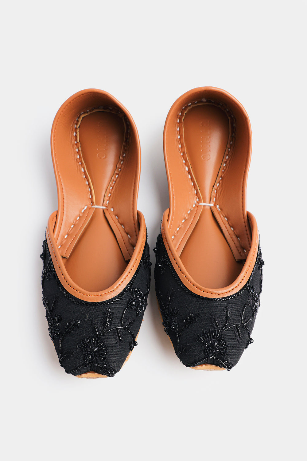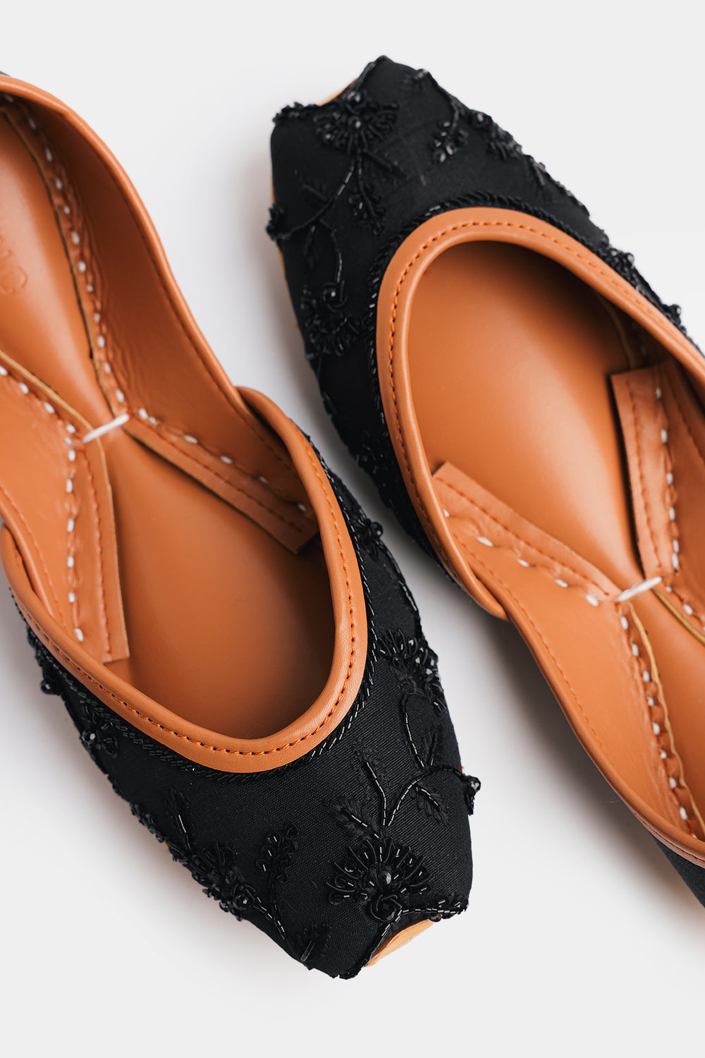 Elegant jet-black khussa crafted from premium ribbed silk with intricate tonal beadwork and floral embroidery. The sophisticated black-on-black detailing creates refined sophistication without excess. Warm tan and camel leather lines the interior and piping, providing a luxurious contrast. Soft padded inner sole ensures all-day comfort, while the traditional closed-back silhouette delivers authentic style. Perfect for special occasions and formal wear.