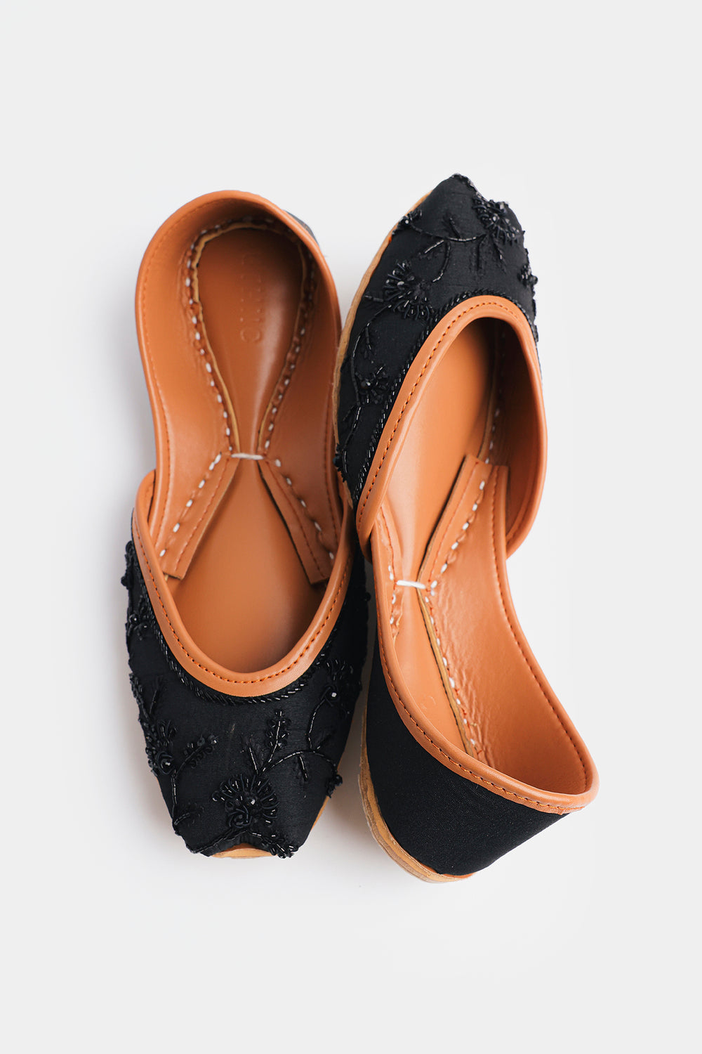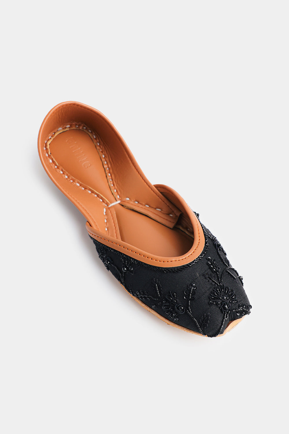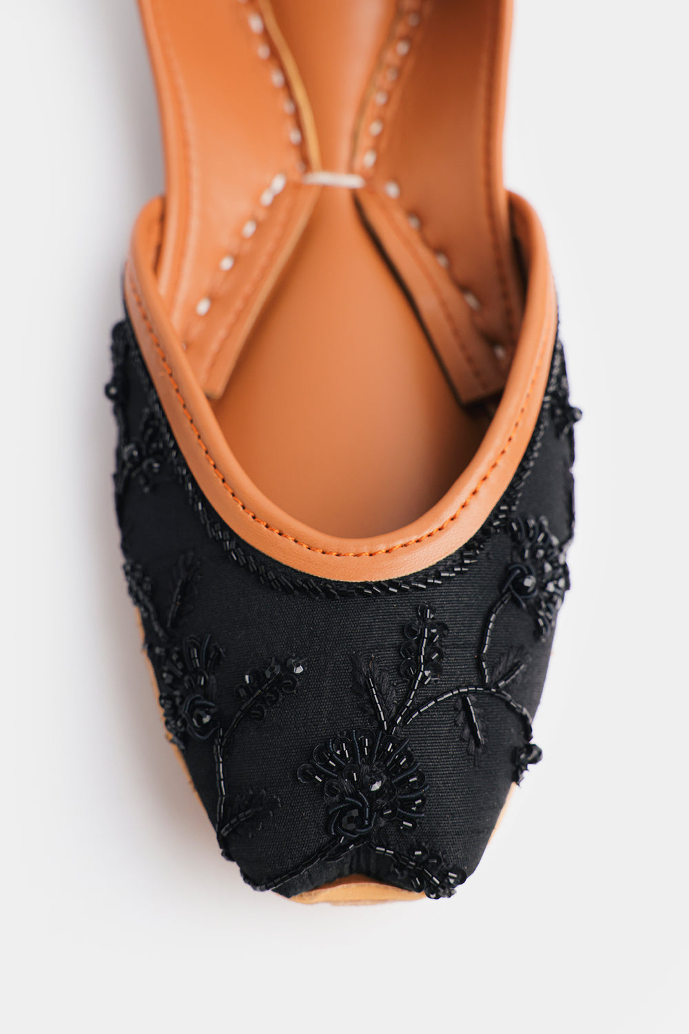 Elegant jet-black khussa crafted from premium ribbed silk with intricate tonal beadwork and floral embroidery. The sophisticated black-on-black detailing creates refined sophistication without excess. Warm tan and camel leather lines the interior and piping, providing a luxurious contrast. Soft padded inner sole ensures all-day comfort, while the traditional closed-back silhouette delivers authentic style. Perfect for special occasions and formal wear.