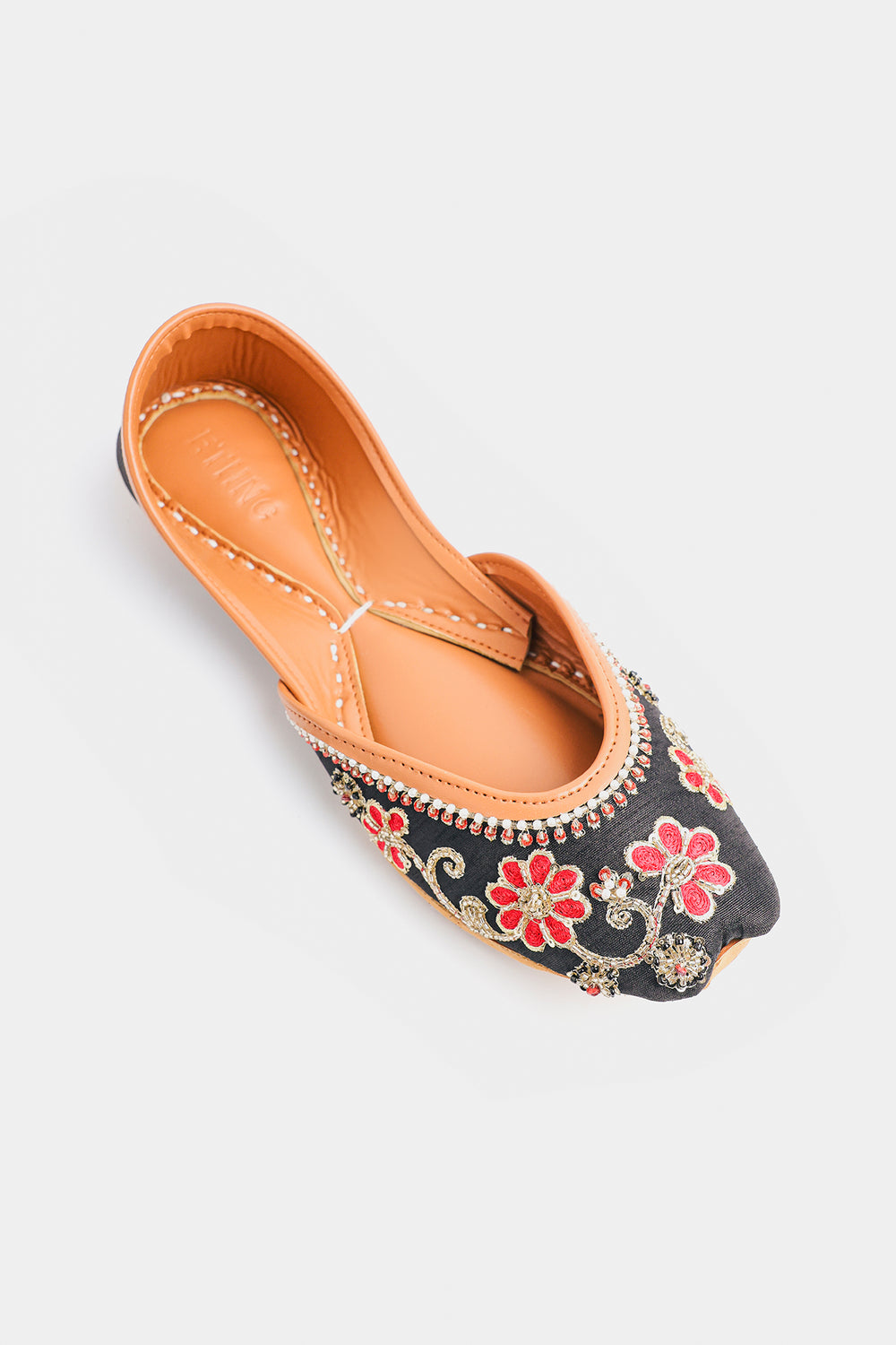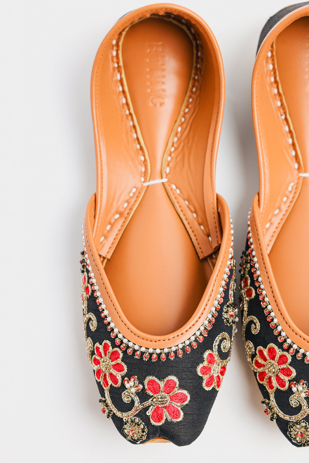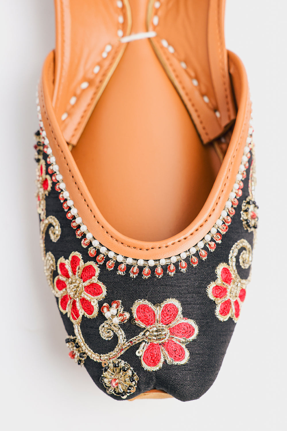 Discover timeless drama with these gorgeous handcrafted Khussas. The rich black base provides a striking canvas for the vibrant embellishments, perfect for evening wear or festive events. The toe features bold red floral pattern and intricate gold threadwork, beautifully contrasted by tiny silver and white beads that frame the pattern. The combination of intense color and sparkling detail creates a captivating, luxurious look. Finished with the traditional, comfortable tan leather sole and lining, these Khussa offer both refined style and exceptional comfort.