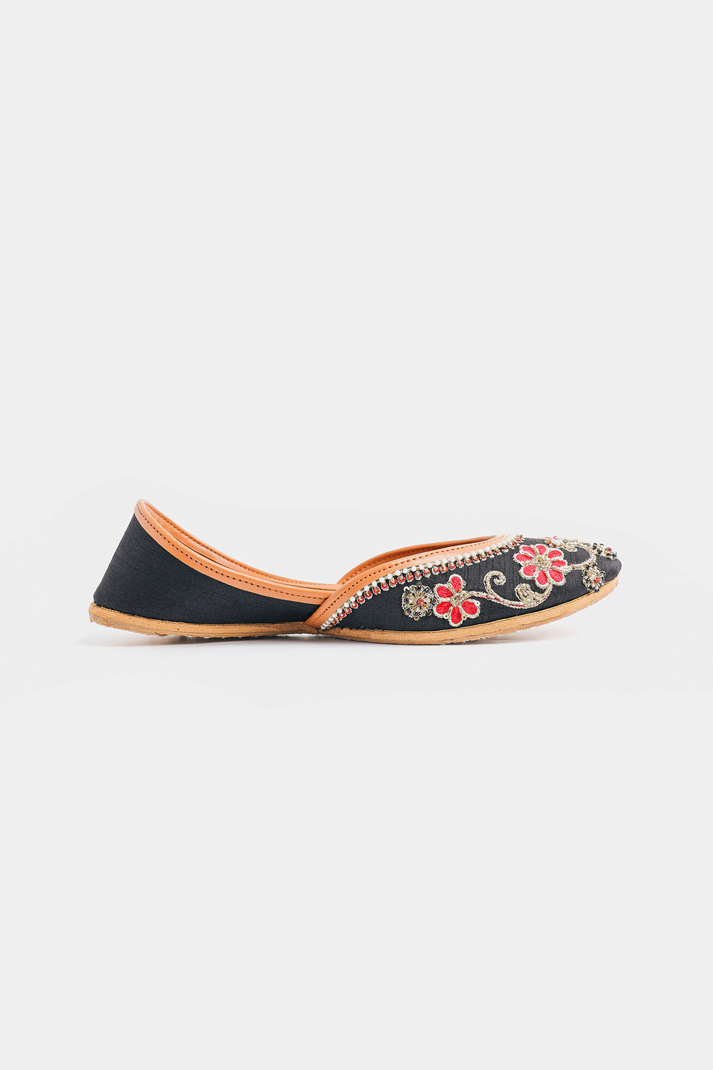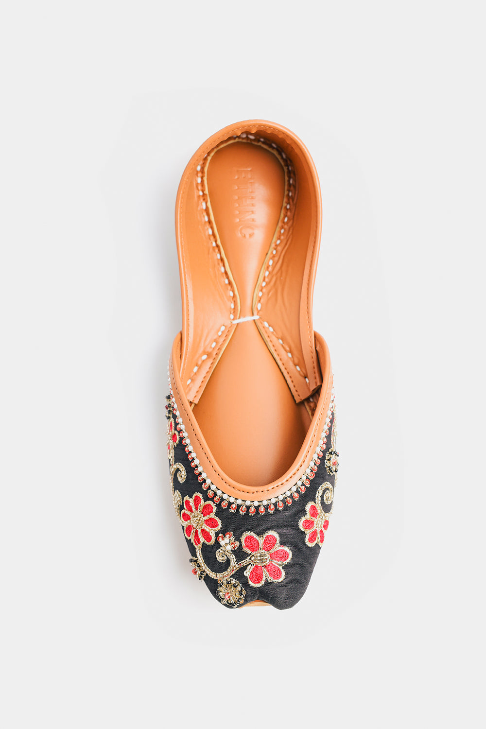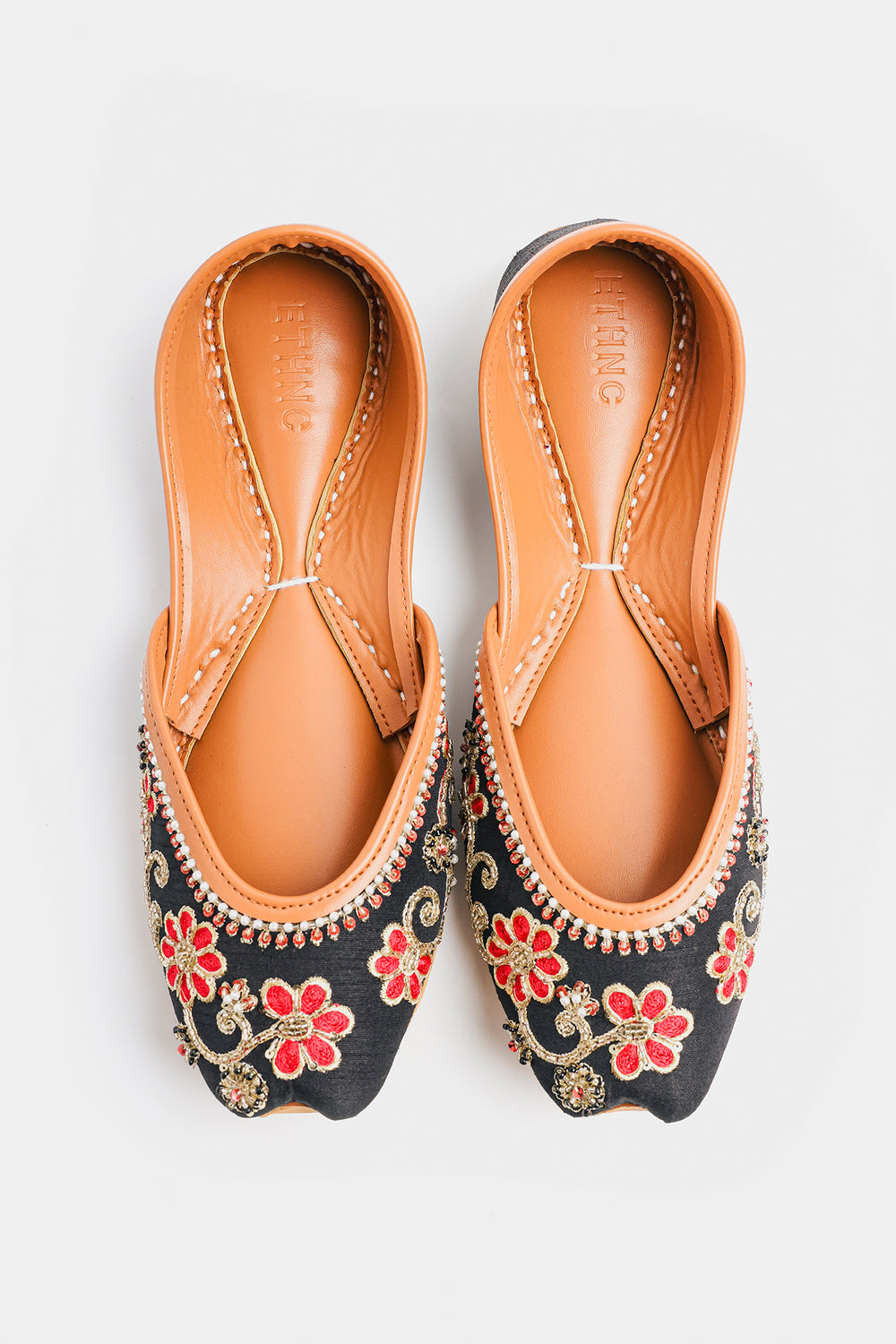Discover timeless drama with these gorgeous handcrafted Khussas. The rich black base provides a striking canvas for the vibrant embellishments, perfect for evening wear or festive events. The toe features bold red floral pattern and intricate gold threadwork, beautifully contrasted by tiny silver and white beads that frame the pattern. The combination of intense color and sparkling detail creates a captivating, luxurious look. Finished with the traditional, comfortable tan leather sole and lining, these Khussa offer both refined style and exceptional comfort.