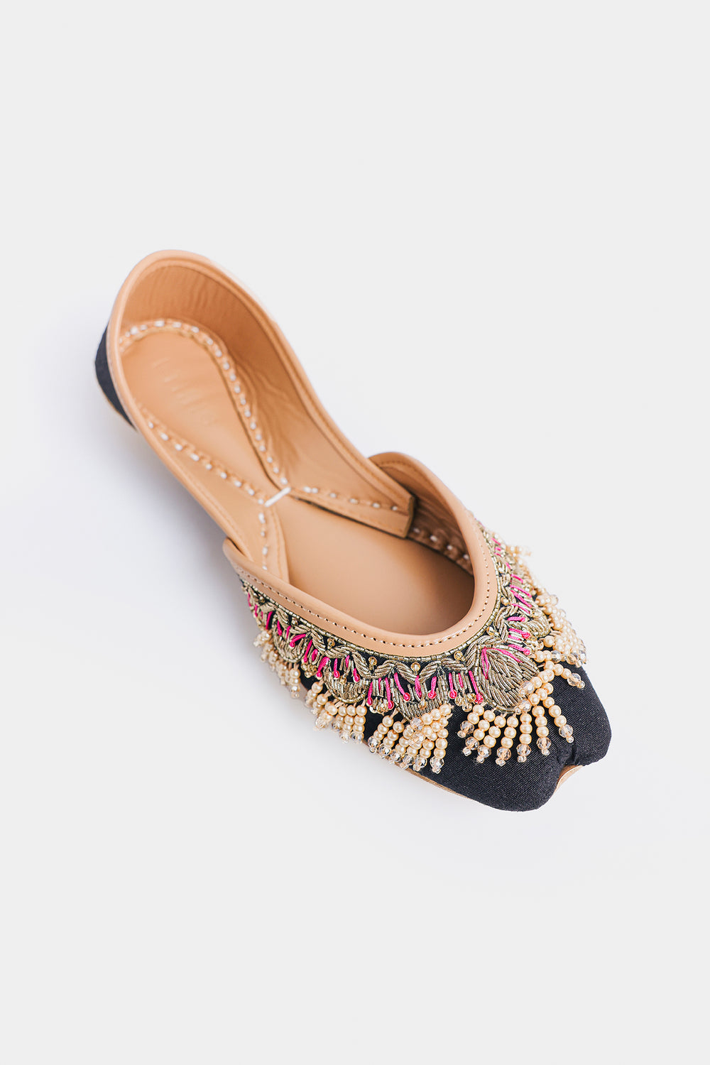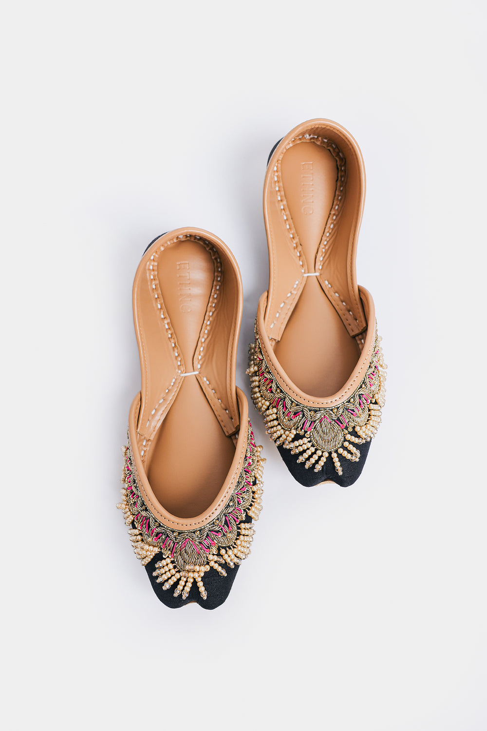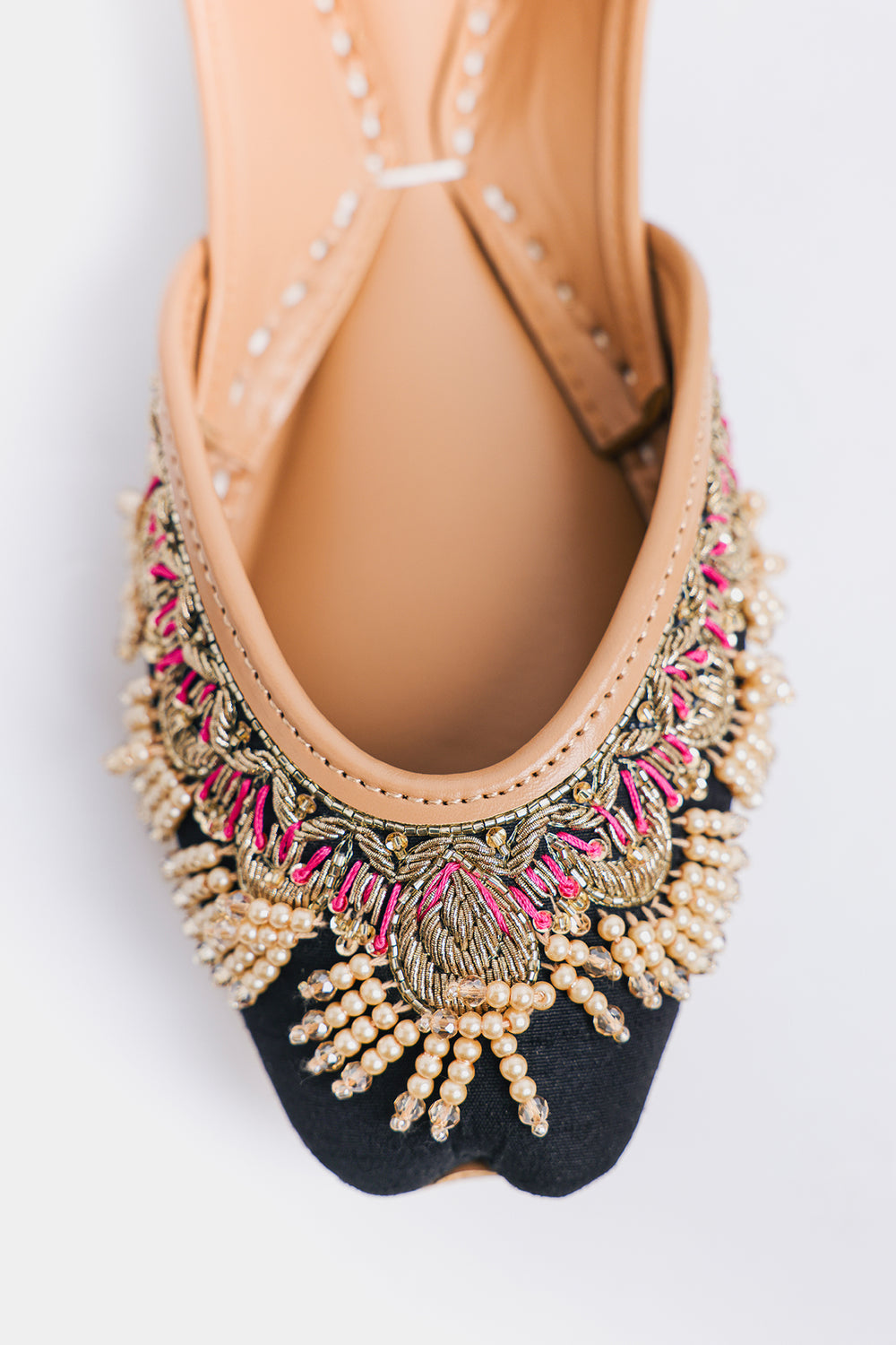 Step into tradition with a contemporary edge! These stunning khussas feature a rich dark base elevated with intricate Zardosi metallic threadwork, shimmering beads, and delicate ghungroos that dance with every step. The luxurious 3D embellishments create mesmerizing texture and movement, making them a showstopper whether you're pairing them with a classic Shalwar Kameez, a flowing Lehenga, or your favorite jeans for that perfect fusion look. Comfort meets artistry in this versatile pair that celebrates heritage while embracing modern style.