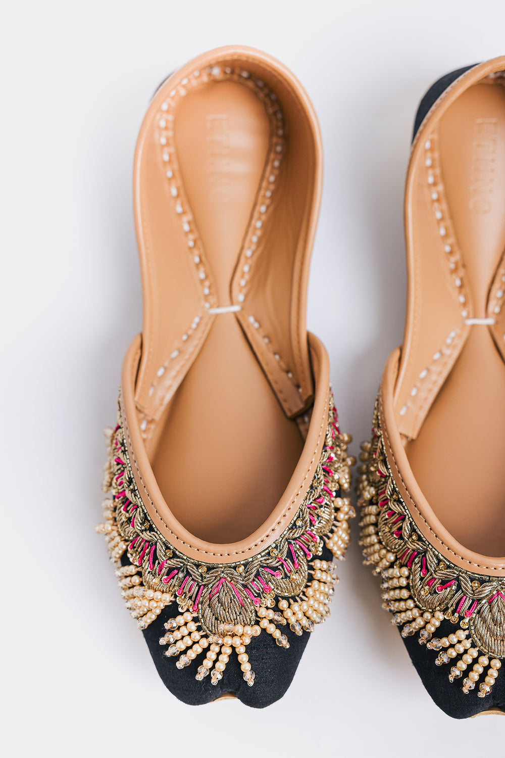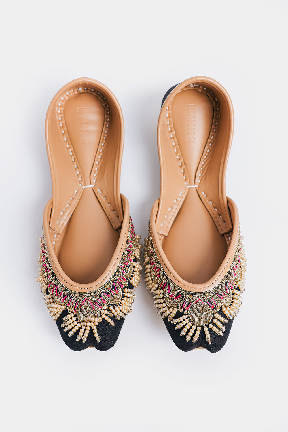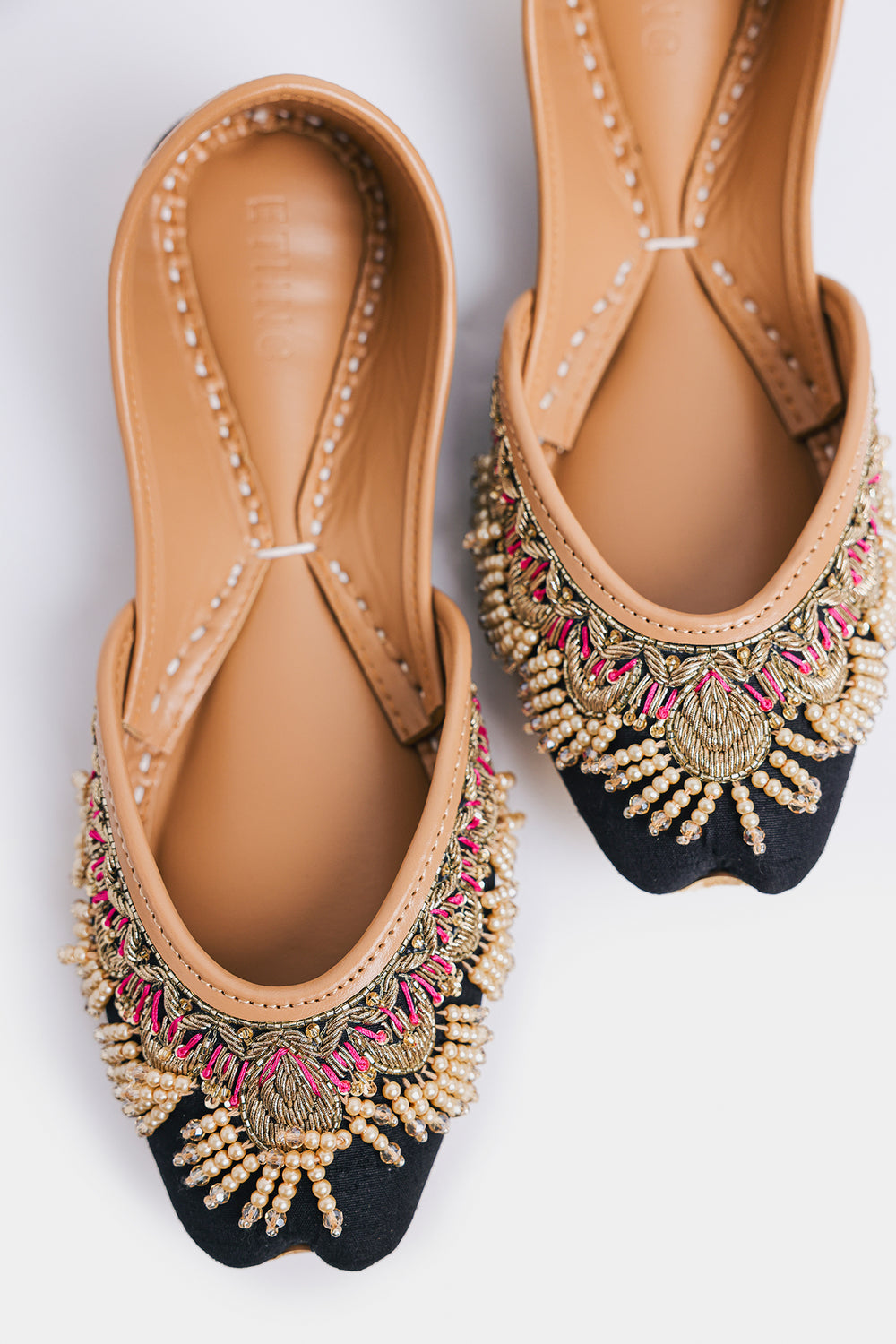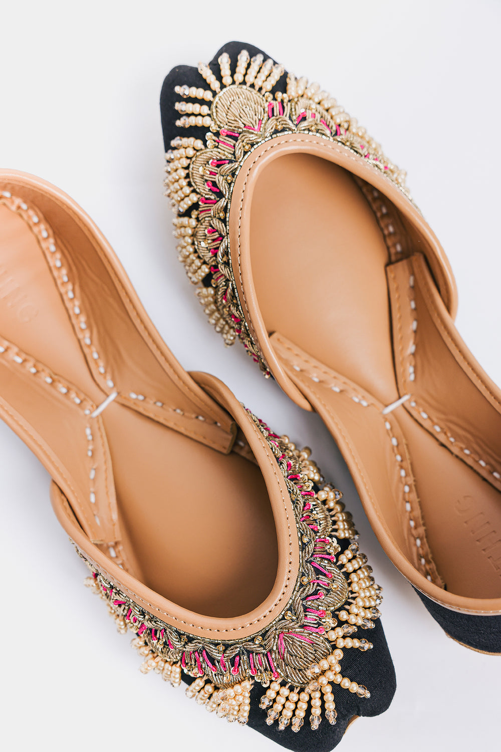 Step into tradition with a contemporary edge! These stunning khussas feature a rich dark base elevated with intricate Zardosi metallic threadwork, shimmering beads, and delicate ghungroos that dance with every step. The luxurious 3D embellishments create mesmerizing texture and movement, making them a showstopper whether you're pairing them with a classic Shalwar Kameez, a flowing Lehenga, or your favorite jeans for that perfect fusion look. Comfort meets artistry in this versatile pair that celebrates heritage while embracing modern style.