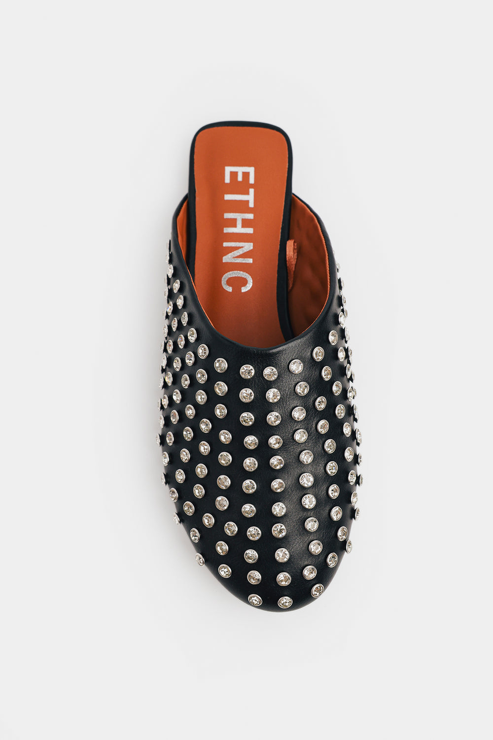 Closed-toe mules with a sleek silhouette and a slip-on style for effortless wear. Fully adorned with evenly spaced metallic studs, giving them a bold, modern, and glamorous vibe. These mules bring together ease and sophistication—perfect for elevating everyday outfits or adding an edge to semi-formal looks.