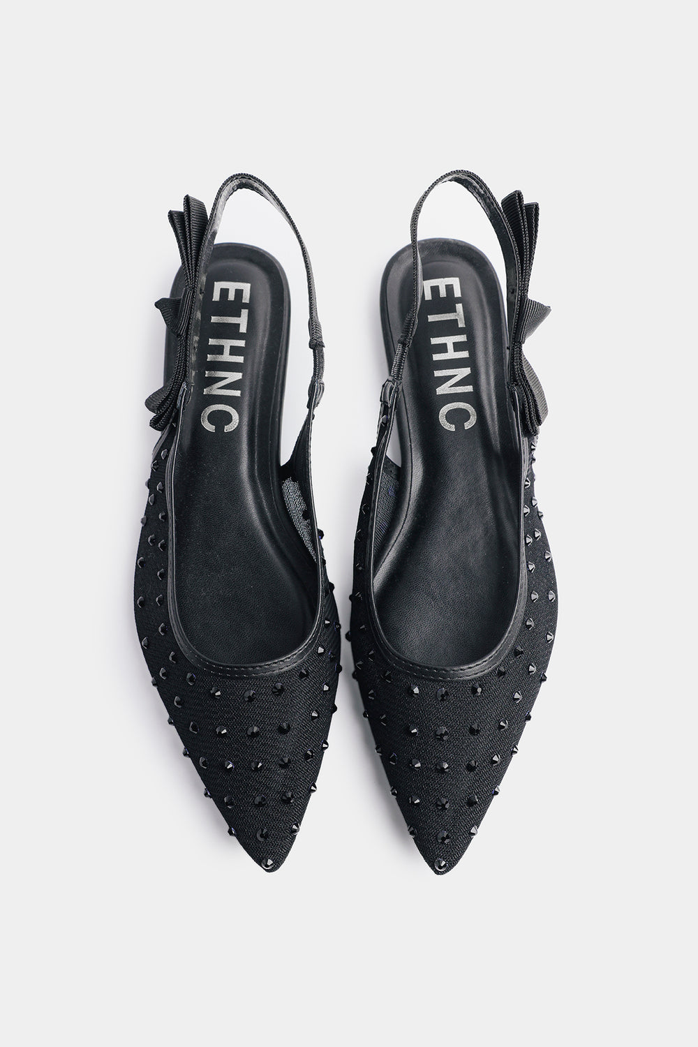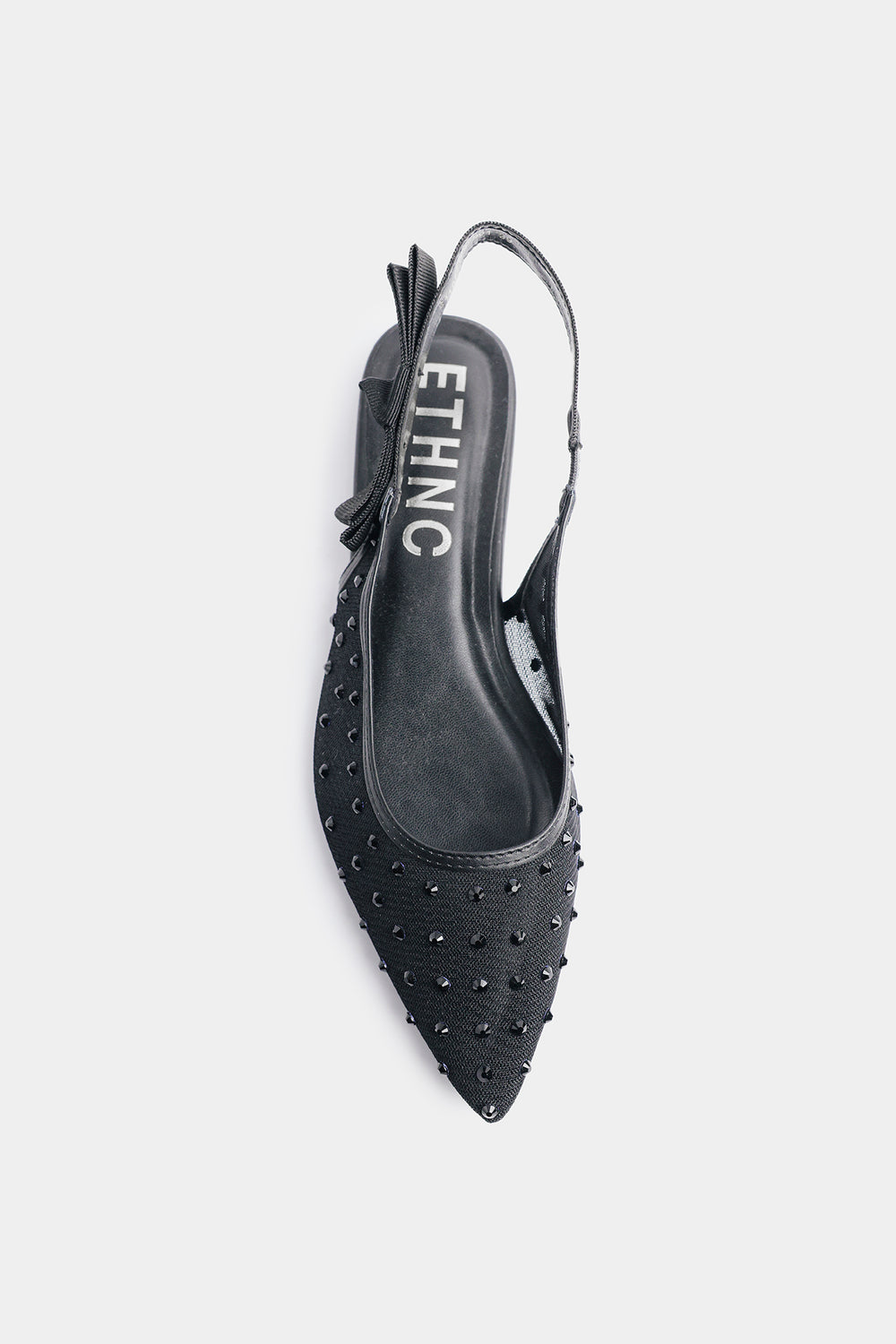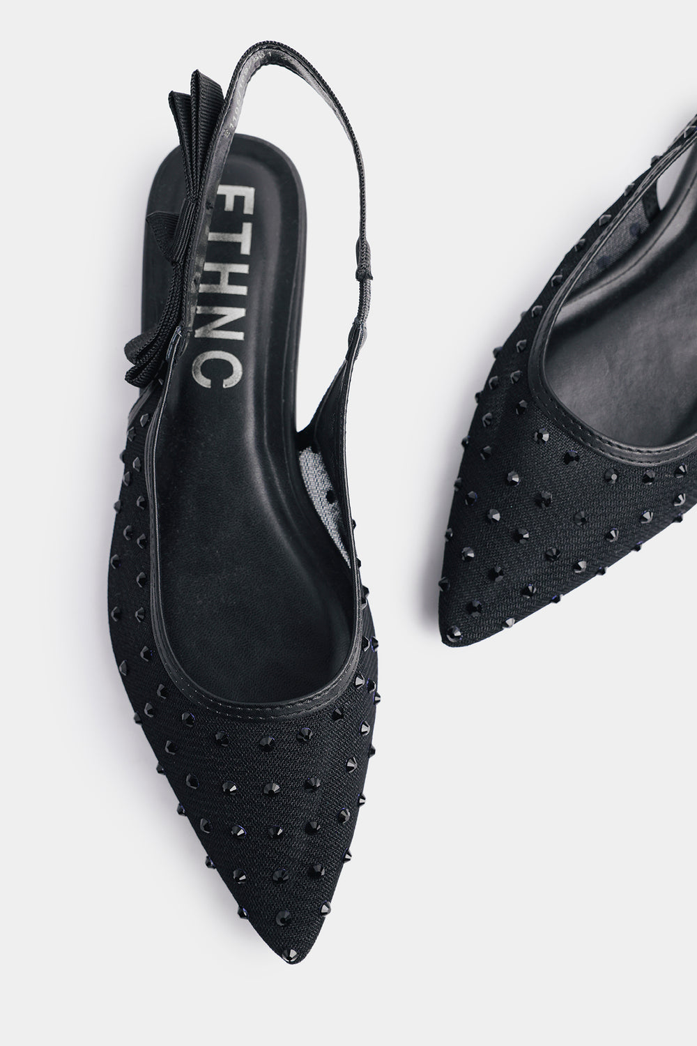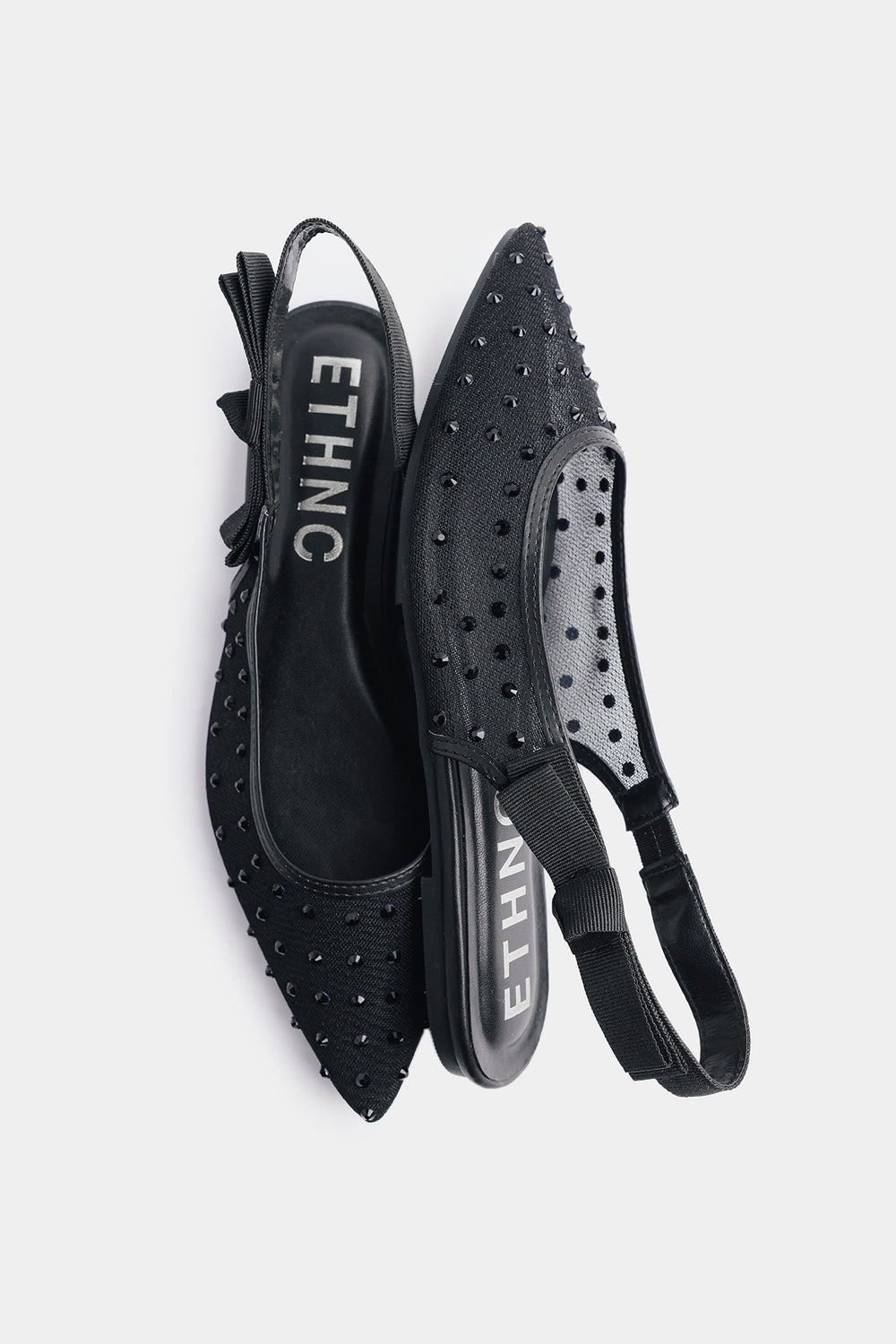 Step out in effortless sophistication with these stunning black mules, meticulously crafted to add a touch of glamour to your evening or festive attire. These pointed-toe flats are exquisitely embellished with scattered arrangement of shimmering beads, creating a textured finish that catches the light from every angle. The design is perfected with a graceful slingback strap, featuring a charming bow detail on the side for a soft, feminine touch. Combining a sleek, comfortable fit with high-fashion artistry, these mules are the ideal choice for completing a refined look without sacrificing ease of movement.