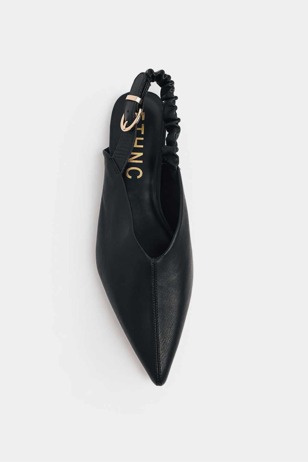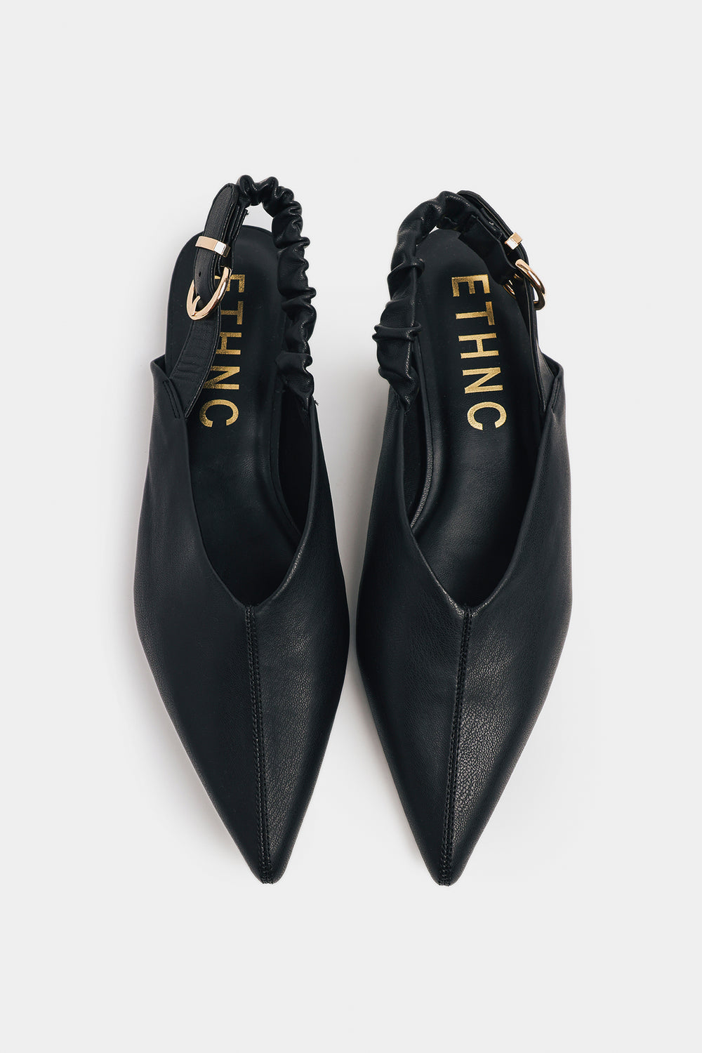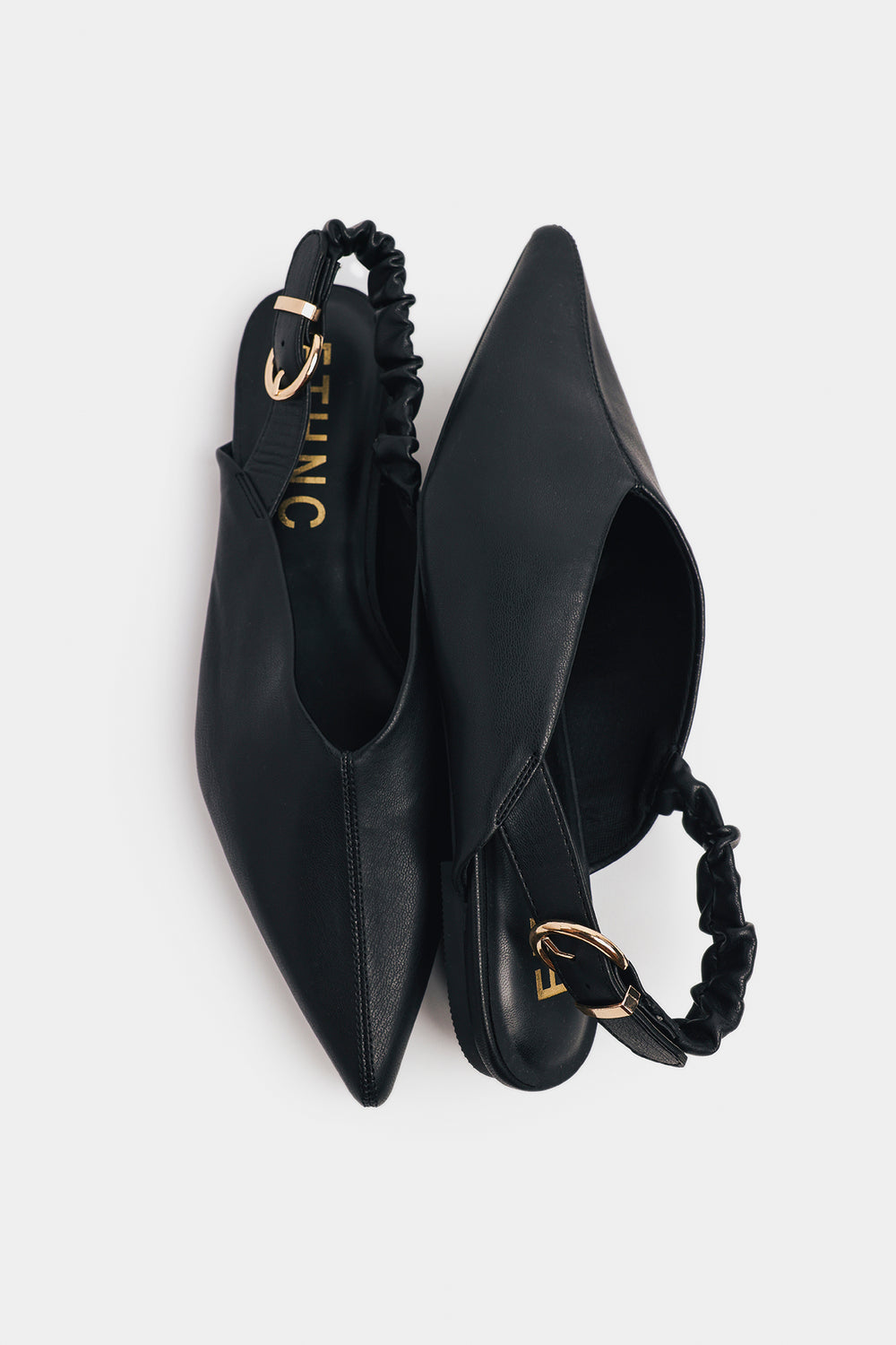 Embrace effortless chic with these sophisticated pointed slingback flats. Crafted in a versatile black hue, these shoes are the ultimate wardrobe neutral, pairing seamlessly with everything from denim to dress wear. The design features a sharp pointed toe and a clean, minimalist vamp. The standout detail is the comfortable, ruched elasticized slingback strap, finished with a subtle gold-toned buckle, ensuring a secure and stylish fit. They offer a refined, low-profile look that is perfect for all-day elegance.