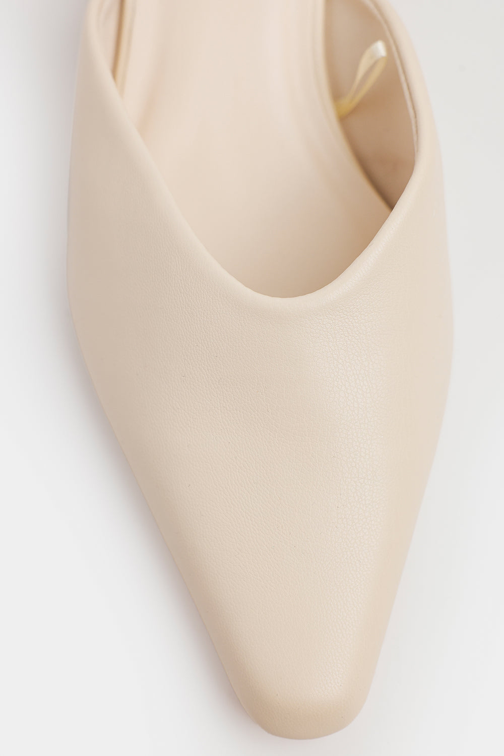 Embrace modern minimalist elegance with these effortlessly chic mule heels. The soft off white hue and smooth, matte finish ensure maximum versatility, making them the perfect neutral foundation for any ensemble. Featuring a refined pointed toe and a comfortable kitten heel, the silhouette is both sophisticated and practical for day-to-evening wear. With their clean lines and slip-on style, these mules offer an understated luxury that will become a timeless staple in your shoe collection.