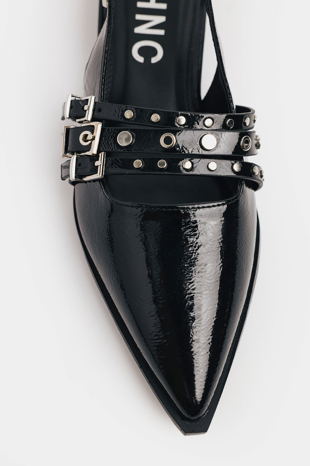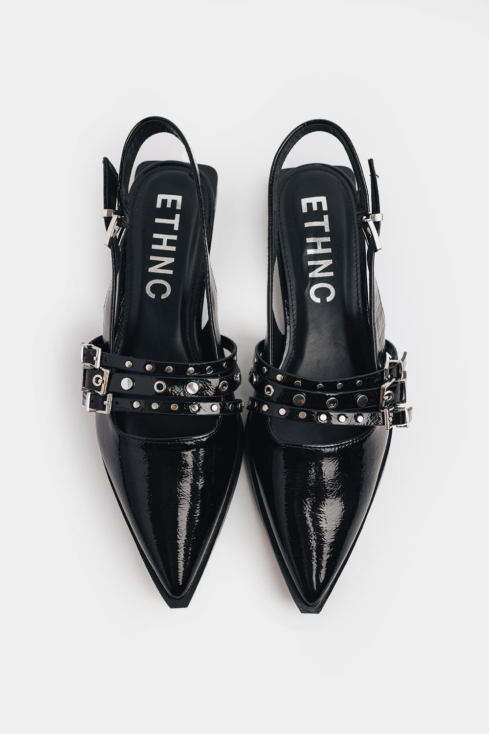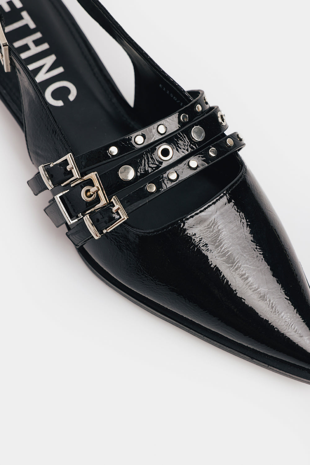 Step out in style with these bold pointed slingback flats. Crafted in sleek, high-shine patent black, these shoes merge classic elegance with serious street edge. The sharp pointed toe is contrasted by multiple thin straps across the vamp, which is heavily detailed with silver-toned studs and eyelets. An adjustable buckle strap adds to the edgy aesthetic, while the comfortable slingback ensures a secure fit. These flats are the perfect statement piece to add polish and punk-rock attitude to any outfit.