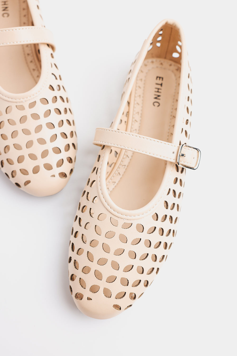 This is a stylish flat shoe in a soft off white color. It features a breathable, laser-cut perforated design throughout the upper, creating an airy and lightweight look. The shoe includes a thin strap for a secure fit, perfect for casual wear while maintaining comfort and flexibility.