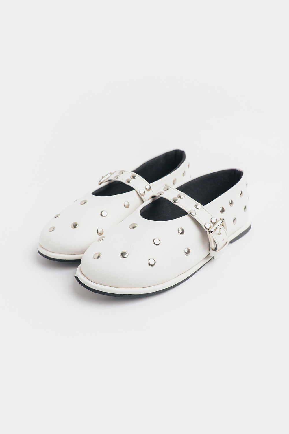 Channel edgy innocence with these striking white pumps. The classic rounded-toe silhouette is given a rebellious makeover with all-over silver-toned stud embellishments. The single strap across the arch features a sturdy buckle closure and is also decorated with matching silver studs. With their pristine white finish, these pumps are the perfect way to add a playful yet daring element to your casual or dressy looks.