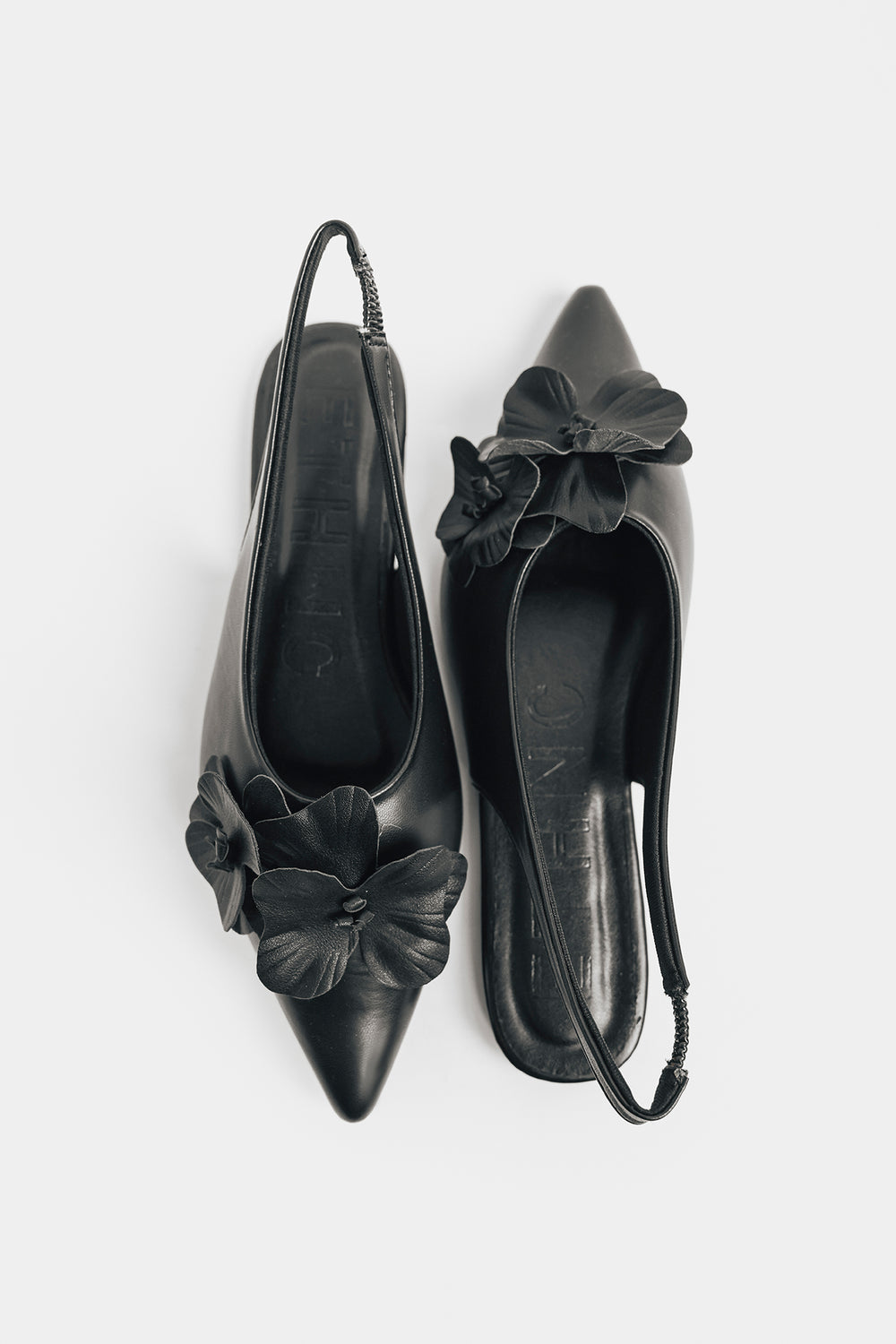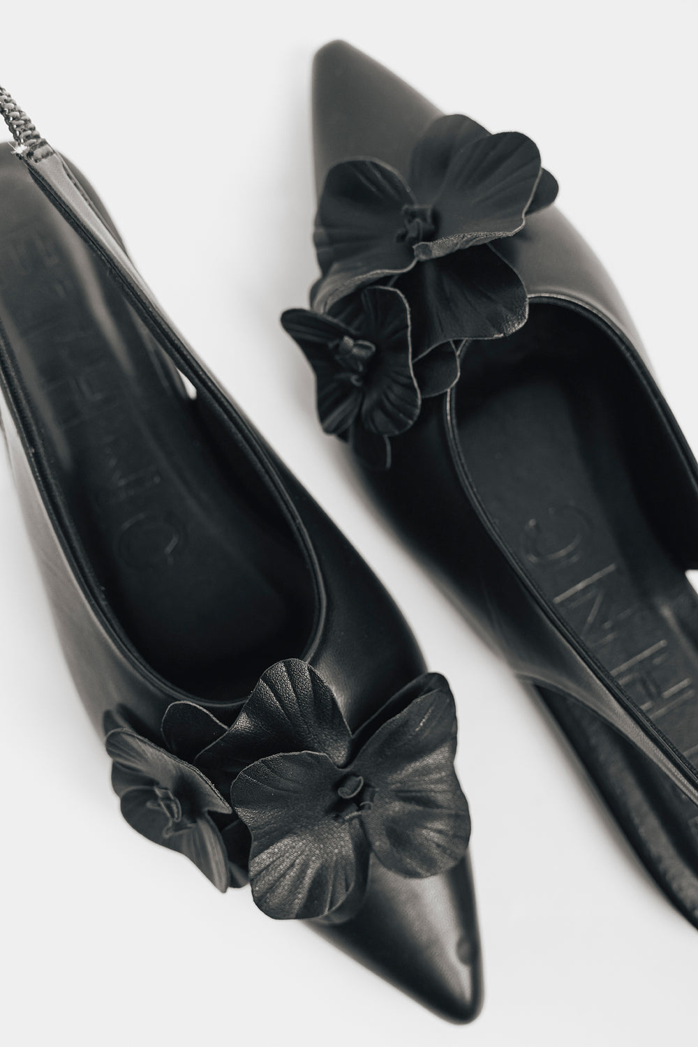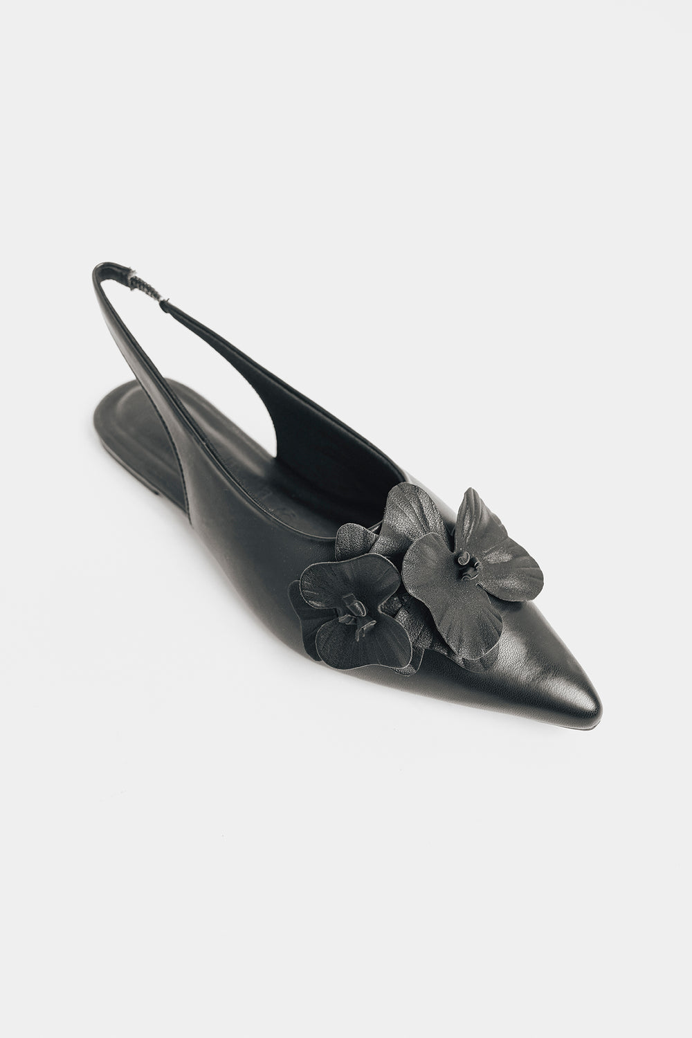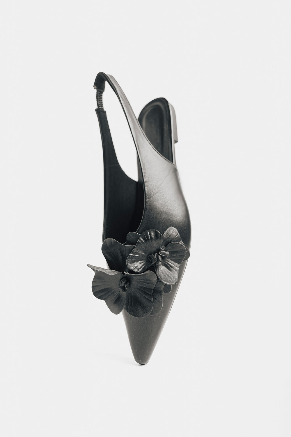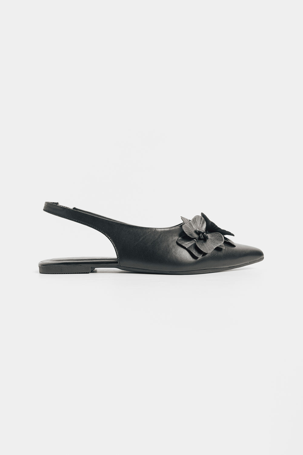 Make a striking impression with these black pointed sling back pumps, featuring exquisite 3D floral embellishments along the side. The sleek black finish provides versatile sophistication, while the pointed toe creates an elongated silhouette that complements any ensemble. The dimensional flower detailing introduces artistic texture and visual interest, elevating these pumps beyond everyday wear. The secure sling back design ensures stability and all-day comfort.