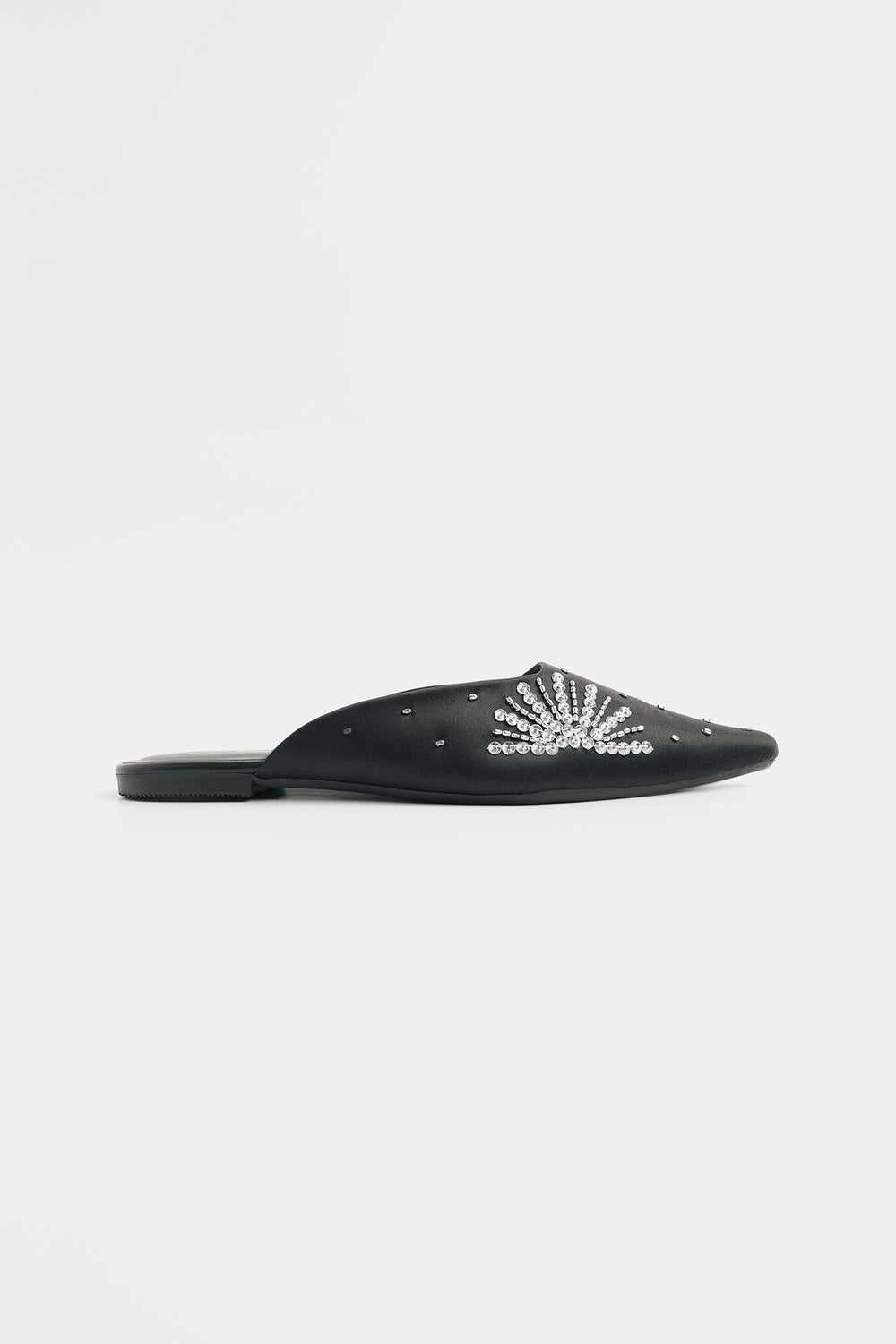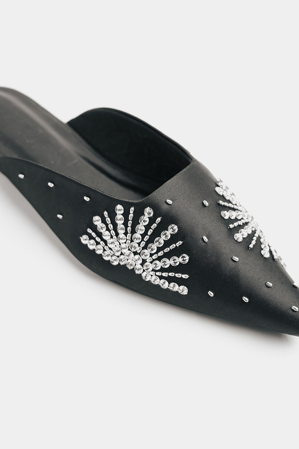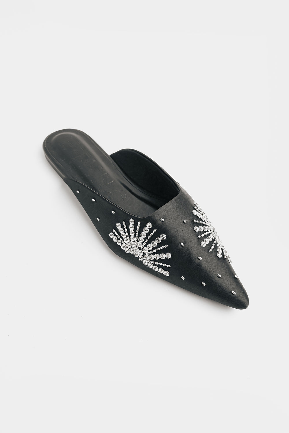 These black pointed-toe Sleek mules are embellished with Diamantes and contemporary design. They have a sharp V-cut vamp that adds a modern edge. Their backless, slip-on style makes them both fashionable and easy to wear, perfect for everyday styling or a smart-casual look.