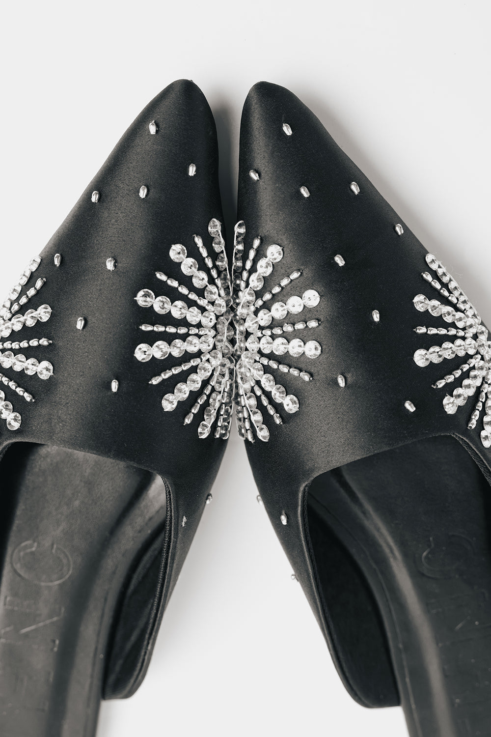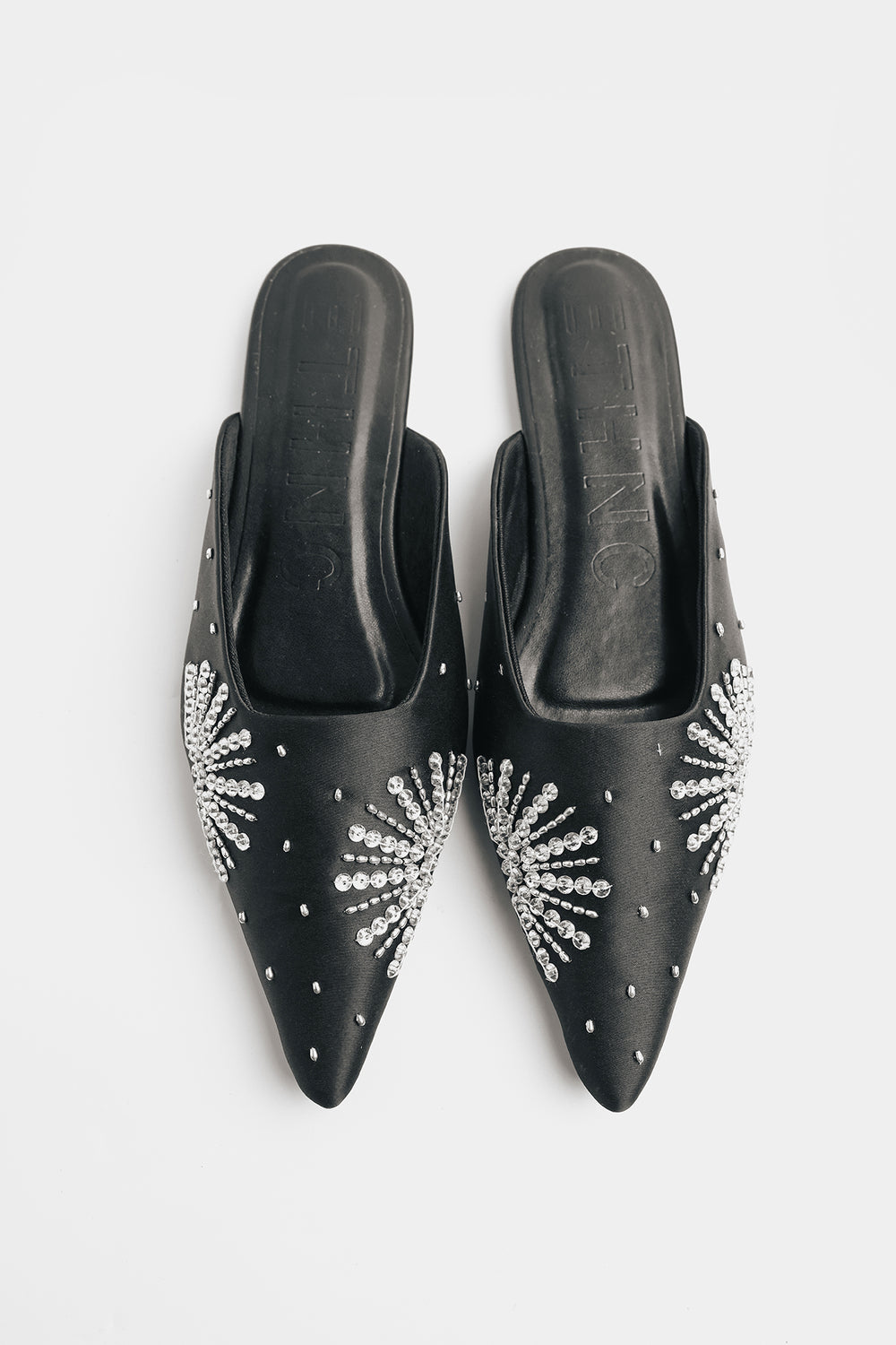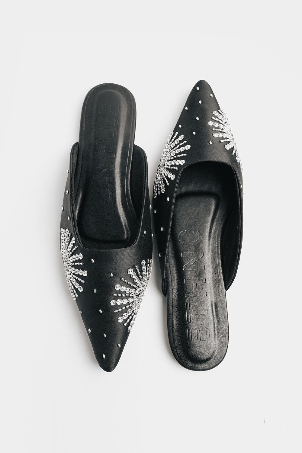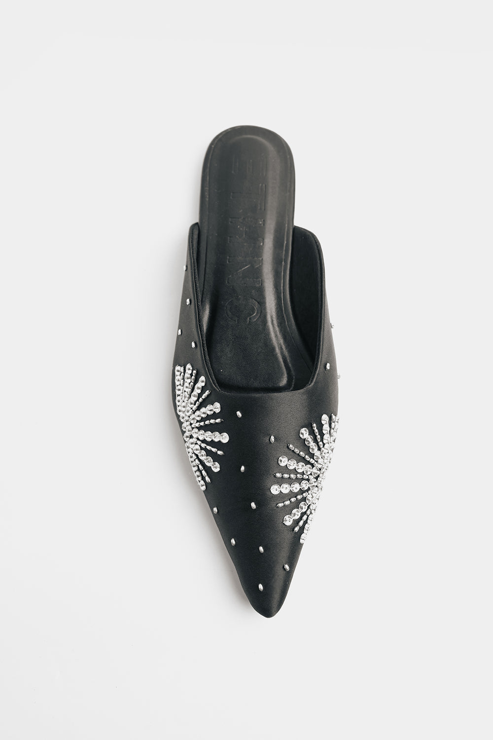 These black pointed-toe Sleek mules are embellished with Diamantes and contemporary design. They have a sharp V-cut vamp that adds a modern edge. Their backless, slip-on style makes them both fashionable and easy to wear, perfect for everyday styling or a smart-casual look.