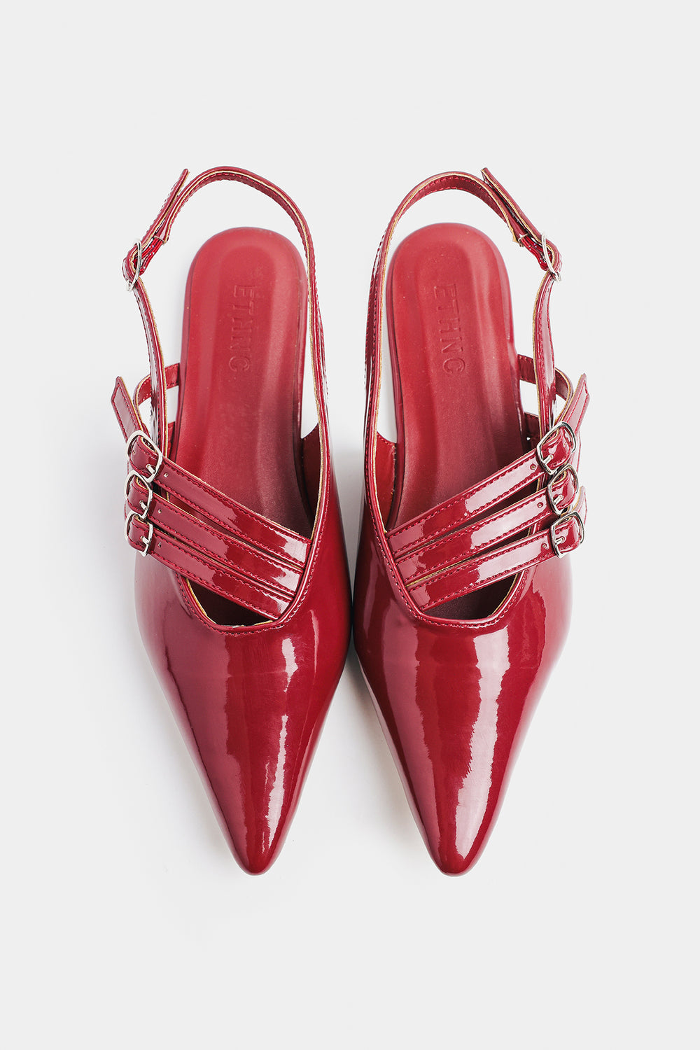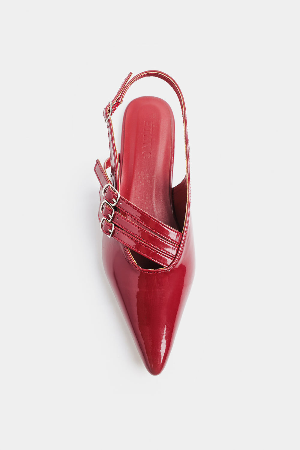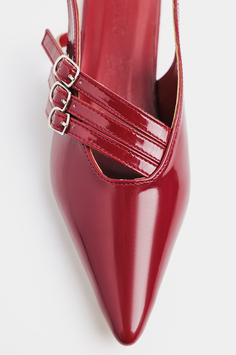 Make a glamorous statement with these striking red patent slingback pumps. The rich, deep cherry-red color and high-shine patent finish give this shoe an undeniable aura of boldness and sophistication. The design features a sharp pointed toe and an eye-catching front detail: three parallel straps with matching silver-toned buckles cross elegantly over the vamp. Complemented by an adjustable slingback for a secure fit, these heels are the perfect blend of edgy hardware and polished glamour, ideal for elevating any evening look.