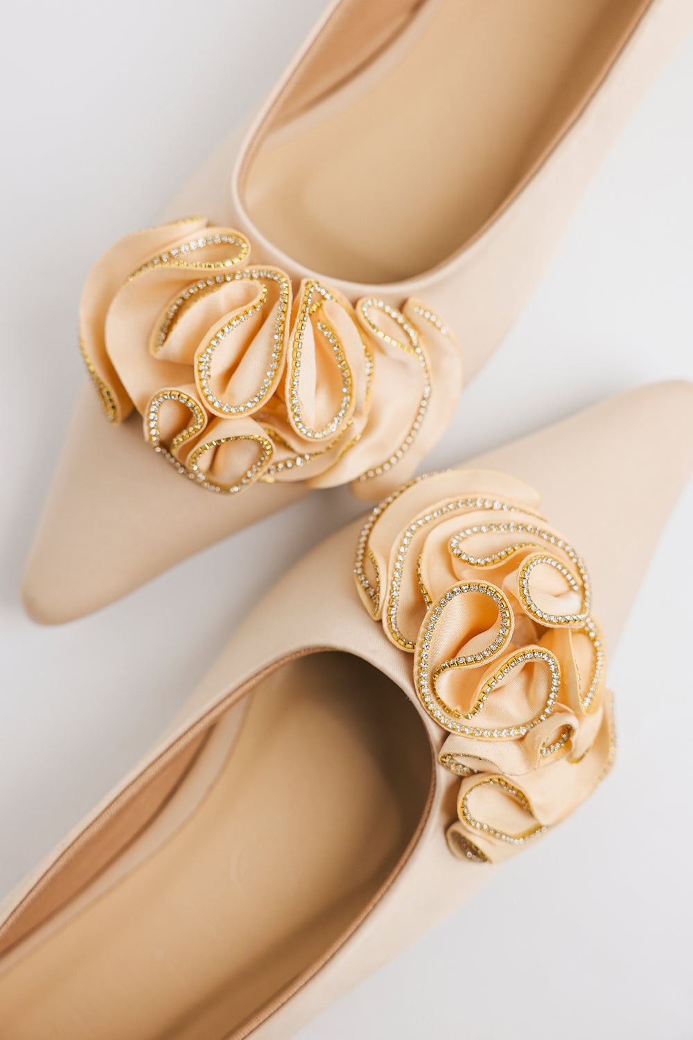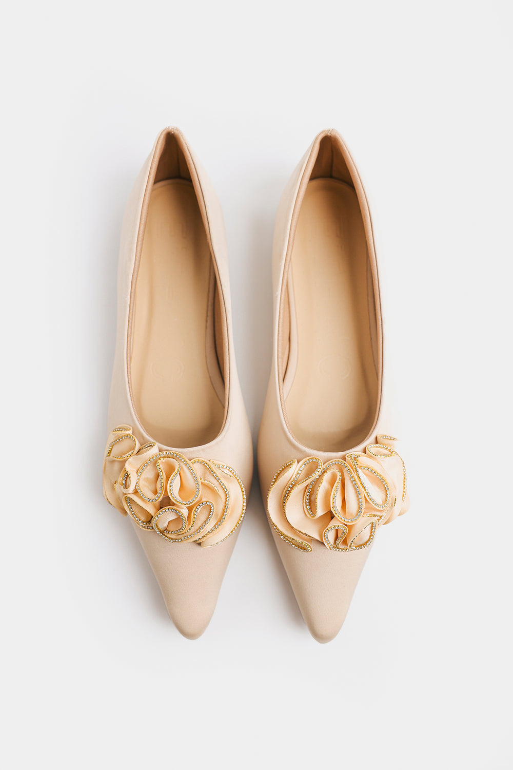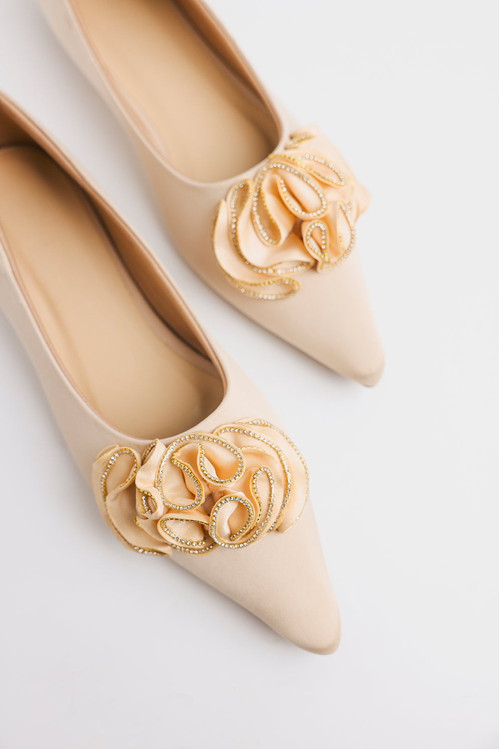 Elegance blooms with these soft and feminine floral detail pumps. These slip-on pumps feature a classic pointed-toe silhouette and are crafted from a lovely pale off-white fabric. The standout feature is the beautiful three-dimensional flower appliqué on the toe, created with soft, ruffled fabric petals. This delicate appliqué is further enhanced with fine gold bead or rhinestone outlines, adding a subtle touch of sparkle. These pumps are the perfect choice for dressing up any ensemble with refined charm and grace.