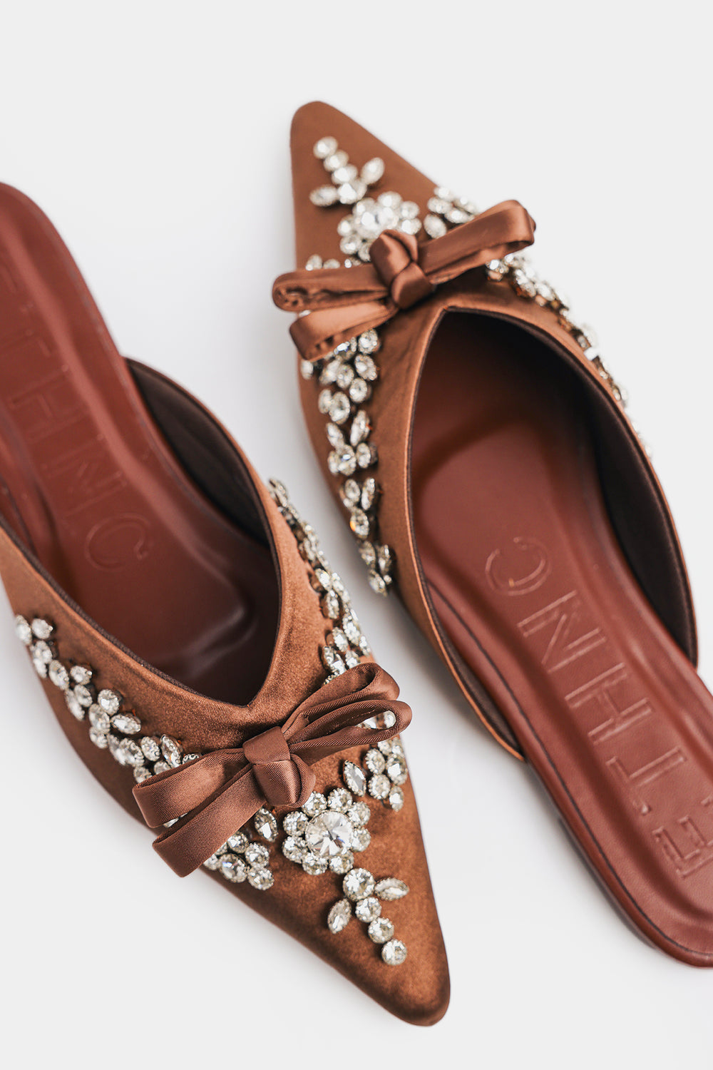 Make a striking statement with these sophisticated backless mules, featuring a sharp pointed-toe silhouette that commands attention. Crafted from luxurious copper-bronze satin with a subtle metallic sheen, the upper catches light beautifully with every step. Exquisite crystal and rhinestone floral clusters cascade across the vamp and toe, creating an opulent focal point, while an elegant satin bow adds refined detail. The sleek, modern profile combined with intricate embellishment makes these mules ideal for evening events and upscale occasions where understated glamour meets contemporary edge.