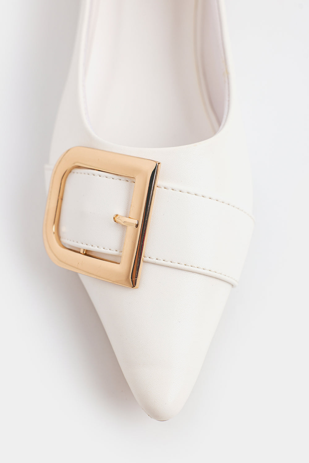 Achieve pristine sophistication with these elegant pointed pumps. The clean, white finish provides a versatile and refined look, perfect for a wedding or a polished office ensemble. The shoe's refined silhouette features a sharp pointed toe, beautifully contrasted by a bold, wide strap across the vamp. This strap is secured by an oversized, statement gold-toned buckle, which adds a contemporary and luxurious focal point. These pumps flawlessly blend classic design with modern hardware for a truly captivating finish.