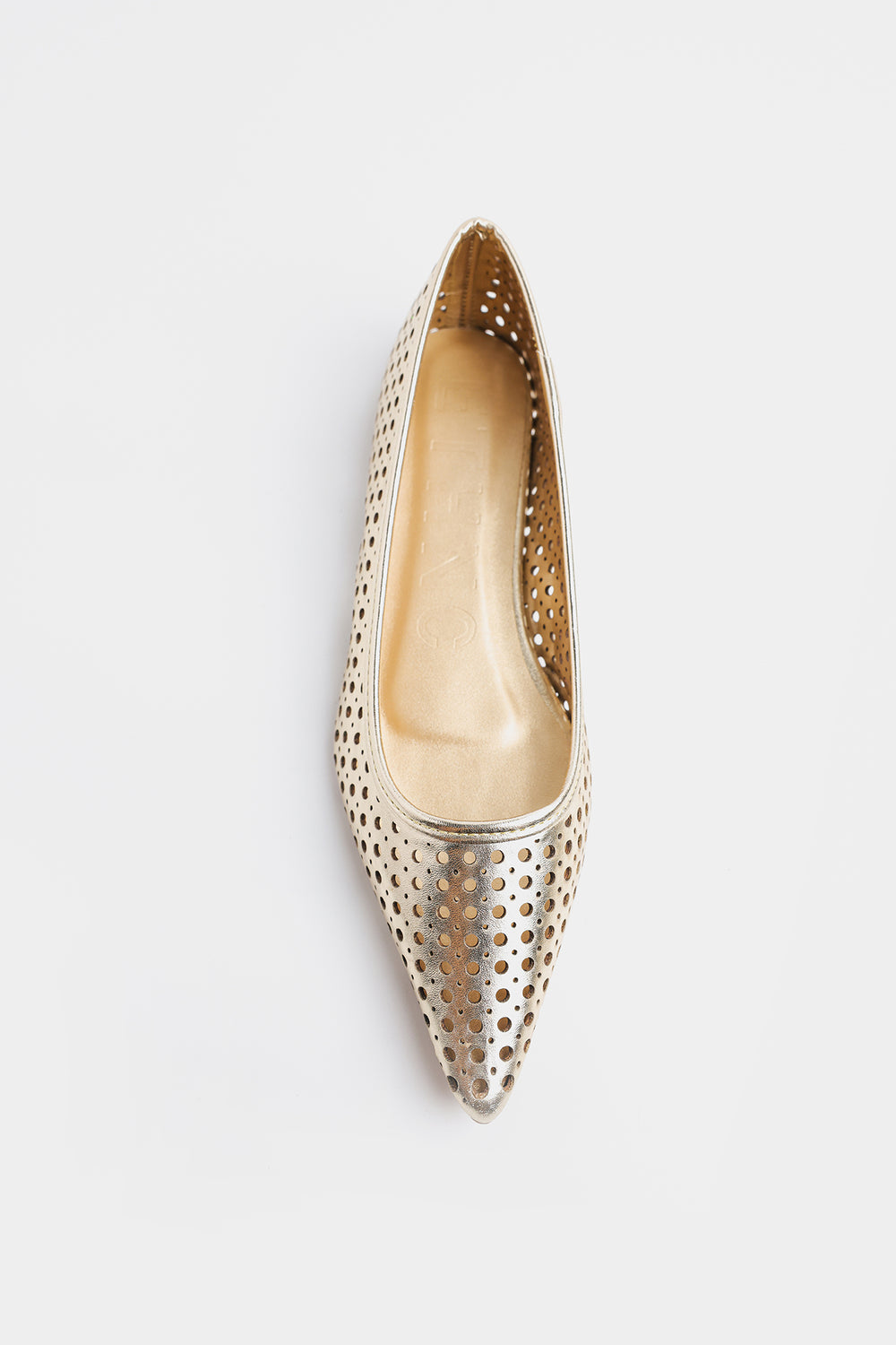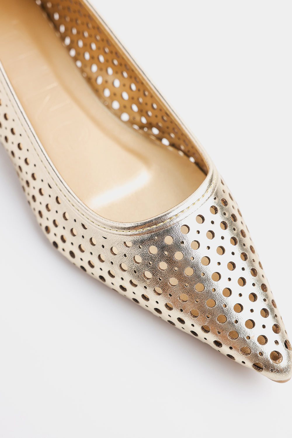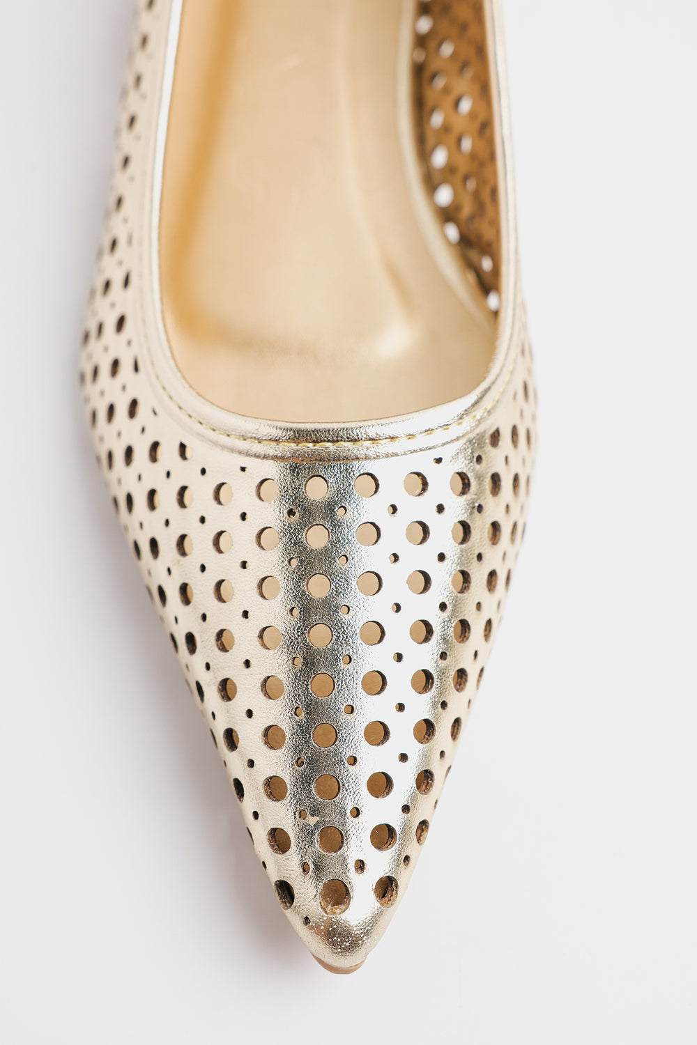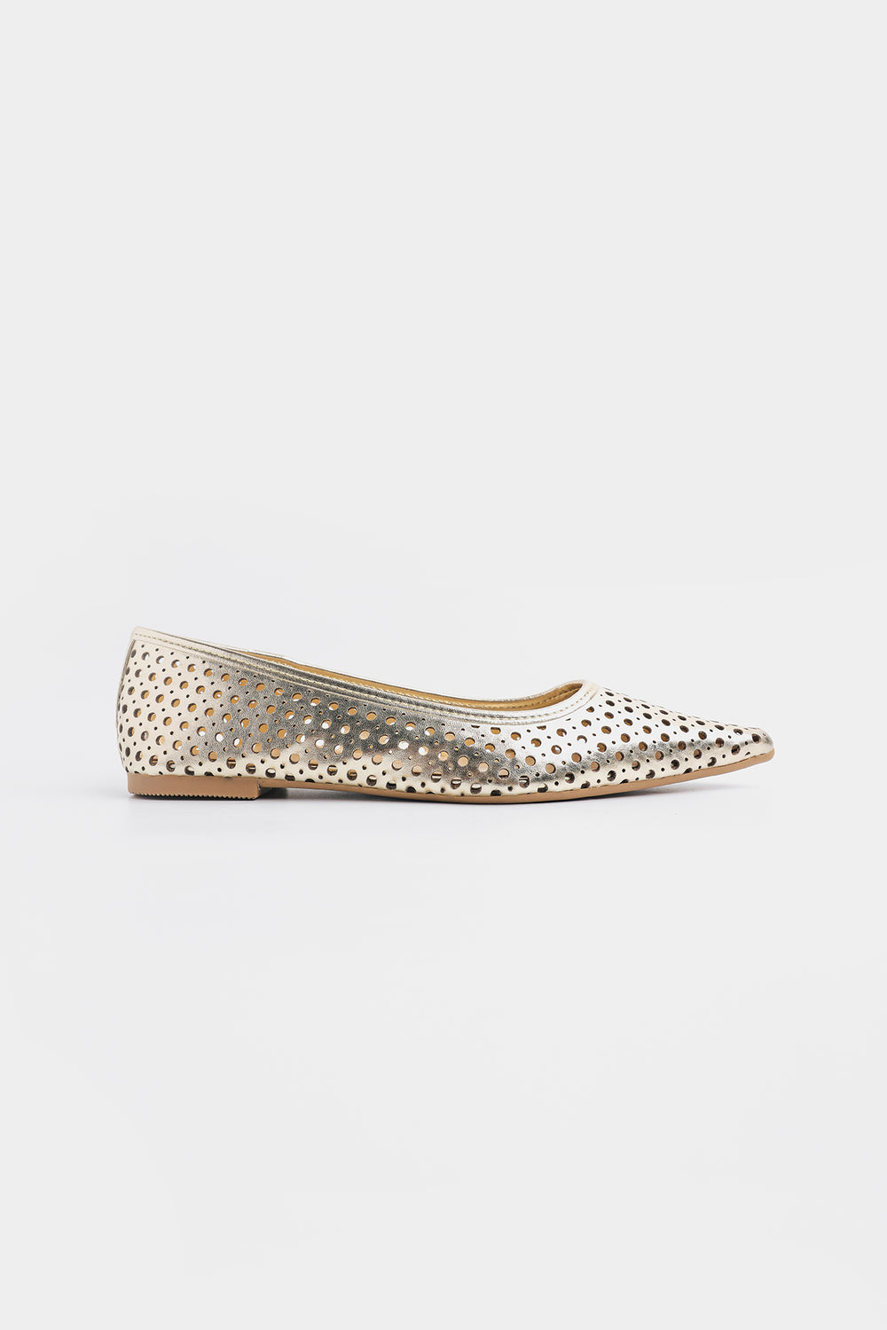 This is a stylish pointed-toe flat pump in a metallic gold finish, featuring a perforated design throughout for a chic and breathable look. The laser-cut circular holes add a contemporary, airy touch, making it ideal for both casual and semi-formal occasions. Perfect for adding a touch of glam to everyday.