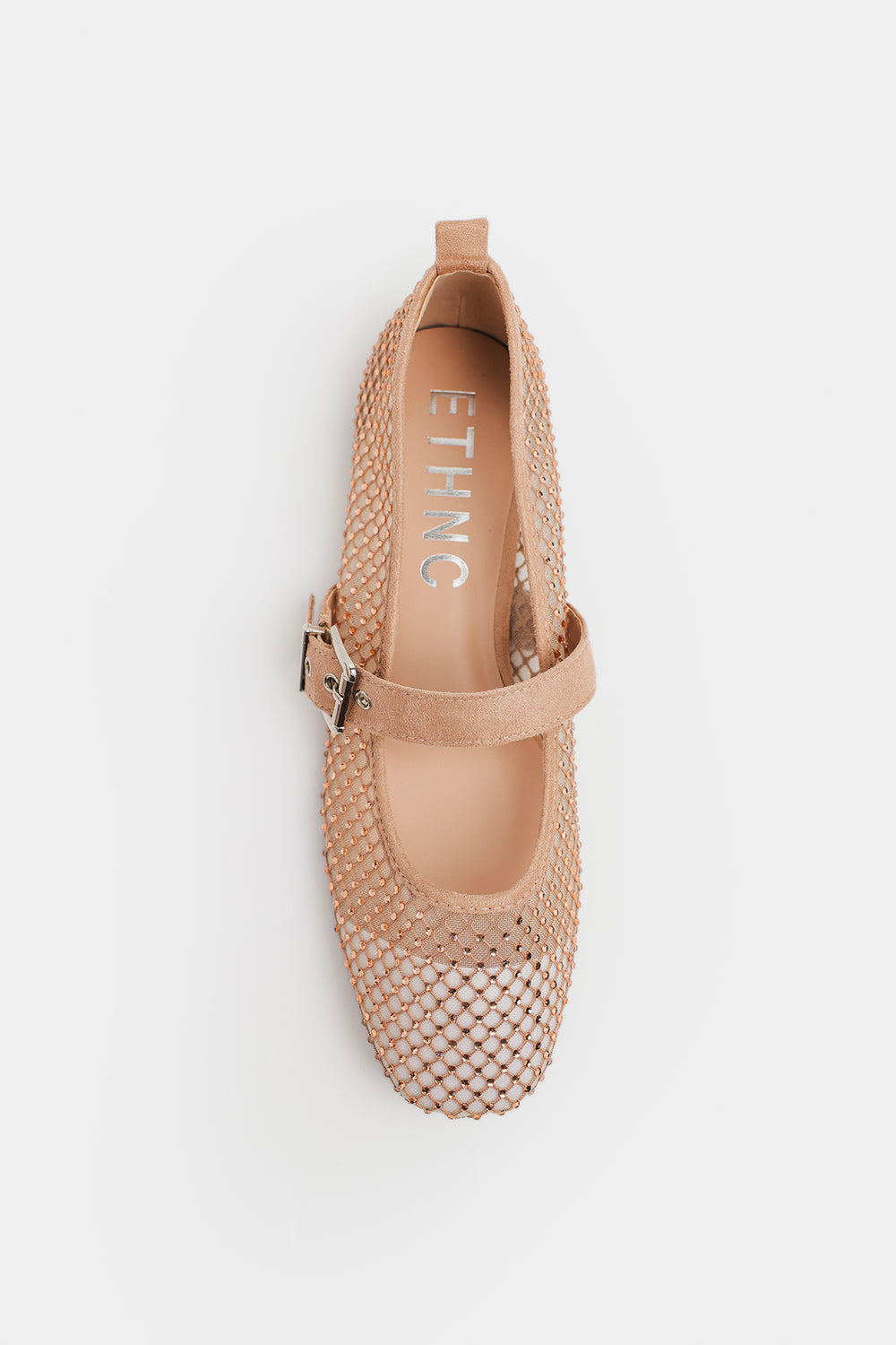 A pair of natural-colored crocheted flat shoes with a Mary Jane strap design. The shoes have a round toe and intricate circular patterns in the crocheted upper material. Each shoe has a single cream or light beige strap across the instep, fastened with a small gold-tone buckle on the side. The boots appear light and breathable, likely intended for casual or summer wear.