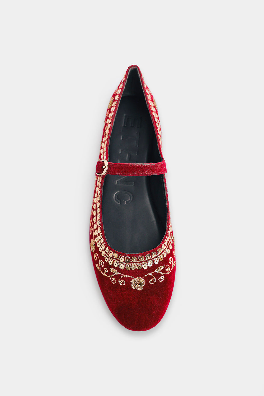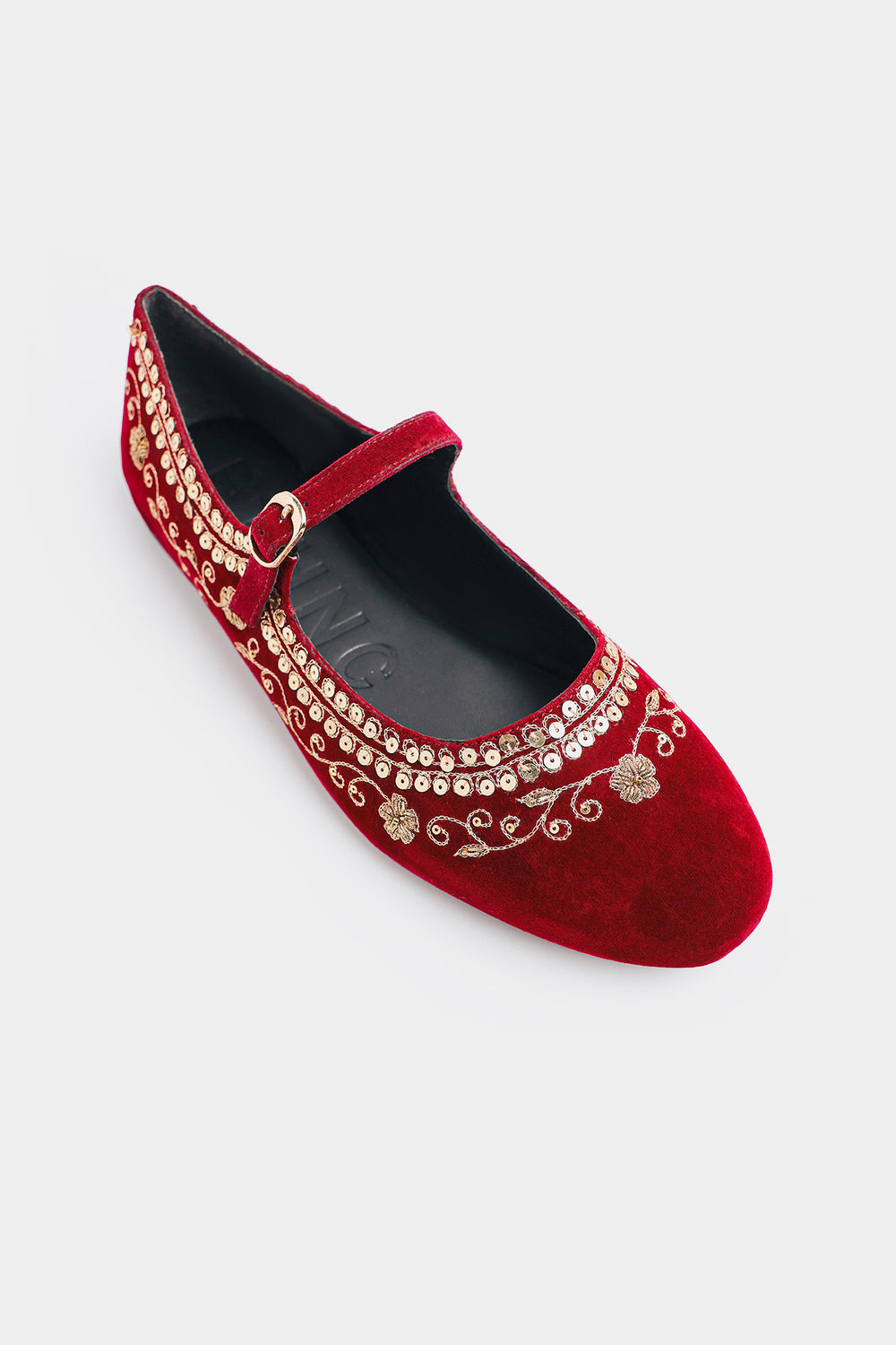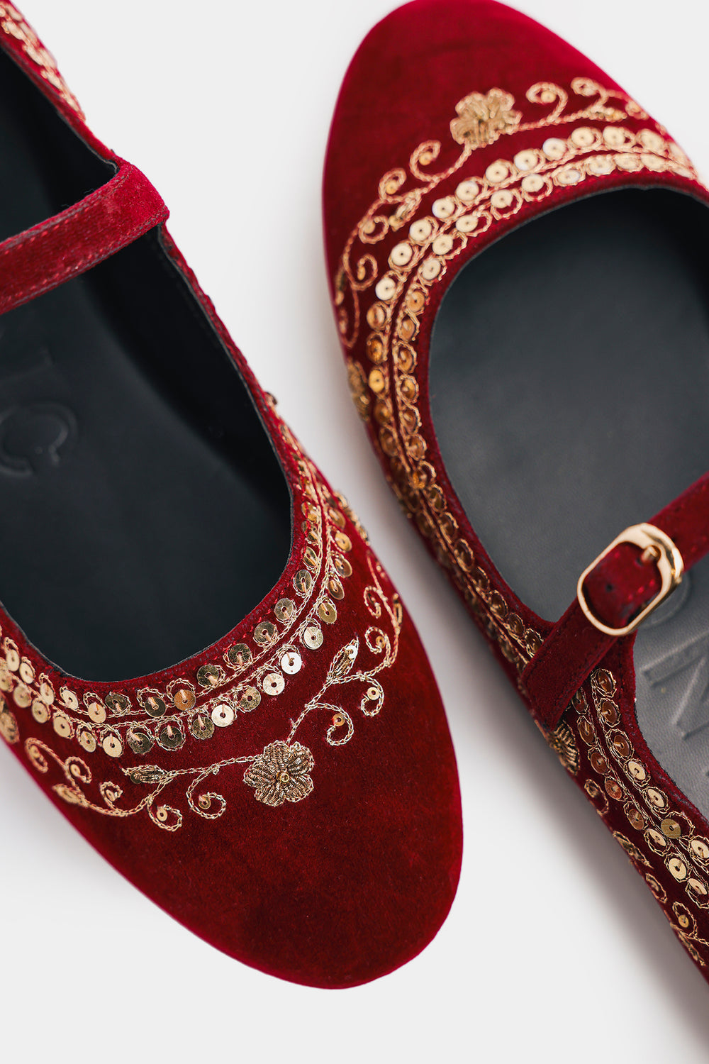 Experience the perfect fusion of heritage craftsmanship and contemporary design with these luxurious velvet pumps. The rich burgundy-red velvet upper exudes festive elegance, while intricate Zari and Tilla gold thread embroidery,, intertwined with delicate sequins creates mesmerizing floral and scroll patterns across the vamp. These pumps seamlessly blend traditional artisanal techniques with contemporary style—perfect for celebrations and special occasions.