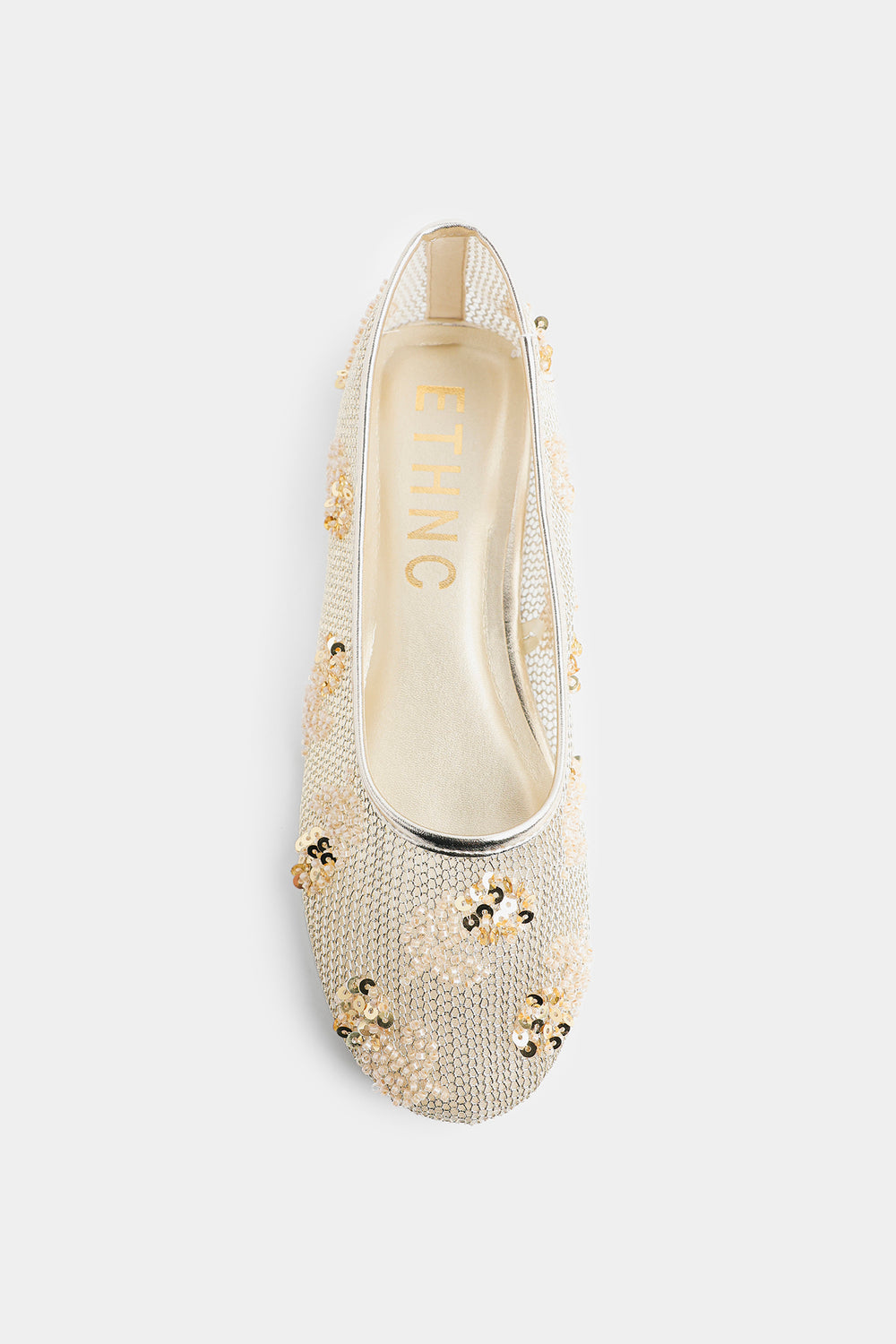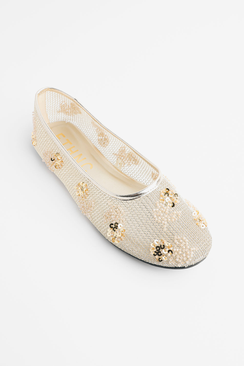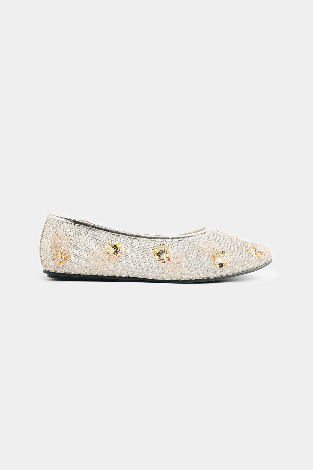 Elevate your ethnic wardrobe with these exquisite embellished pumps crafted with meticulous attention to detail. Adorned with intricate gold sequins and delicate beadwork, these traditional South Asian flats showcase stunning floral-inspired patterns that catch the light beautifully. Perfect for weddings, celebrations, or special occasions, they seamlessly transition from formal events to dressed-up casual looks. The luxurious metallic gold tones add instant glamour to any ensemble.