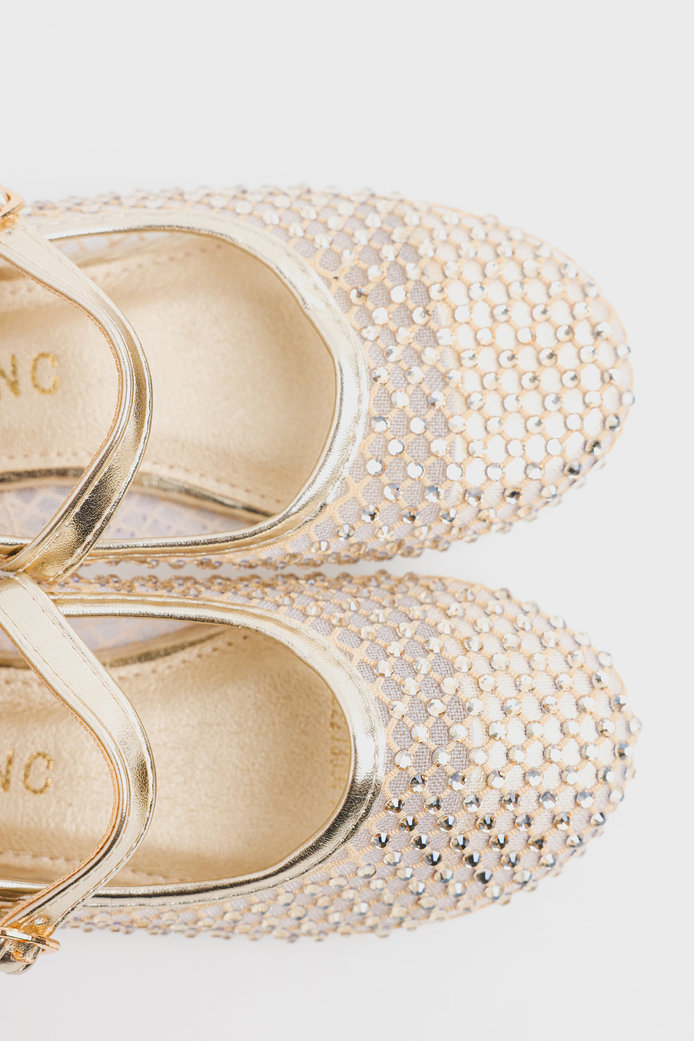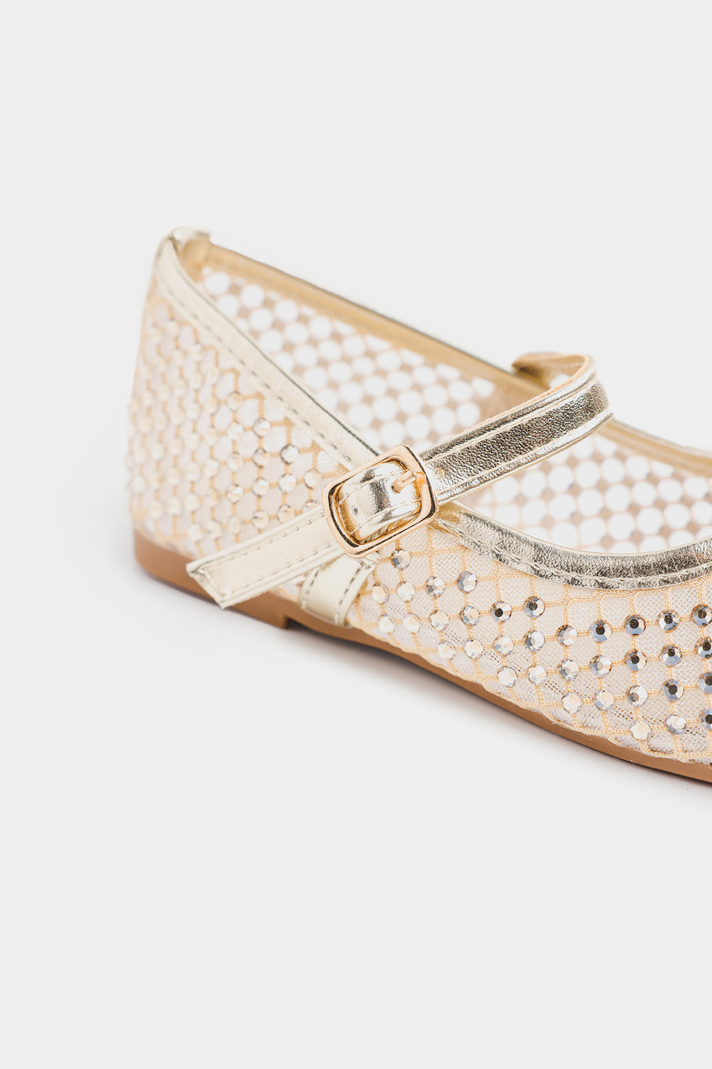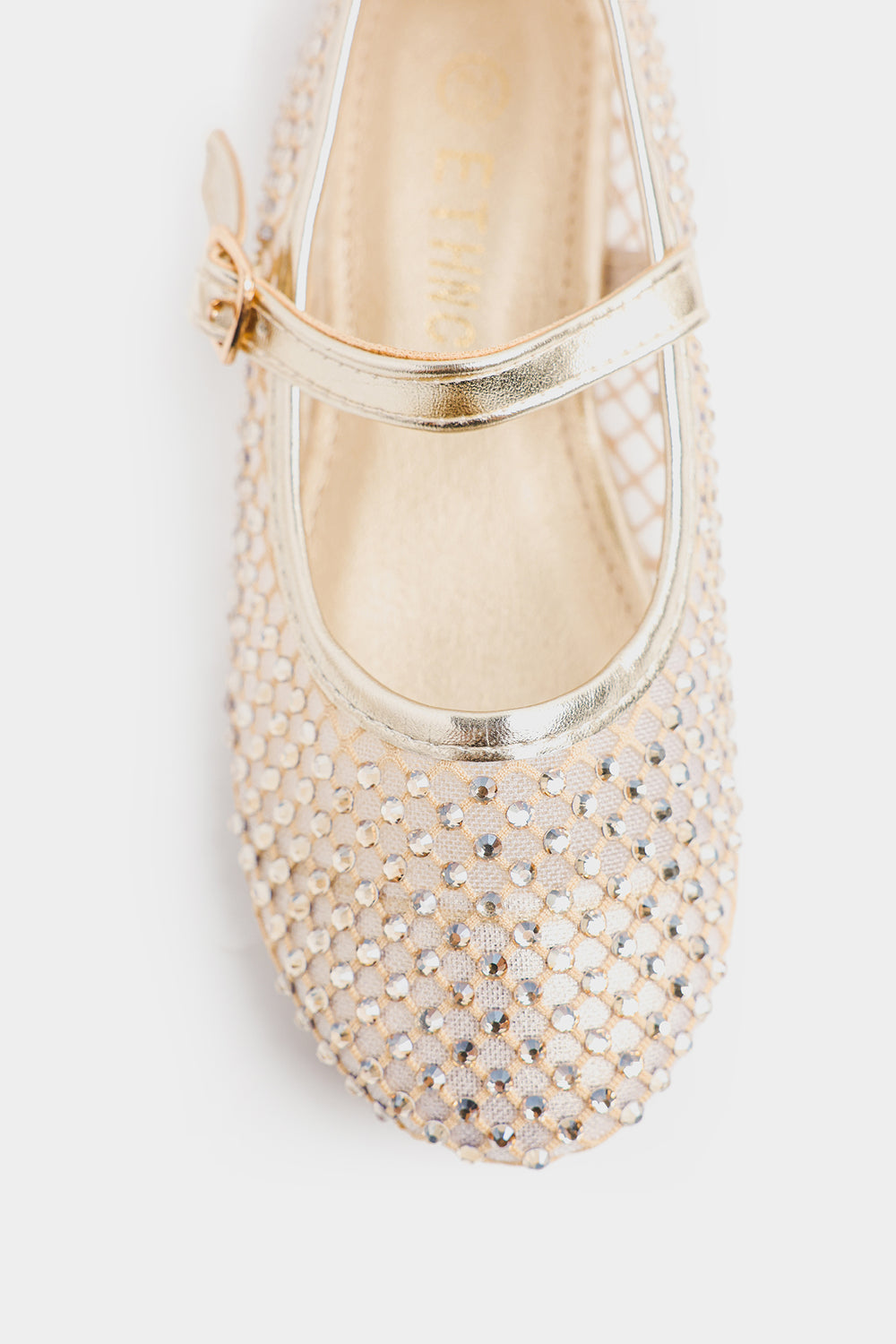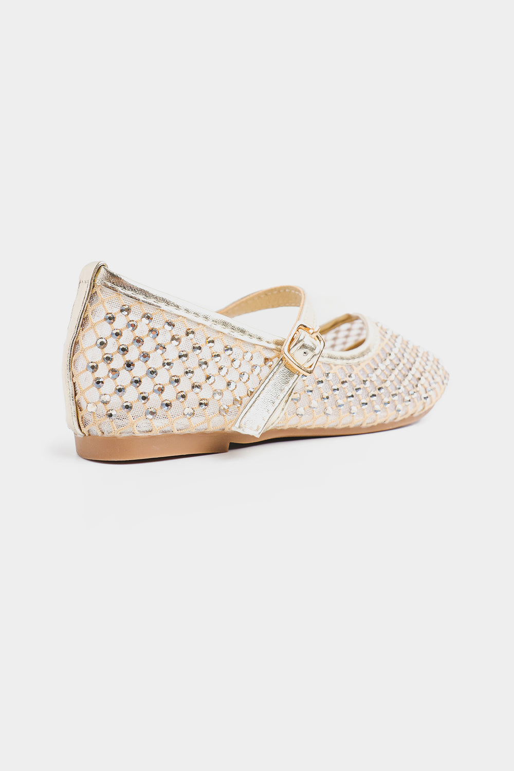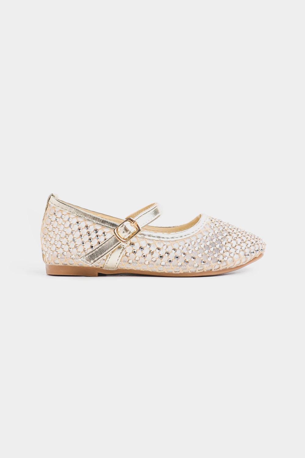 These shoes feature a closed-toe design embellished with sparkling rhinestones that add a glamorous touch. They have a glossy metallic strap with a small buckle closure for a secure fit and are cushioned for comfort. Perfect for festive occasions, parties, or special events.