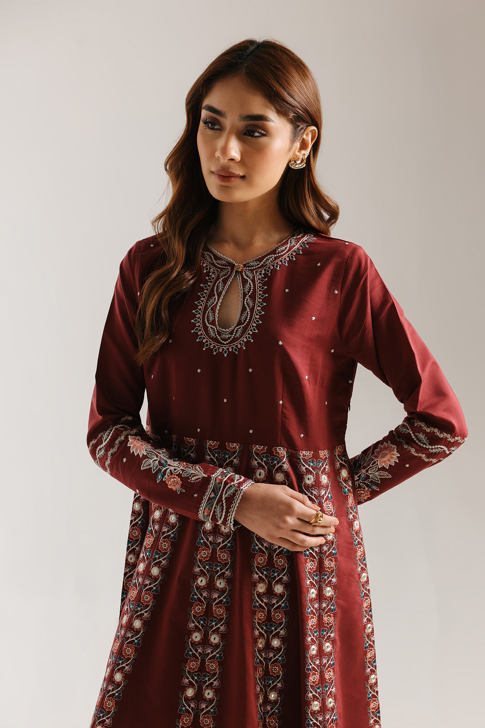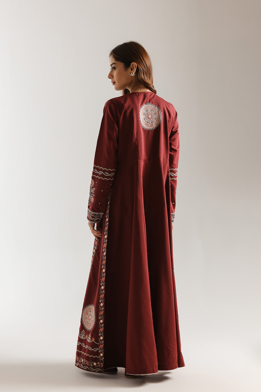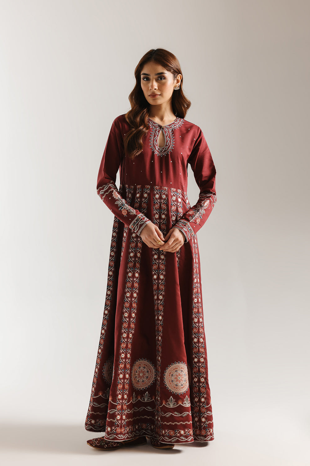 Step into a realm of timeless majesty with this breathtaking floor-length ensemble, rendered in a deep, celebratory shade of burgundy. The dress features a sophisticated neckline with a delicate keyhole opening, framed by intricate silver and sky-blue threadwork that adds a touch of modern refinement to the traditional silhouette. Tiny, shimmering accents are scattered across the bodice, catching the light like stars against a twilight sky. The true artistry of this piece lies in its structural elegance; vertical panels of dense floral and geometric embroidery flow from the waist to the hem, creating an elongated and regal frame. Large, circular mandala motifs anchor the skirt, while an elaborate border of swirling vines and scalloped patterns finishes the voluminous hemline. The slim, tapered sleeves echo this detailed craftsmanship, boasting continuous embroidery from the shoulder to the wrist. Perfect for grand festivities and formal evening celebrations, this dress offers a commanding presence that is both heritage-inspired and undeniably chic.