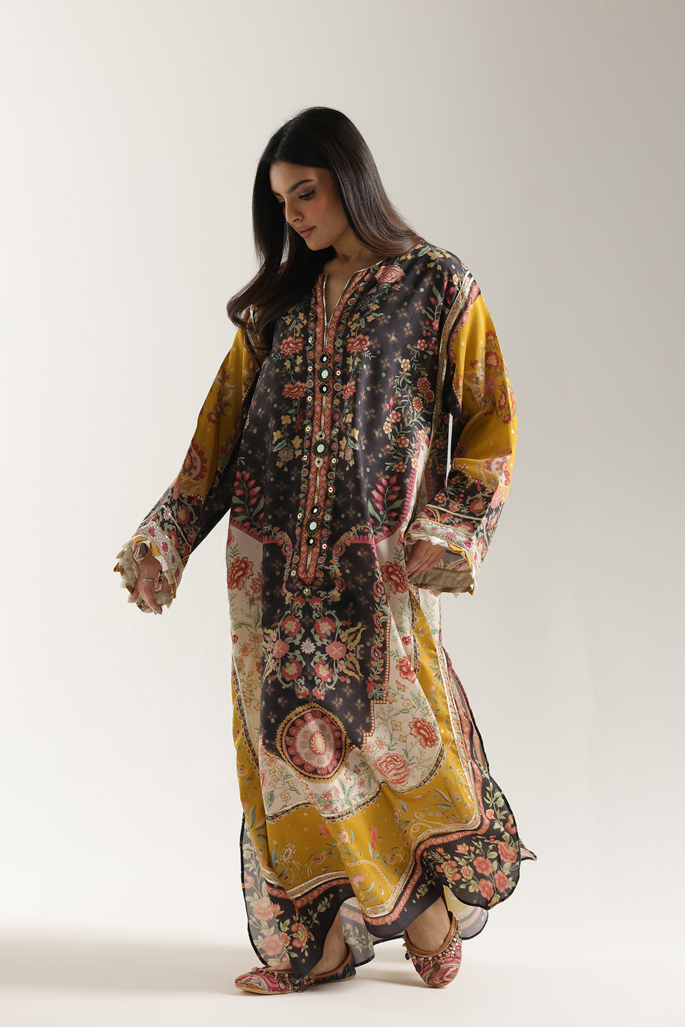 Wrap yourself in the opulent, artisanal beauty of this striking printed kaftan. This maxi-length garment is cut in a comfortable, relaxed silhouette and crafted from a soft fabric. The print features a richly detailed, multi-toned design dominated by deep charcoal and vibrant mustard yellow panels. The center panel showcases dense floral and ornamental motifs in jewel tones, contrasting beautifully with the bright yellow side panels. Finished with a chic accented front and full, flowing sleeves, this kaftan is a true statement piece that embodies dramatic color and artistic heritage.