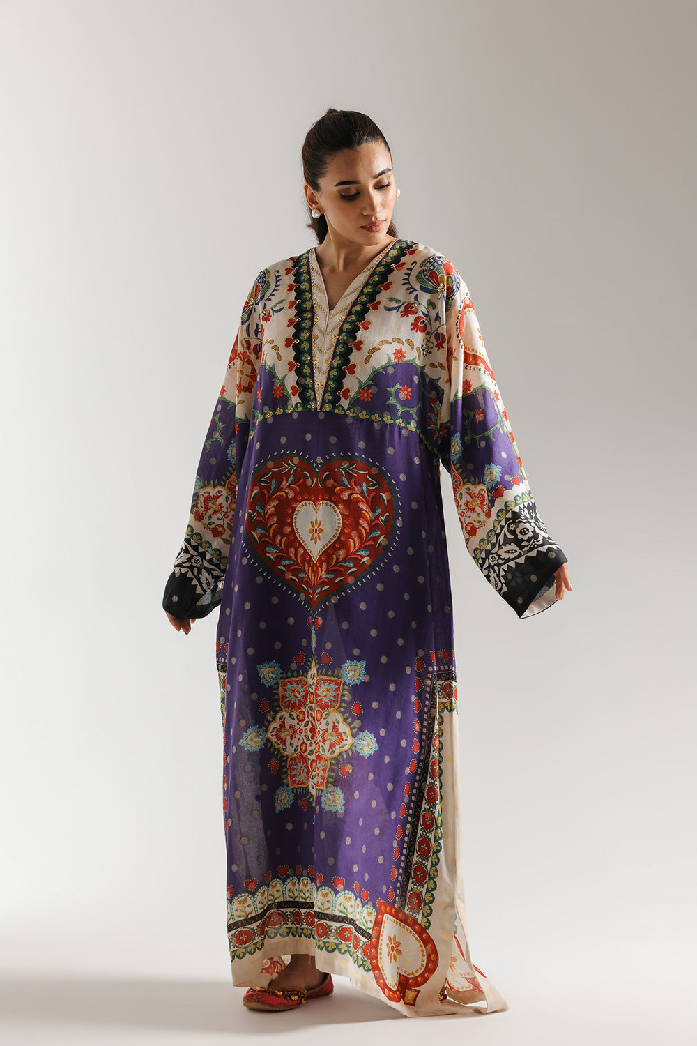 This vibrant purple kaftan blends bohemian spirit with modern luxury, featuring a striking heart-shaped central motif. The floor-length silhouette is adorned with intricate floral patterns and a contrast-trimmed V-neckline, creating a majestic, free-flowing look. It’s an artistic and captivating choice for unforgettable festive evenings.
