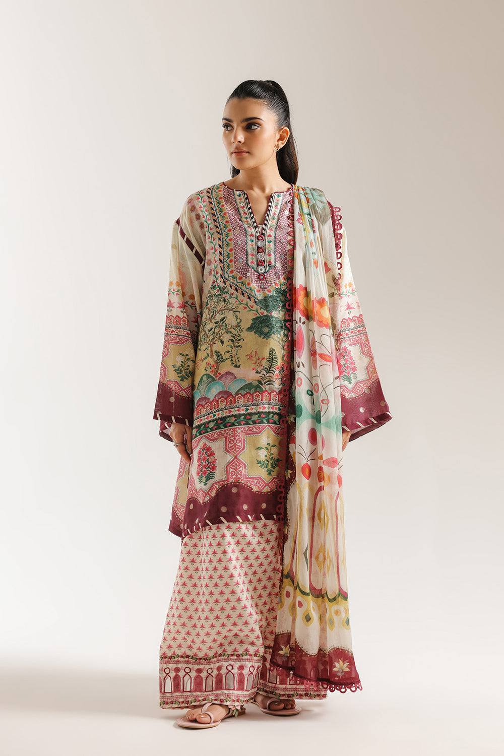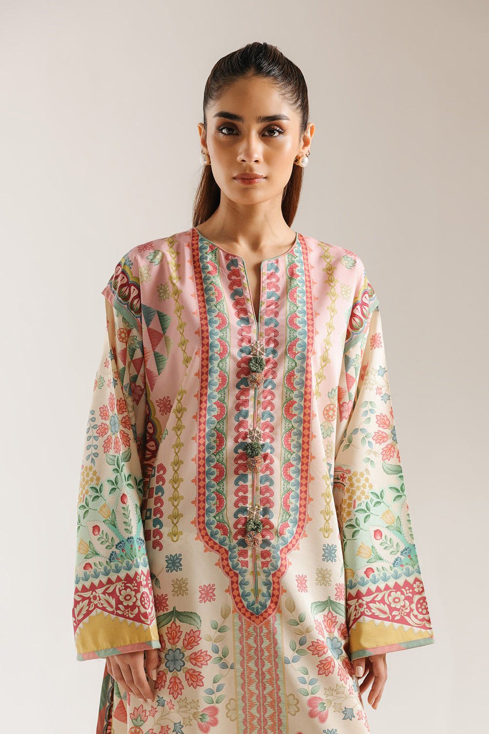 Envelop yourself in the airy romance of this pastel printed kaftan, a breathtaking fusion of comfort and high-fashion artistry. This floor-length masterpiece features a soft mint and blush palette, adorned with a lush tapestry of blooming floral clusters and intricate geometric borders. With its wide, sweeping sleeves and a fluid silhouette that dances with every step, this kaftan is the perfect choice for an elegant garden party or a sophisticated summer evening.