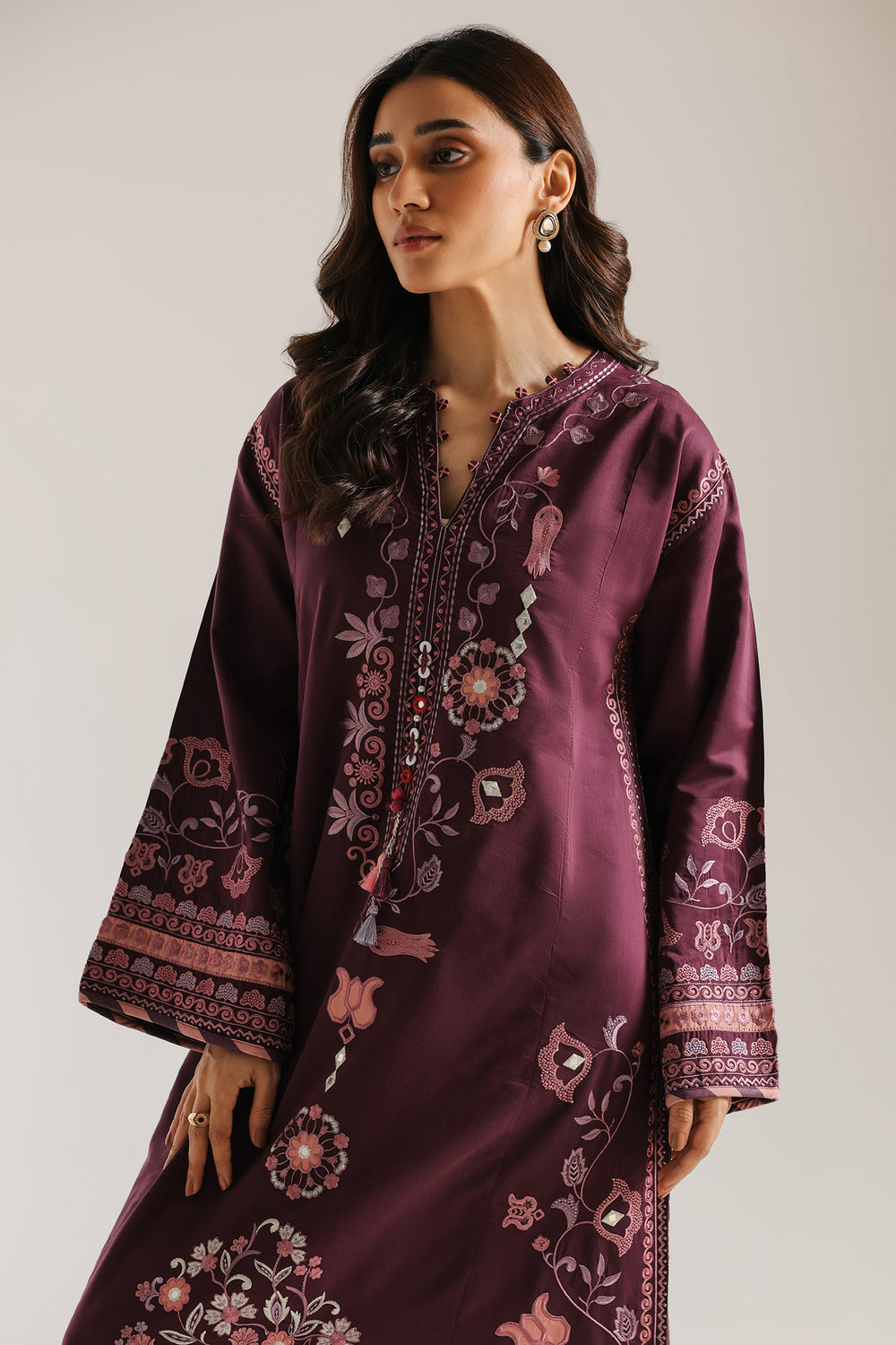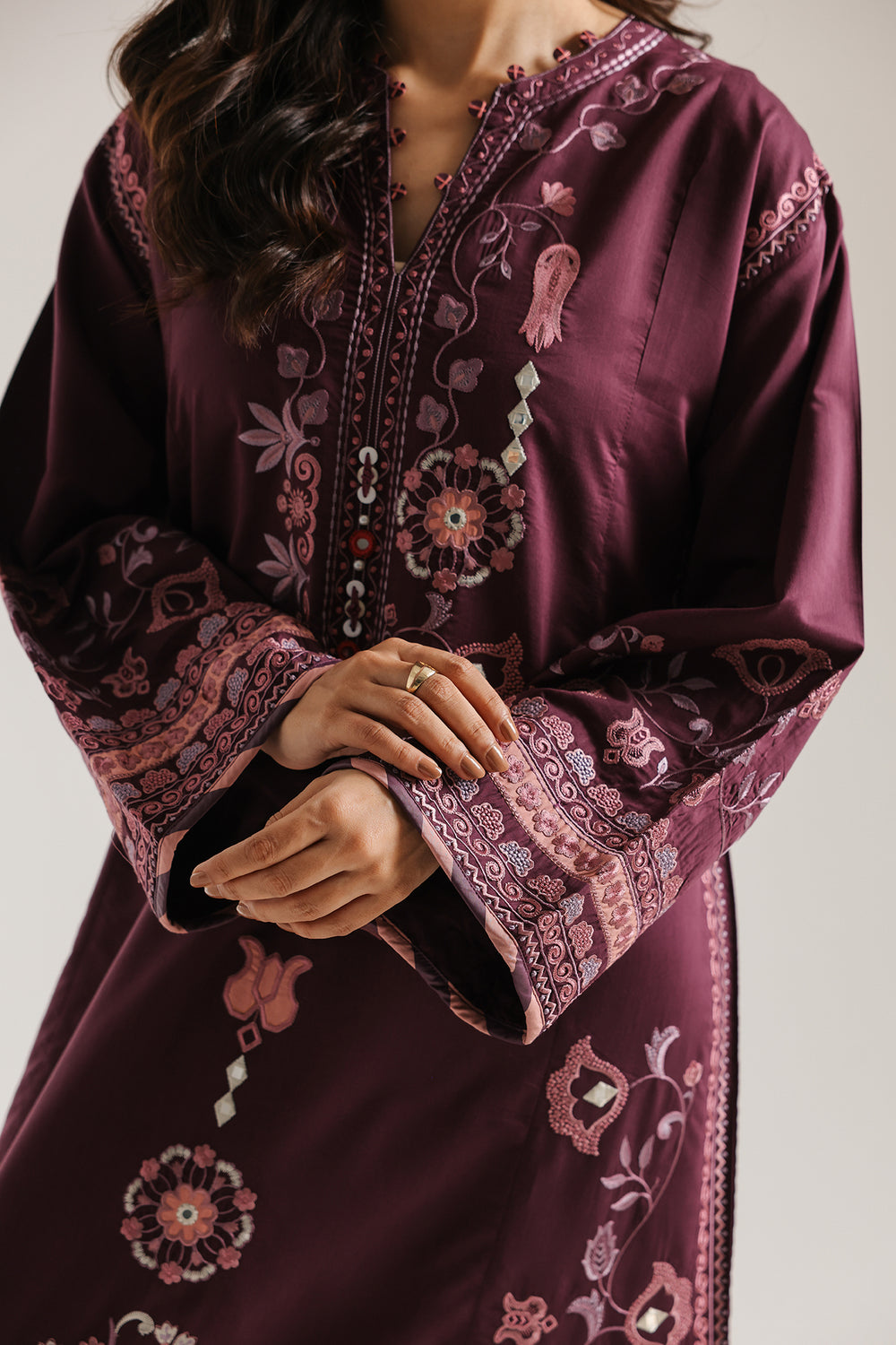 Exude effortless grace in this stunning deep plum embroidered kaftan. Adorned with intricate floral motifs and delicate threadwork along the neckline and hem, this floor-length silhouette offers a perfect blend of tradition and modern luxury. Its fluid drape ensures a flattering fit, making it an ideal choice for sophisticated evening gatherings.
