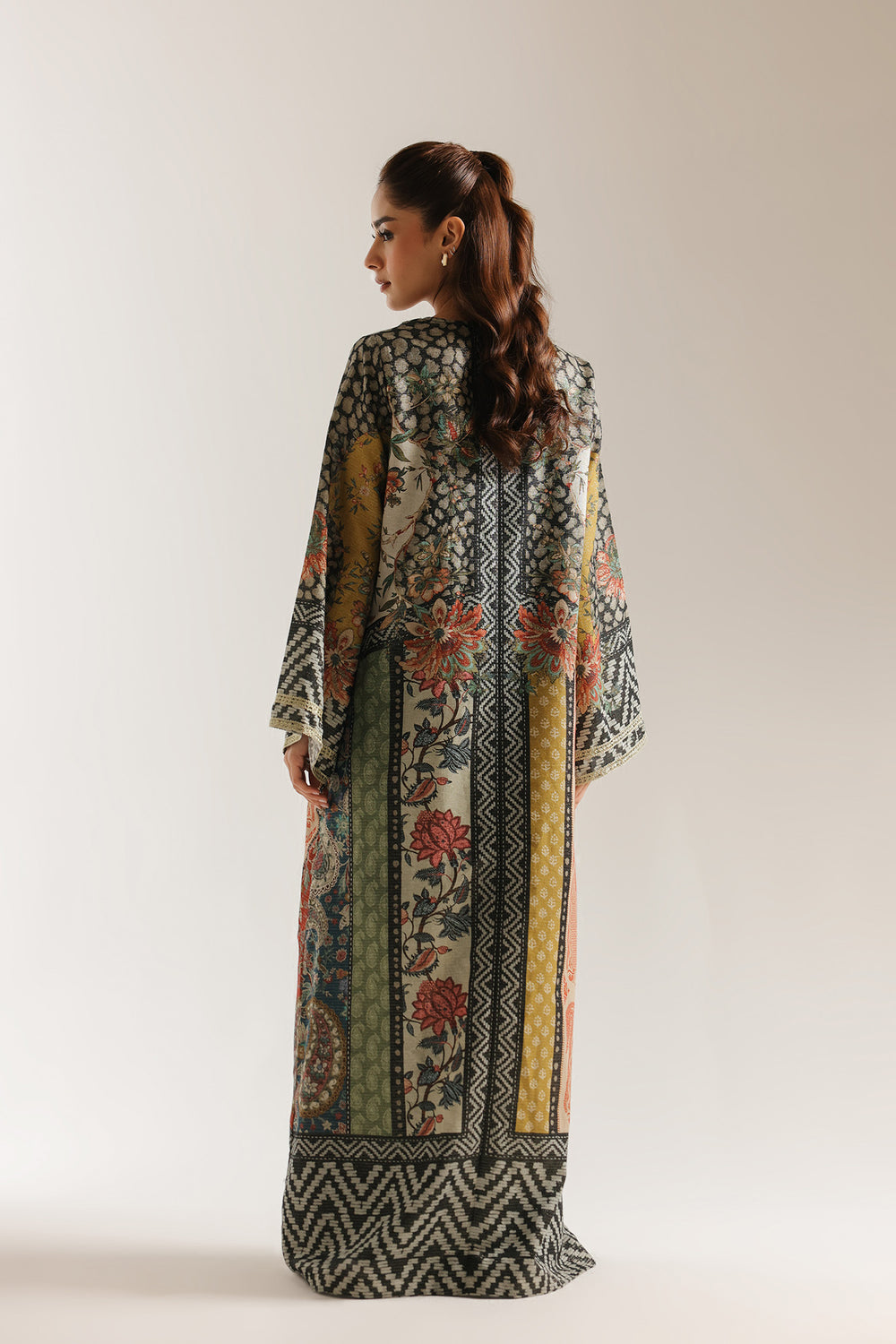 Elevate your wardrobe with this exquisite embroidered kimono featuring a sophisticated patchwork design that seamlessly blends floral prints in soft pinks and creams with striking geometric patterns—including bold black and white chevron details and rich mustard block prints. The relaxed, flowing silhouette is anchored by long, loose sleeves and delicate button accents down the front, creating an effortlessly luxurious aesthetic. Designed to layer beautifully over solid basics, this piece bridges traditional heritage patterns with contemporary resort-wear sensibility, making it an essential investment.