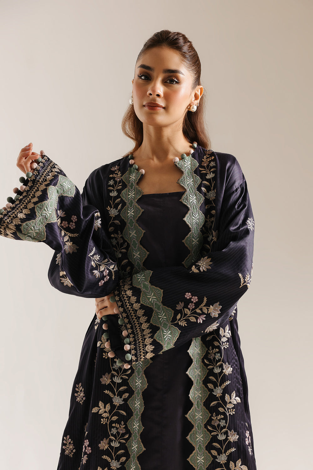 Elevate your formal wardrobe with this breathtaking ensemble, featuring a regal long kimono that serves as a masterpiece of layered artistry. The outer layer is crafted in a deep midnight navy, defined by its dramatic open front and exquisite scalloped mint-green borders that frame the entire silhouette. Cascading floral embroidery in muted silver and lavender tones climbs the front panels and embellishes the cuffs, finished with playful pastel pom-poms that add a touch of whimsical texture. Beneath this ornate layer lies a sleek inner in a coordinating deep plum hue, offering a clean and modern contrast to the detailed embroidery of the kimono. The ensemble is designed to offer a majestic, elongated silhouette that flows gracefully with every step, making it the premier choice for high-profile evening events and festive celebrations.