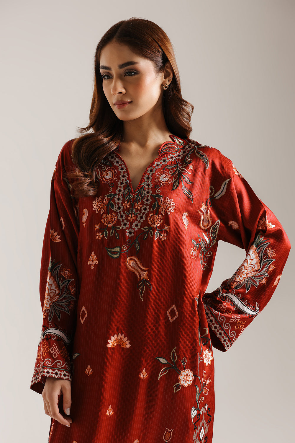 Make a bold, luxurious statement in this magnificent embroidered shirt. This ankle-length garment is crafted in a rich, vibrant rust-red fabric and is covered in elaborate traditional ornamental motifs in contrasting colors, concentrated around the hemline, neckline, and shoulders. Featuring a gentle V-neckline and full, voluminous sleeves, this shirt is a commanding piece that seamlessly blends rich color, luxurious texture, and intricate artistry.